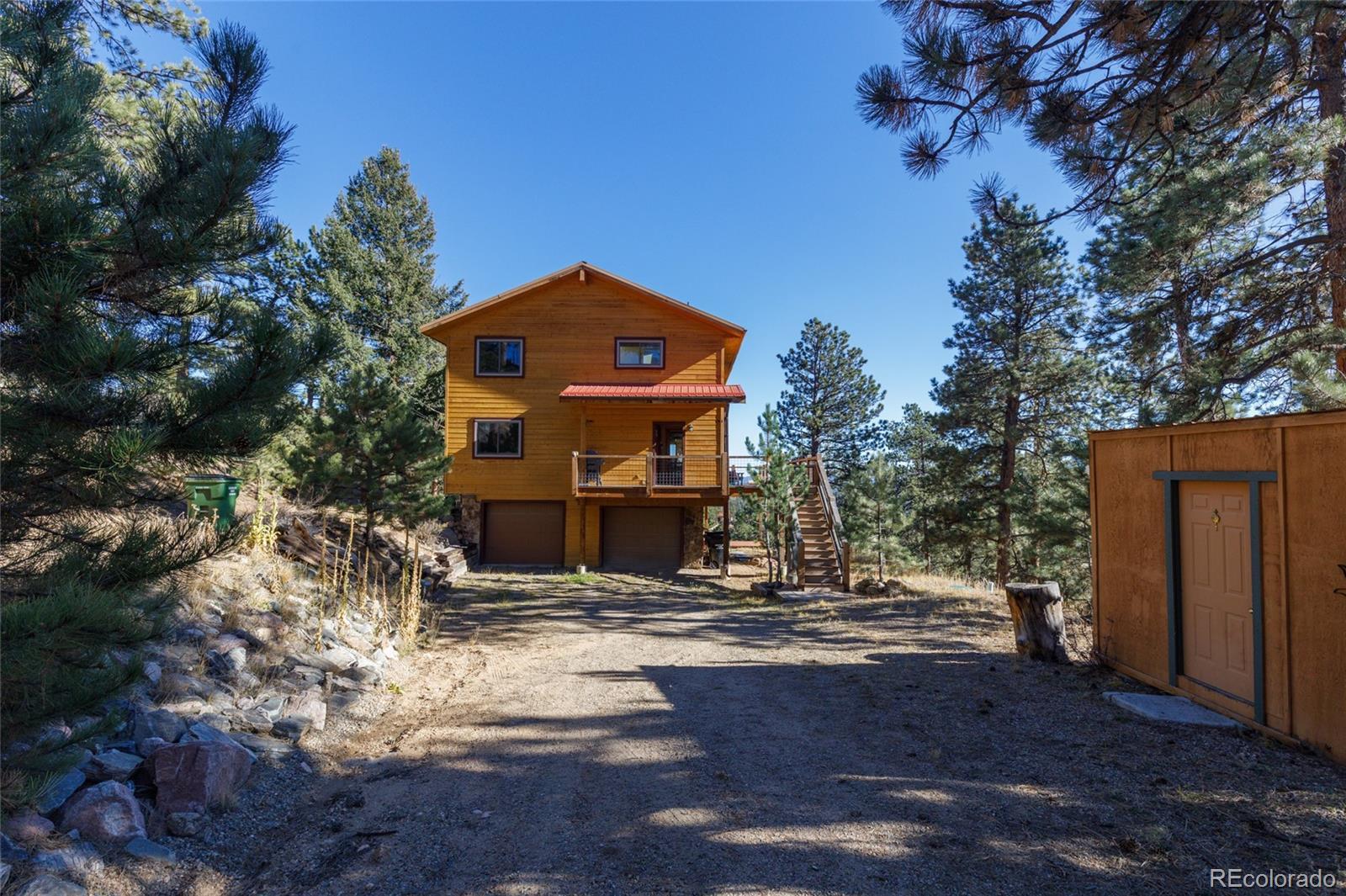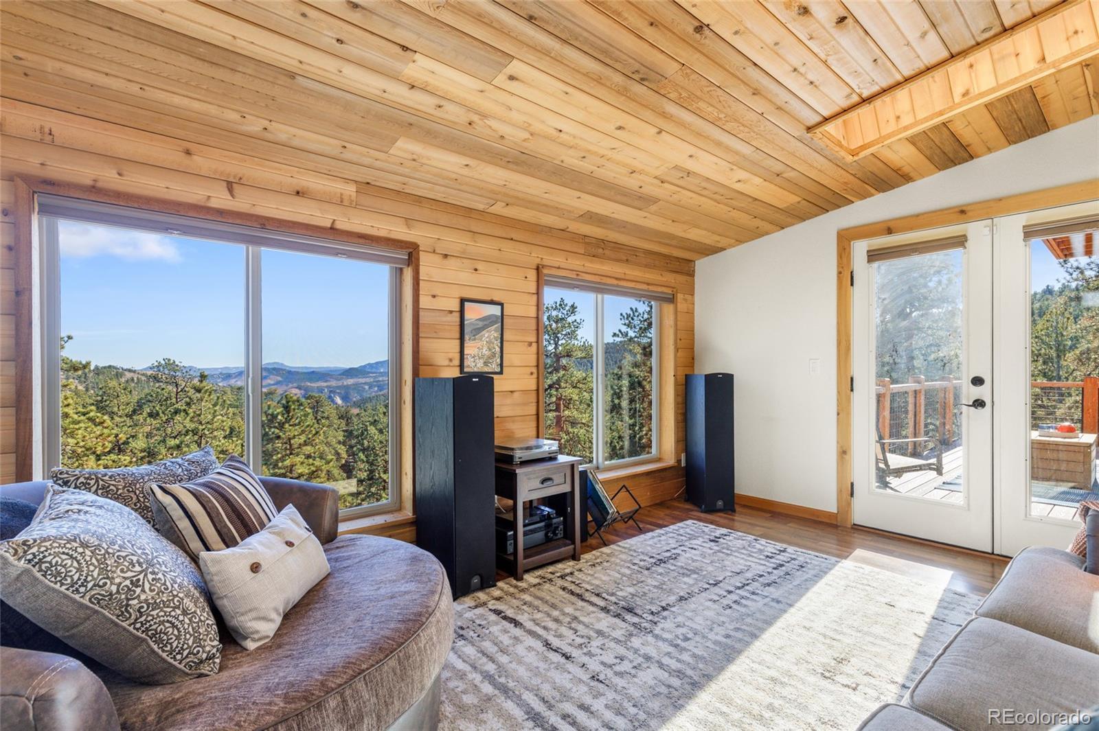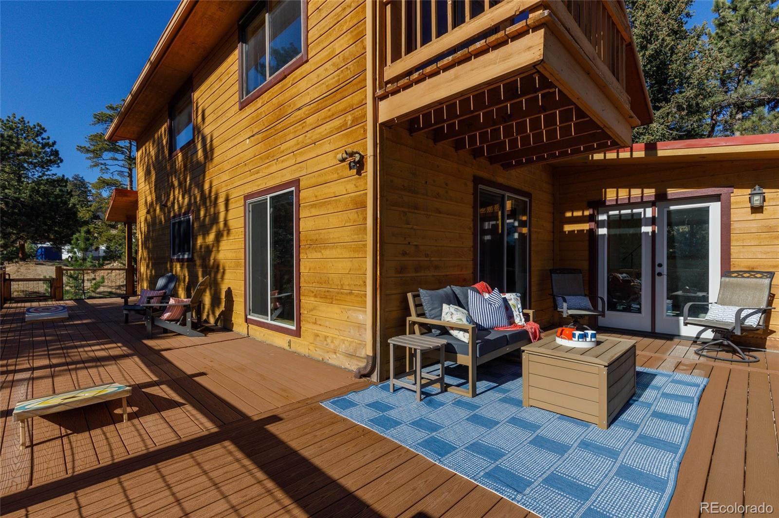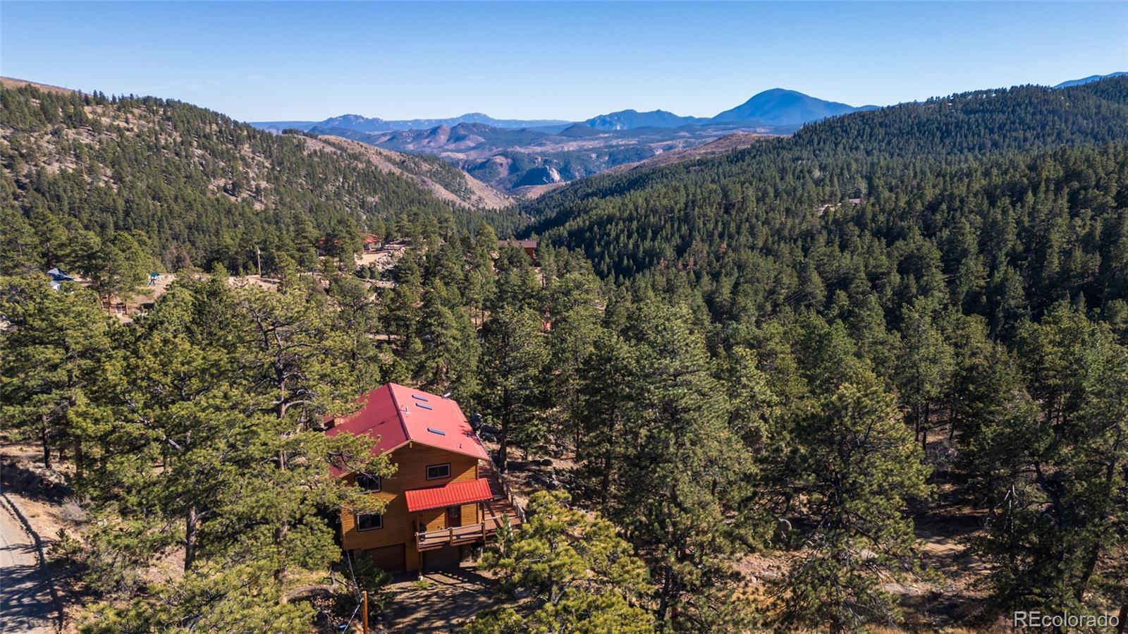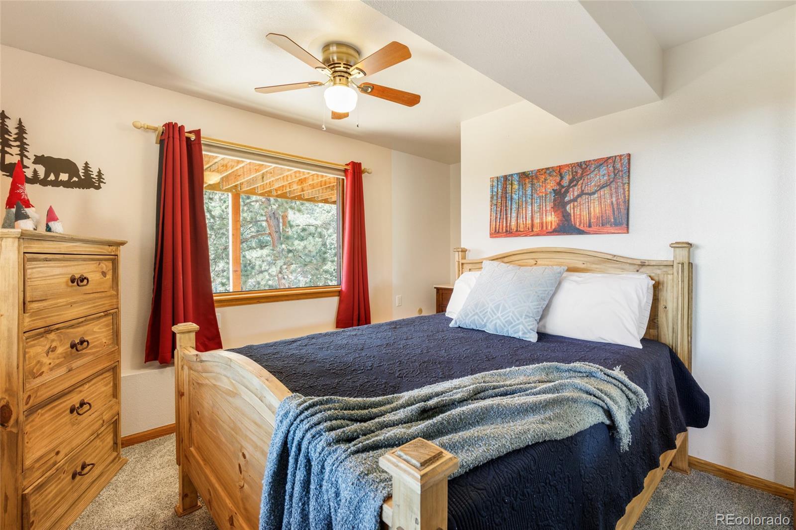 Escape to your own slice of mountain paradise! This tri-level, stunning home sits on 2 private acres surrounded by towering pines, dramatic moss-rock outcroppings & breathtaking panoramic views. Enjoy the sunrise from your upper level, private viewing platform or relax in the sunshine on the elevated expansive wrap-around Trex deck! Inside, you’ll find an open-concept floor plan w soaring ceilings & walls of windows that flood the home w natural light. The main living area features a striking moss-rock wood burning fireplace, cozy cedar-finished sunroom w skylights & double french doors that open onto the deck. The walk-out lower level offers its own living space w a pellet stove ez hot tub access & a private bedroom w sink and vanity—perfect for guests. Upstairs, the sunny loft w movie screen that overlooks the main living area & leads to the primary suite, complete w a luxurious 5 piece bath & stunning views from every window & a beautiful stained glass feature. Additional highlights include a mudroom with built-in storage spacious laundry room, low-maintenance metal roof & an attached two-car garage. This 3-bedroom, 2-bath retreat is move-in ready & fully furnished—most everything can stay! That includes quality furniture, appliances, a newer large hot tub, Starlink dish, snow blower, log splitter, tree trimmer/chainsaw/gas storage/misc yard equipment & more! voluntary hoa includes access to a private fishing pond & hiking trail to Mt Bailey! (www.burlandhomeowners.org/park) Move right in and relax—all the work has been done for you! Brand-new furnace, dishwasher & light fixtures throughout! Plus, enjoy peace of mind with major updates from the past decade, including a low-maintenance metal roof, cedar siding, Trex decking, water softener & pump, windows, septic system, water heater & stainless steel appliances! Located just a few miles off Hwy 285 & less than an hour from Denver, you’ll enjoy total tranquility with easy access to the city!