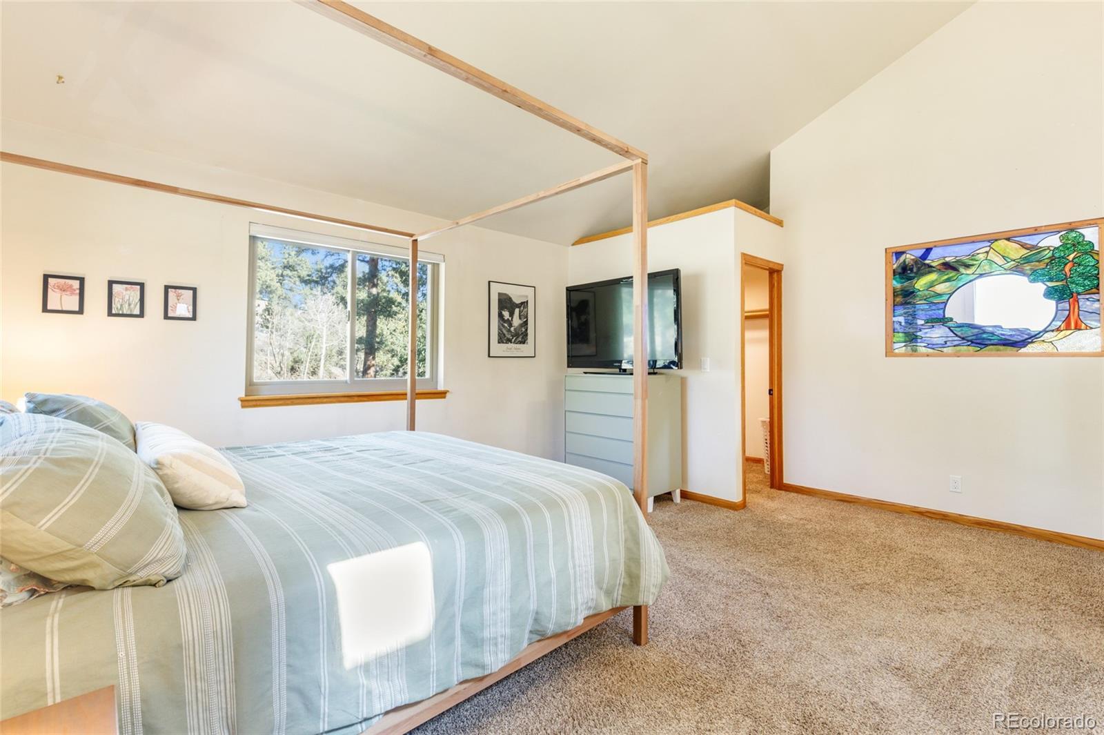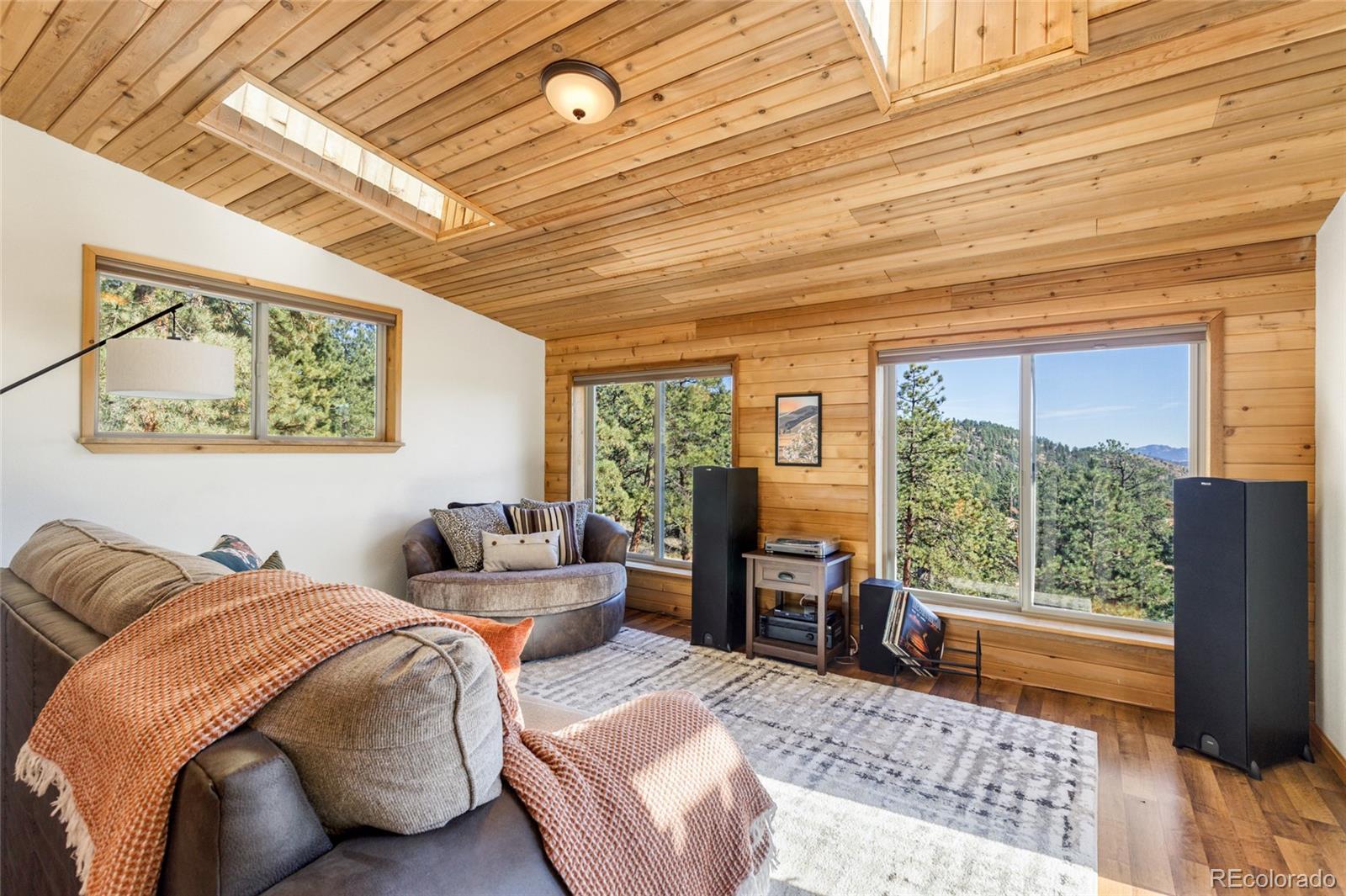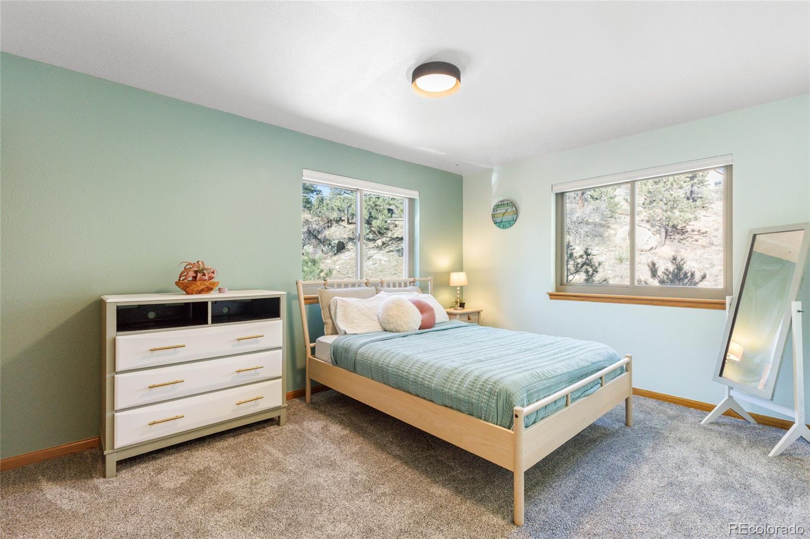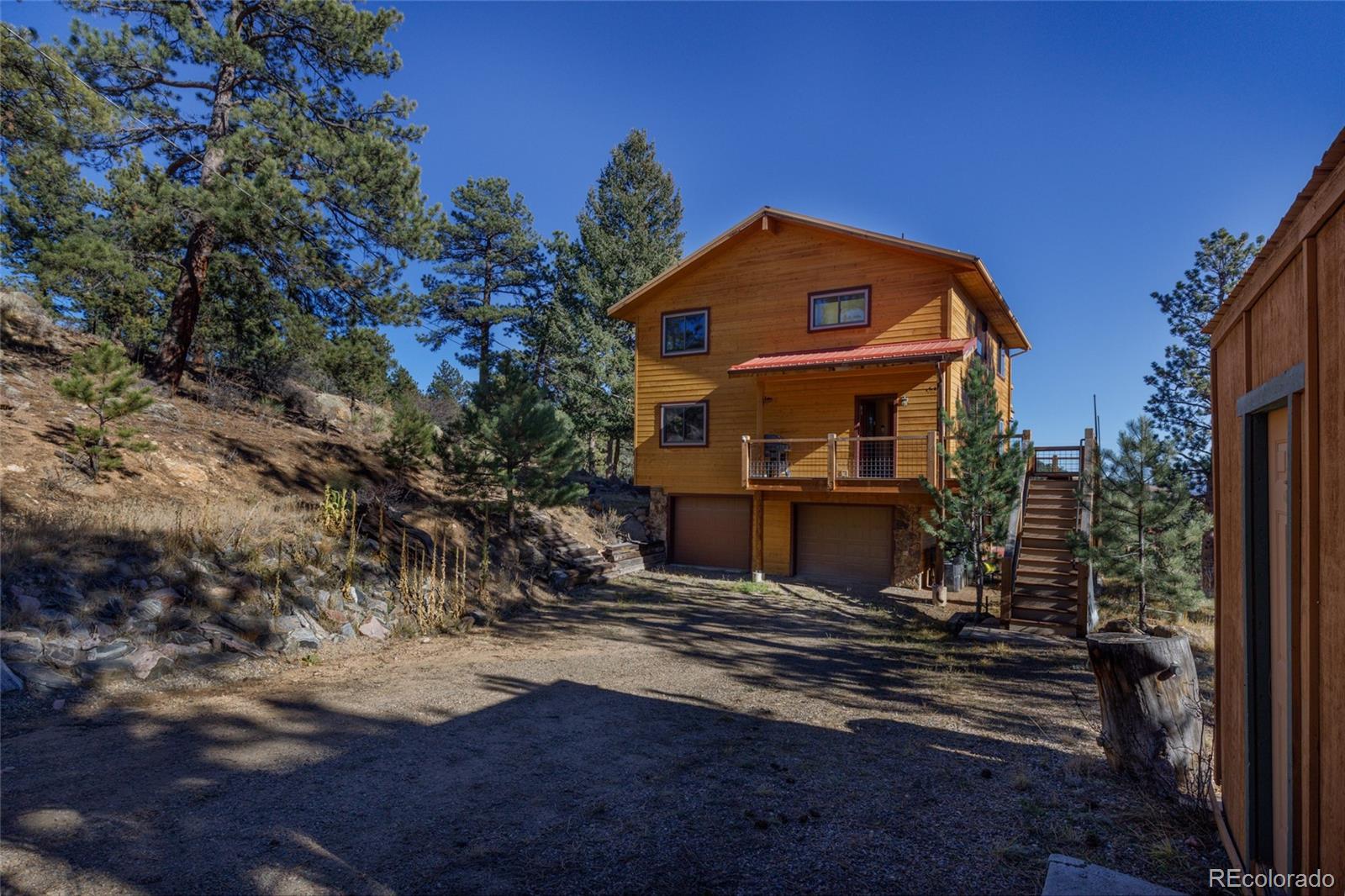 Escape to your own slice of mountain paradise! This tri-level, stunning home sits on 2 private acres surrounded by towering pines, dramatic moss-rock outcroppings & breathtaking panoramic views. Enjoy the sunrise from your upper level, private viewing platform or relax in the sunshine on the elevated expansive wrap-around Trex deck! Inside, you’ll find an open-concept floor plan w soaring ceilings & walls of windows that flood the home w natural light. The main living area features a striking moss-rock wood burning fireplace, cozy cedar-finished sunroom w skylights & double french doors that open onto the deck. The walk-out lower level offers its own living space w a pellet stove ez hot tub access & a private bedroom w sink and vanity—perfect for guests. Upstairs, the sunny loft w movie screen that overlooks the main living area & leads to the primary suite, complete w a luxurious 5 piece bath & stunning views from every window & a beautiful stained glass feature. Additional highlights include a mudroom with built-in storage spacious laundry room, low-maintenance metal roof & an attached two-car garage. This 3-bedroom, 2-bath retreat is move-in ready & fully furnished—most everything can stay! That includes quality furniture, appliances, a newer large hot tub, Starlink dish, snow blower, log splitter, tree trimmer/chainsaw/gas storage/misc yard equipment & more! voluntary hoa includes access to a private fishing pond & hiking trail to Mt Bailey! (www.burlandhomeowners.org/park) Move right in and relax—all the work has been done for you! Brand-new furnace, dishwasher & light fixtures throughout! Plus, enjoy peace of mind with major updates from the past decade, including a low-maintenance metal roof, cedar siding, Trex decking, water softener & pump, windows, septic system, water heater & stainless steel appliances! Located just a few miles off Hwy 285 & less than an hour from Denver, you’ll enjoy total tranquility with easy access to the city!