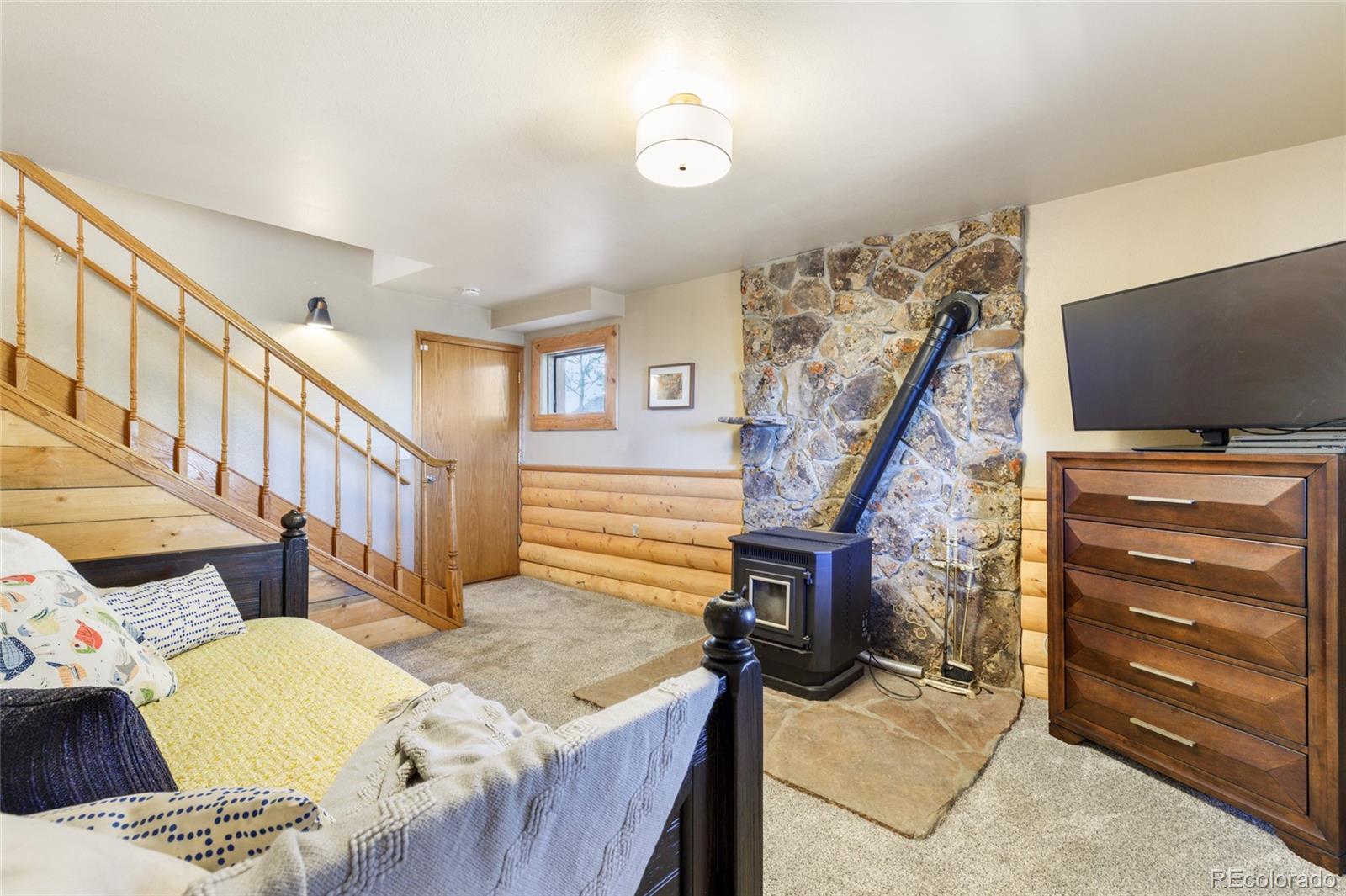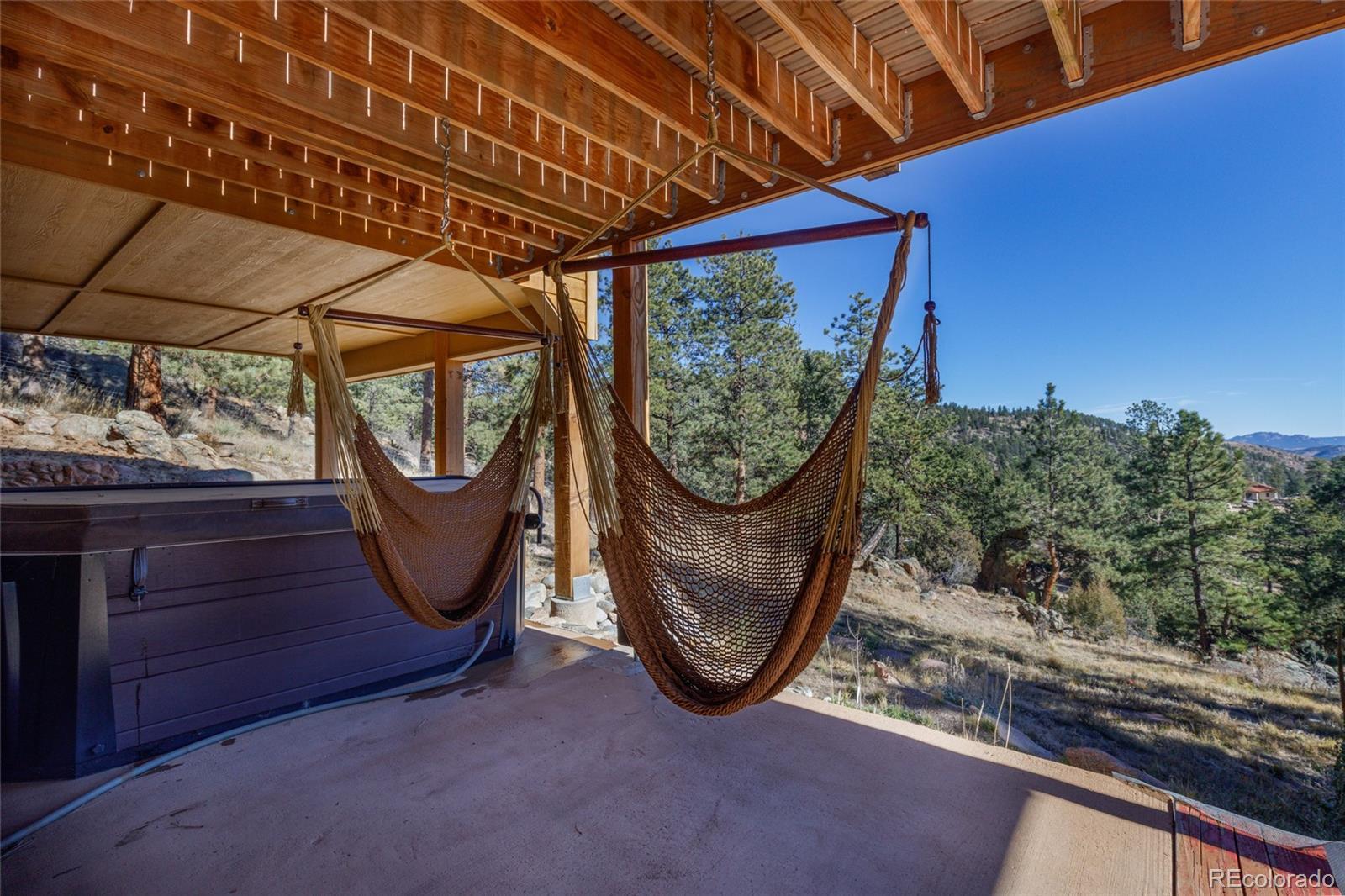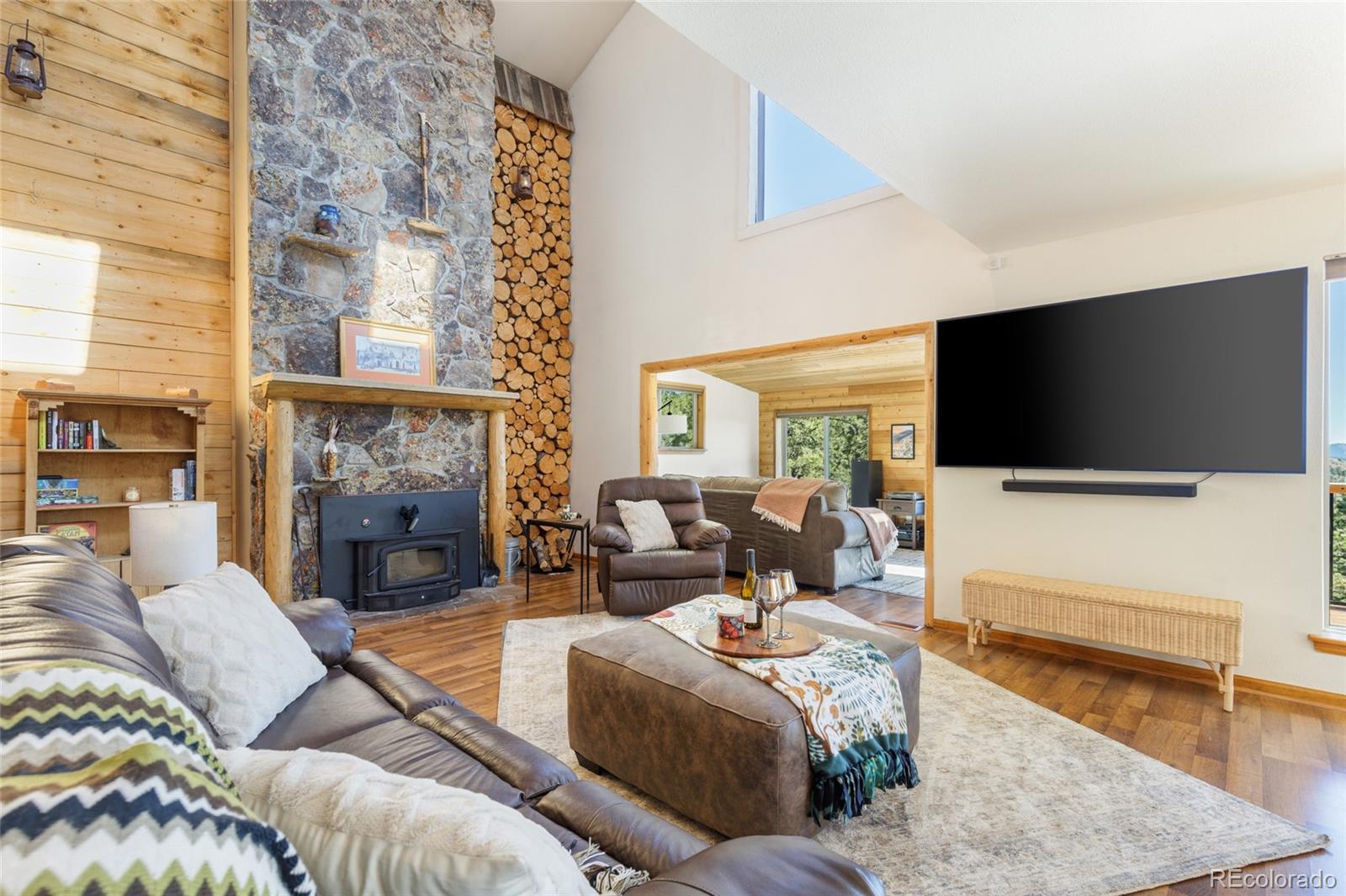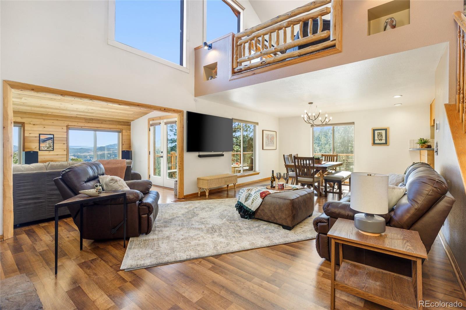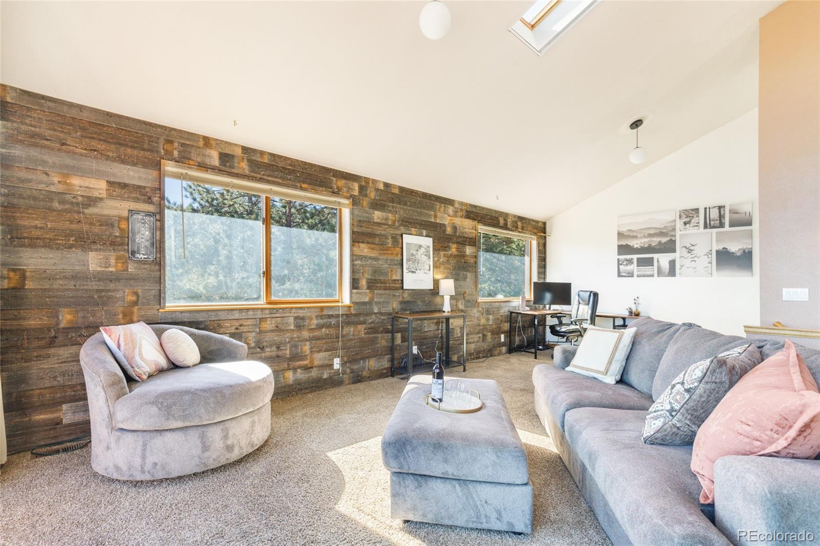 Escape to your own slice of mountain paradise! This tri-level, stunning home sits on 2 private acres surrounded by towering pines, dramatic moss-rock outcroppings & breathtaking panoramic views. Enjoy the sunrise from your upper level, private viewing platform or relax in the sunshine on the elevated expansive wrap-around Trex deck! Inside, you’ll find an open-concept floor plan w soaring ceilings & walls of windows that flood the home w natural light. The main living area features a striking moss-rock wood burning fireplace, cozy cedar-finished sunroom w skylights & double french doors that open onto the deck. The walk-out lower level offers its own living space w a pellet stove ez hot tub access & a private bedroom w sink and vanity—perfect for guests. Upstairs, the sunny loft w movie screen that overlooks the main living area & leads to the primary suite, complete w a luxurious 5 piece bath & stunning views from every window & a beautiful stained glass feature. Additional highlights include a mudroom with built-in storage spacious laundry room, low-maintenance metal roof & an attached two-car garage. This 3-bedroom, 2-bath retreat is move-in ready & fully furnished—most everything can stay! That includes quality furniture, appliances, a newer large hot tub, Starlink dish, snow blower, log splitter, tree trimmer/chainsaw/gas storage/misc yard equipment & more! voluntary hoa includes access to a private fishing pond & hiking trail to Mt Bailey! (www.burlandhomeowners.org/park) Move right in and relax—all the work has been done for you! Brand-new furnace, dishwasher & light fixtures throughout! Plus, enjoy peace of mind with major updates from the past decade, including a low-maintenance metal roof, cedar siding, Trex decking, water softener & pump, windows, septic system, water heater & stainless steel appliances! Located just a few miles off Hwy 285 & less than an hour from Denver, you’ll enjoy total tranquility with easy access to the city!