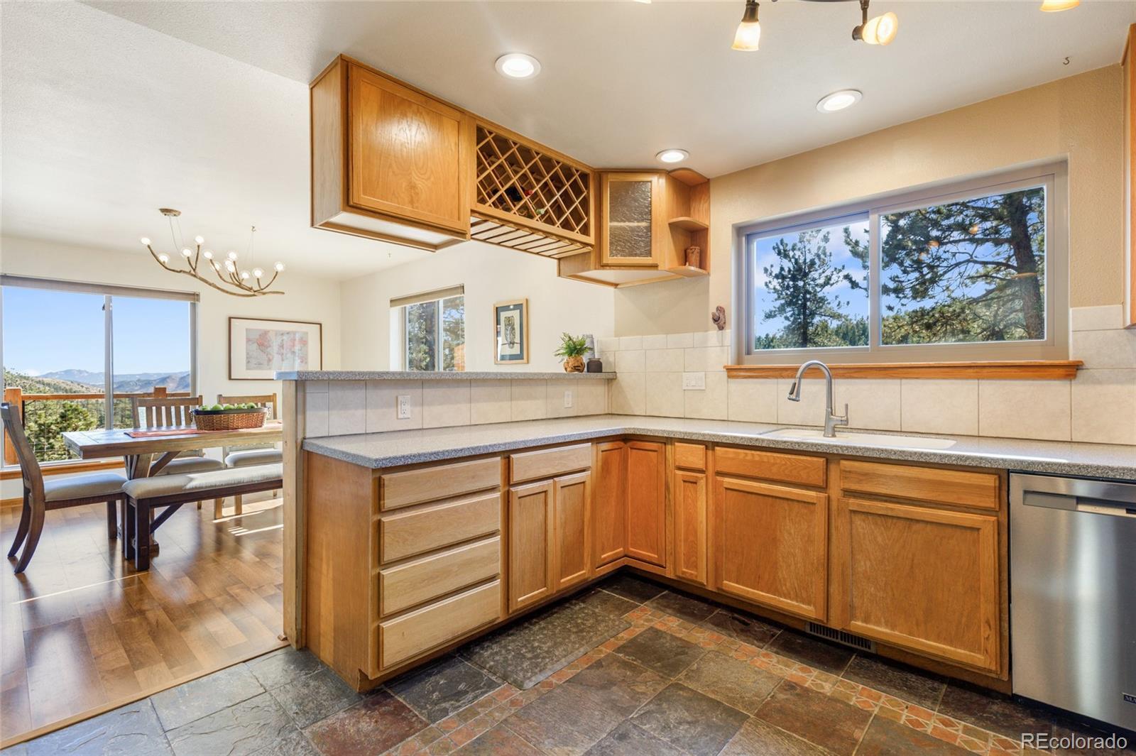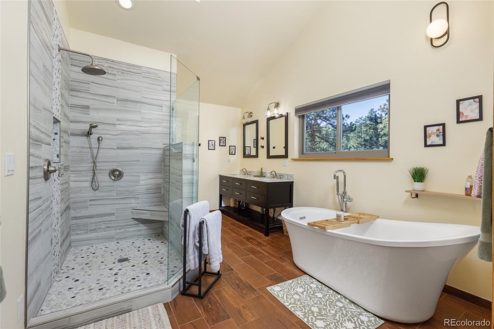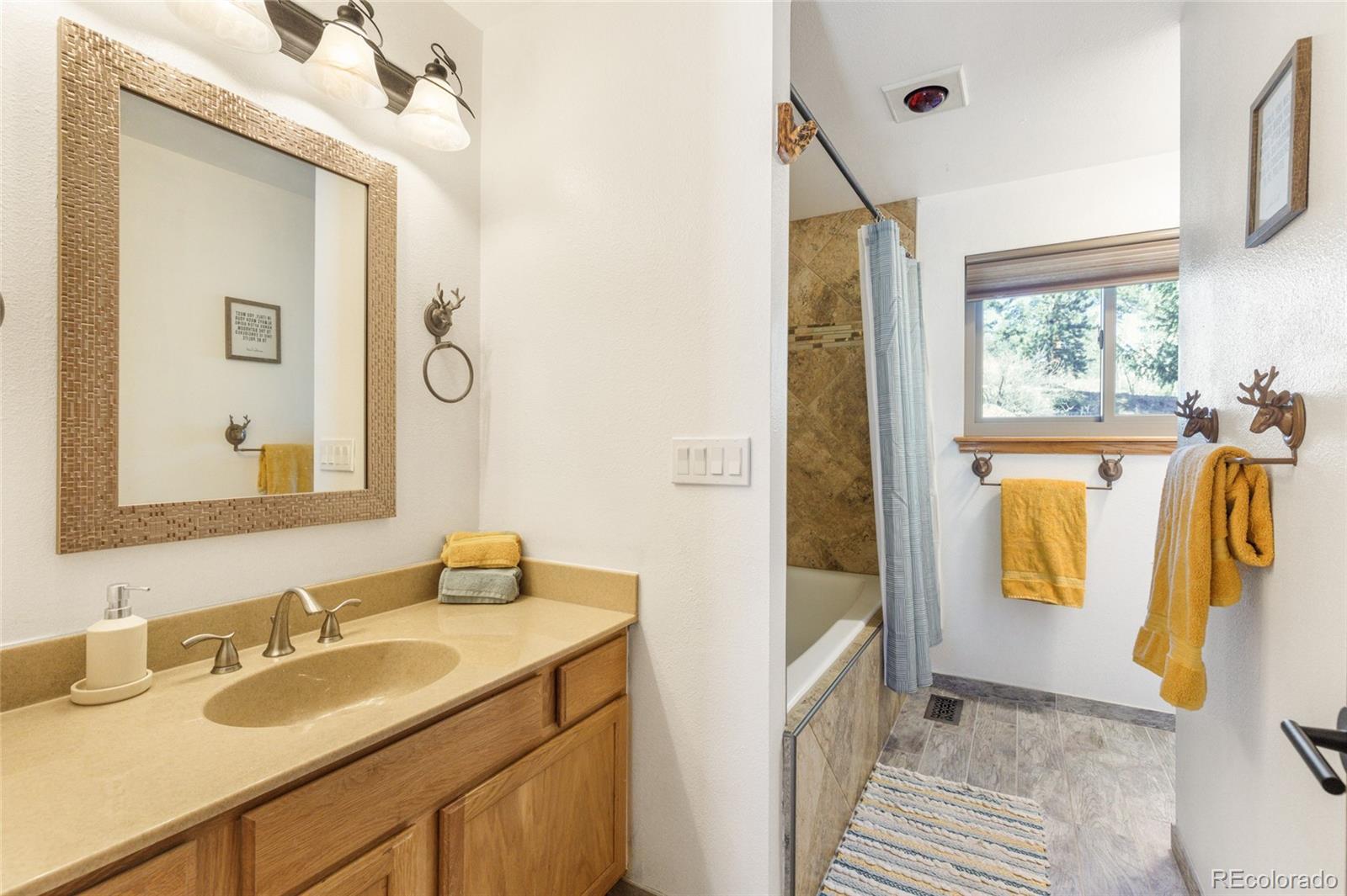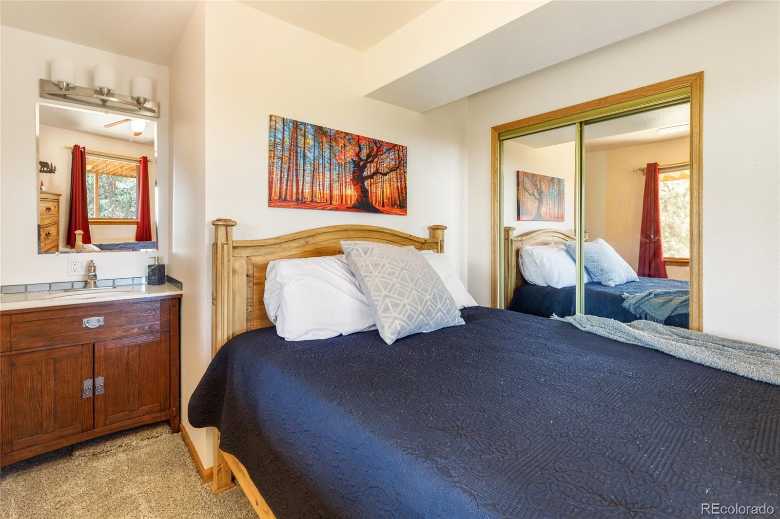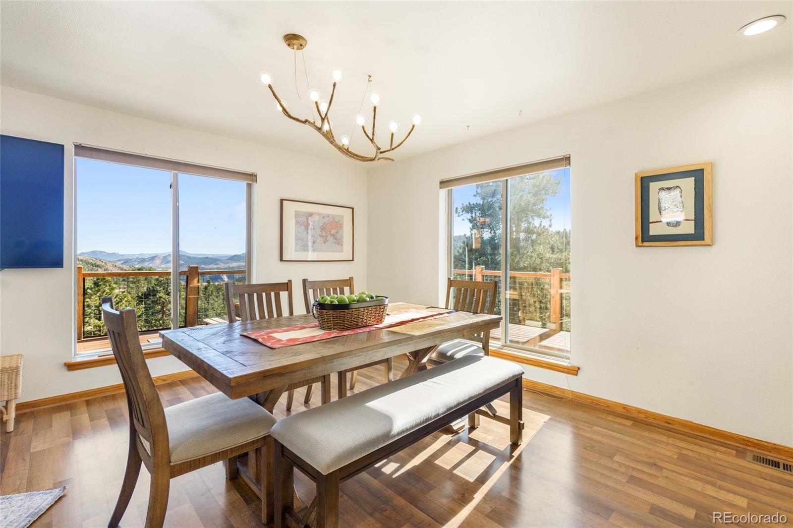 Escape to your own slice of mountain paradise! This tri-level, stunning home sits on 2 private acres surrounded by towering pines, dramatic moss-rock outcroppings & breathtaking panoramic views. Enjoy the sunrise from your upper level, private viewing platform or relax in the sunshine on the elevated expansive wrap-around Trex deck! Inside, you’ll find an open-concept floor plan w soaring ceilings & walls of windows that flood the home w natural light. The main living area features a striking moss-rock wood burning fireplace, cozy cedar-finished sunroom w skylights & double french doors that open onto the deck. The walk-out lower level offers its own living space w a pellet stove ez hot tub access & a private bedroom w sink and vanity—perfect for guests. Upstairs, the sunny loft w movie screen that overlooks the main living area & leads to the primary suite, complete w a luxurious 5 piece bath & stunning views from every window & a beautiful stained glass feature. Additional highlights include a mudroom with built-in storage spacious laundry room, low-maintenance metal roof & an attached two-car garage. This 3-bedroom, 2-bath retreat is move-in ready & fully furnished—most everything can stay! That includes quality furniture, appliances, a newer large hot tub, Starlink dish, snow blower, log splitter, tree trimmer/chainsaw/gas storage/misc yard equipment & more! voluntary hoa includes access to a private fishing pond & hiking trail to Mt Bailey! (www.burlandhomeowners.org/park) Move right in and relax—all the work has been done for you! Brand-new furnace, dishwasher & light fixtures throughout! Plus, enjoy peace of mind with major updates from the past decade, including a low-maintenance metal roof, cedar siding, Trex decking, water softener & pump, windows, septic system, water heater & stainless steel appliances! Located just a few miles off Hwy 285 & less than an hour from Denver, you’ll enjoy total tranquility with easy access to the city!