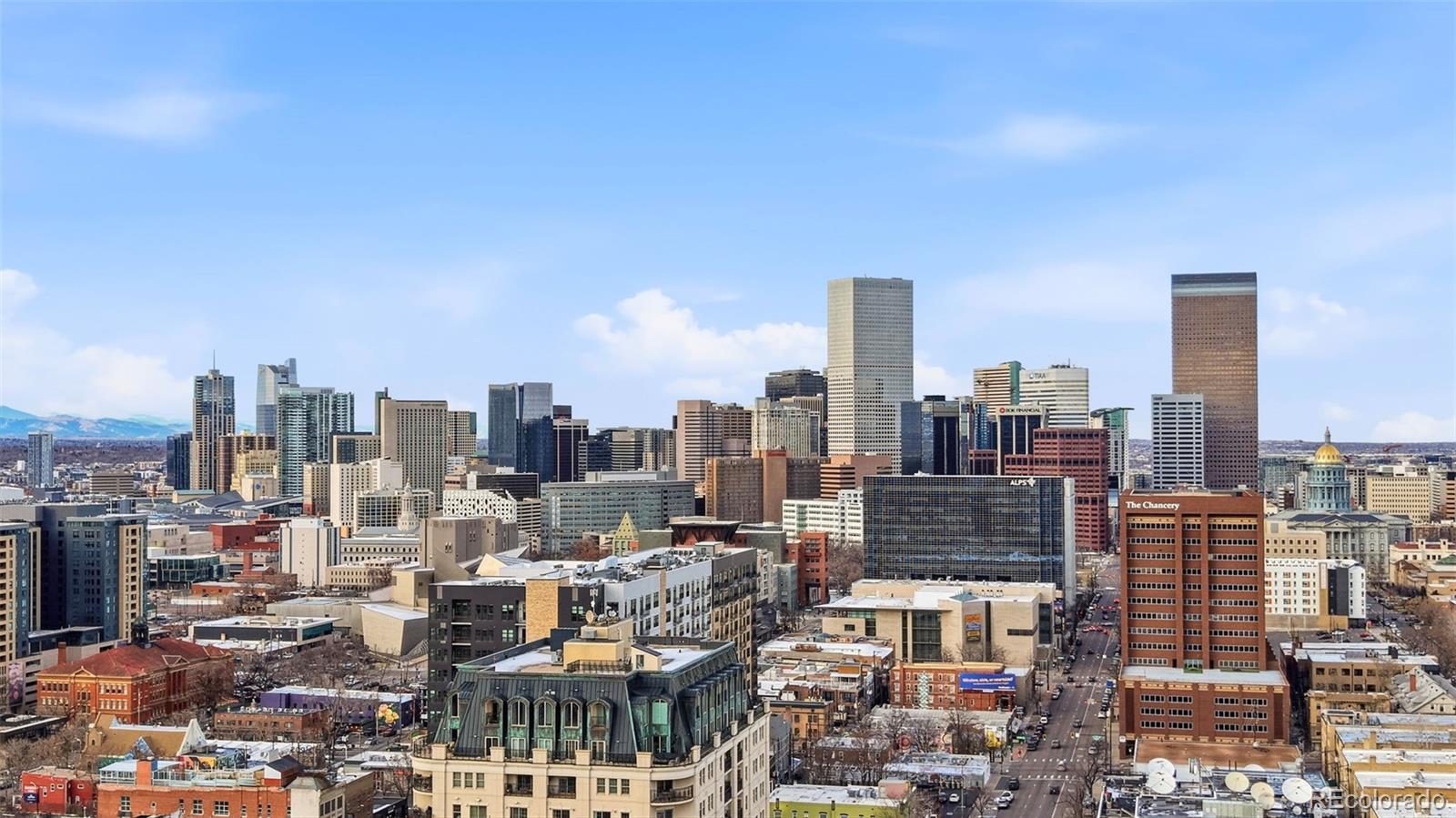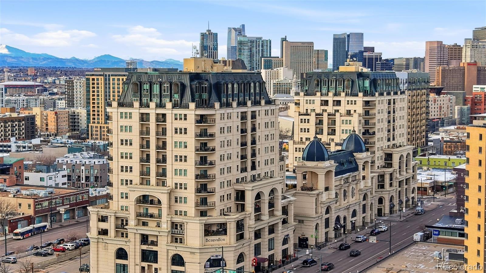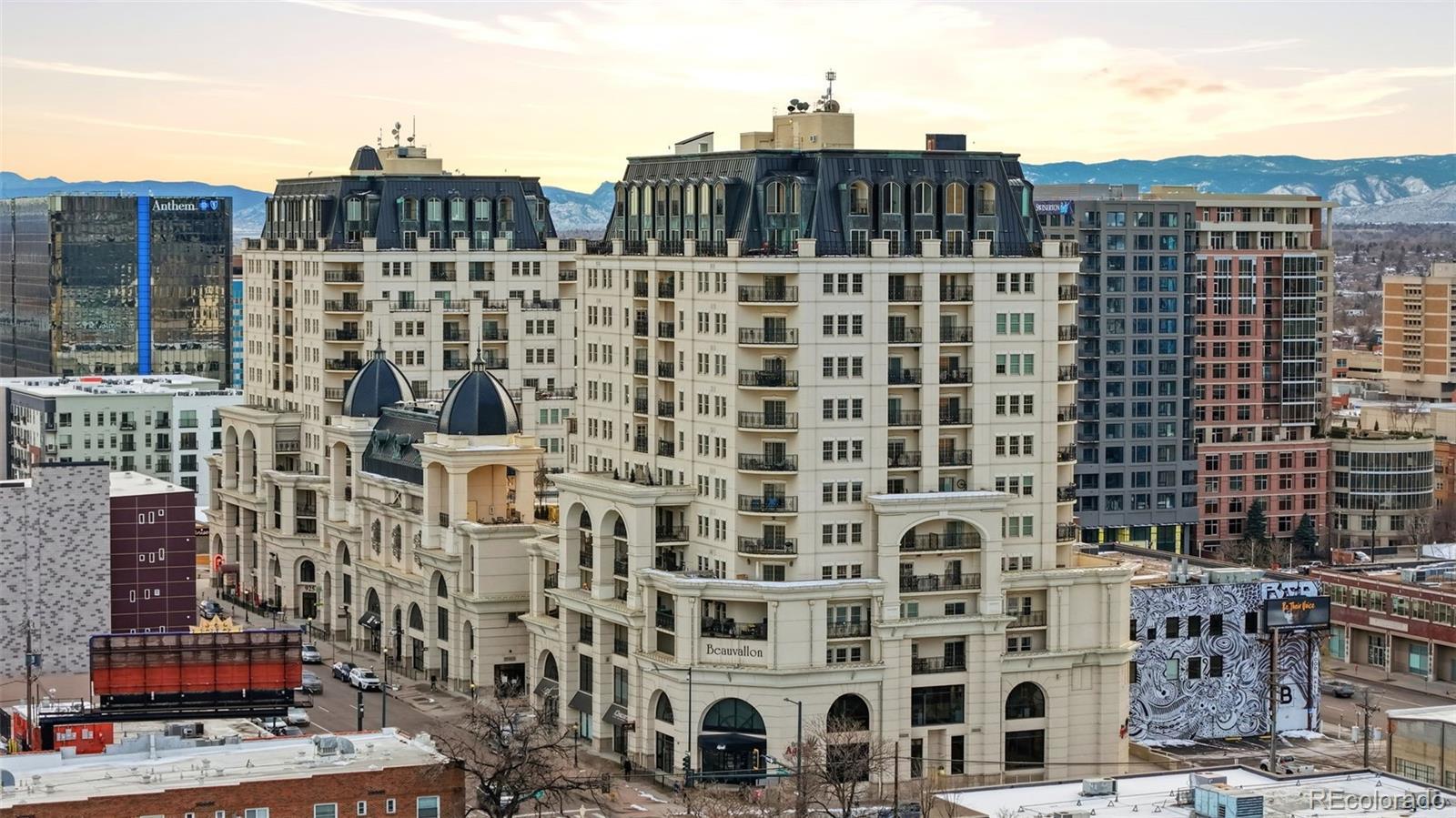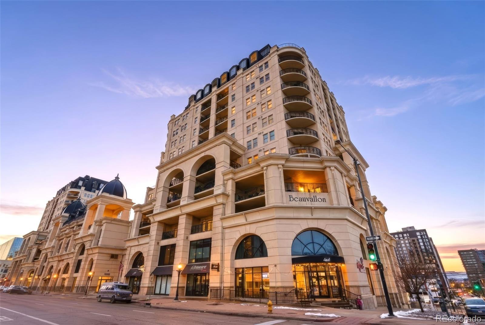 Perfectly positioned between Denver’s Golden Triangle and Capitol Hill, this beautifully updated 2-bedroom, 2-bath luxury condo at The Beauvallon offers upscale high-rise living with exceptional urban convenience. Walls of windows showcase stunning Denver skyline and mountain views and desirable northeast exposure. The open-concept floor plan features 10ft high ceilings, elegant tile flooring and a fully remodeled gourmet kitchen with soft-close cherry cabinetry, slab granite countertops and backsplash, pull-out Lazy Suzans, Fisher & Paykel stainless steel appliances and induction cooktop, Miele microwave, and don't miss the built-in Fisher & Paykel espresso maker! The living and dining areas open to a northeast-facing balcony off the kitchen and living room, ideal for morning coffee, entertaining, and city views. Over $125,000 in upgrades completed in 2022 include updated lighting, switches, outlets, and thoughtful modern finishes throughout. The primary suite is a private retreat with a covered balcony, professionally organized walk-in closet, and updated en-suite bathroom with walk-in shower. The second bedroom offers east-facing views, two closets, floating shelves, and a built-in Murphy bed, perfect for guests or a home office. Additional features include a smart thermostat, newer heat-pump HVAC system, and Frigidaire washer and dryer. One reserved garage parking space and secure storage unit are included. The Beauvallon is a full-service, secure building offering 24/7 security, concierge services, professional on-site management, rooftop pool and hot tub with panoramic city and mountain views, European-style gardens with fountains, BBQ and fire pit areas, bike storage, EV charging stations, and a pet-friendly environment. Walk to restaurants, museums, parks, and the Golden Triangle Creative District. Buyer to verify all information. Furnishings are negotiable.