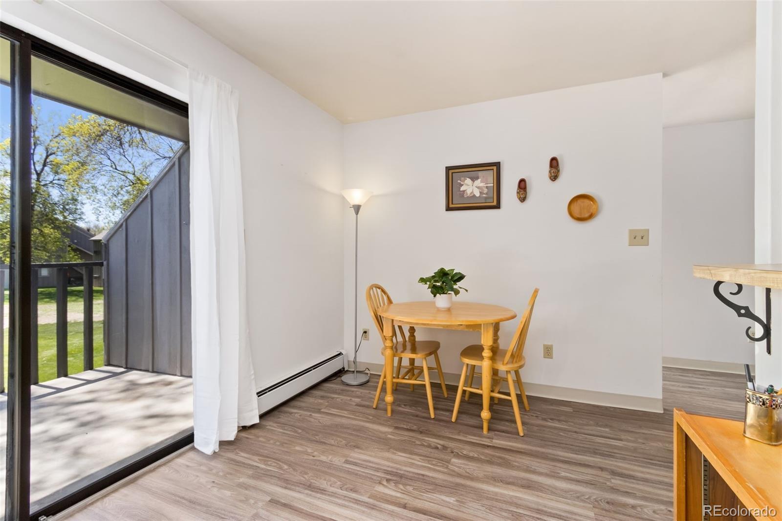 Enjoy peaceful green space views from the kitchen, dining, and living rooms in this well-maintained 2-bedroom condo. Both bedrooms feature spacious walk-in closets, and the kitchen comes fully equipped with appliances. A dedicated dining area opens to a private balcony, perfect for relaxing or entertaining. Recent updates include new LVP flooring in the kitchen, dining, hallway, and bathroom, plus brand-new carpet in the living room and bedrooms. HOA covers heat, water, pool, tennis court, and clubhouse-adding comfort and convenience to everyday living. Conveniently located across from a bus stop, 2 minutes to Scotch Pines Village shopping center, 10 minutes to CSU main campus.
