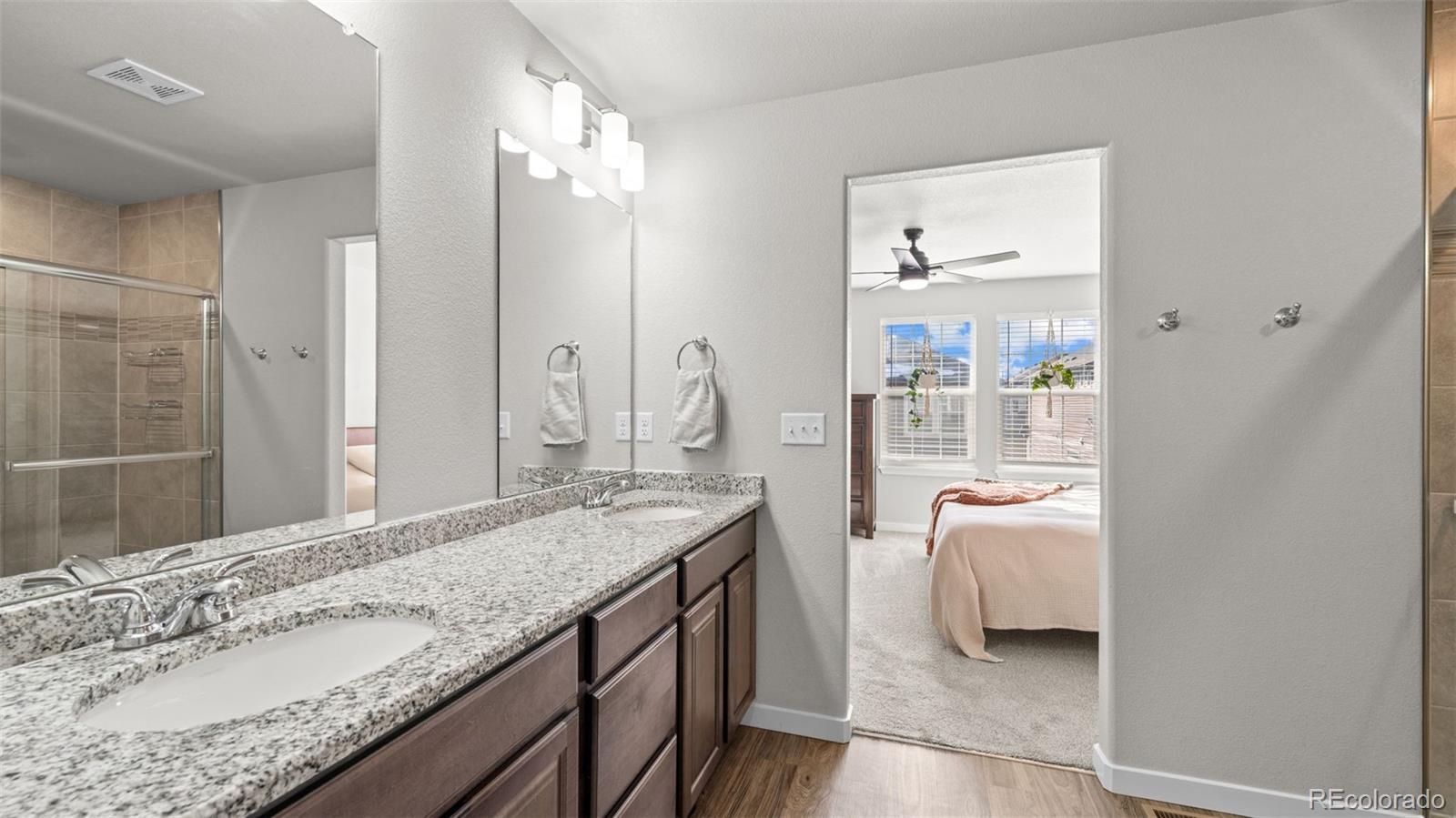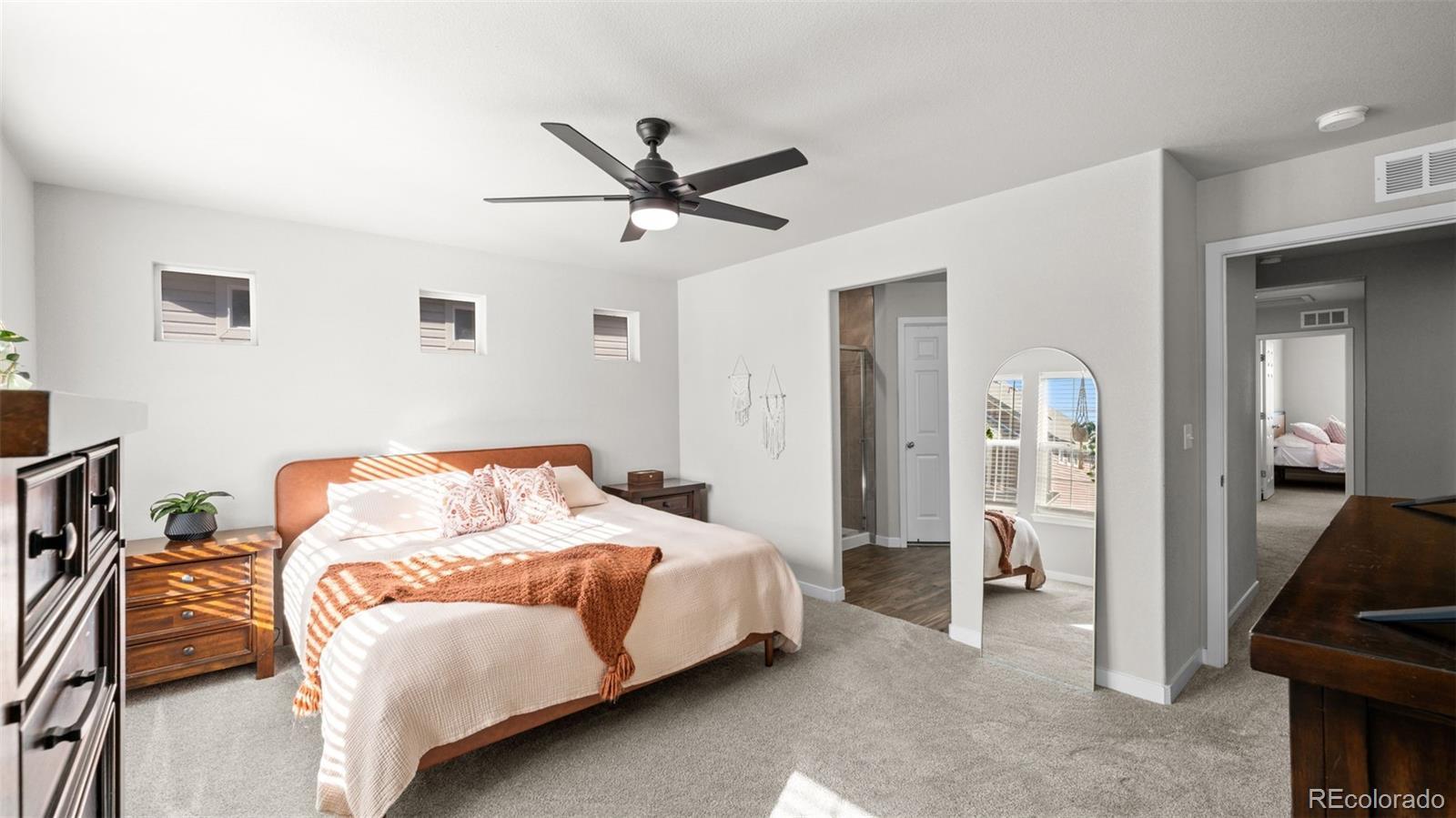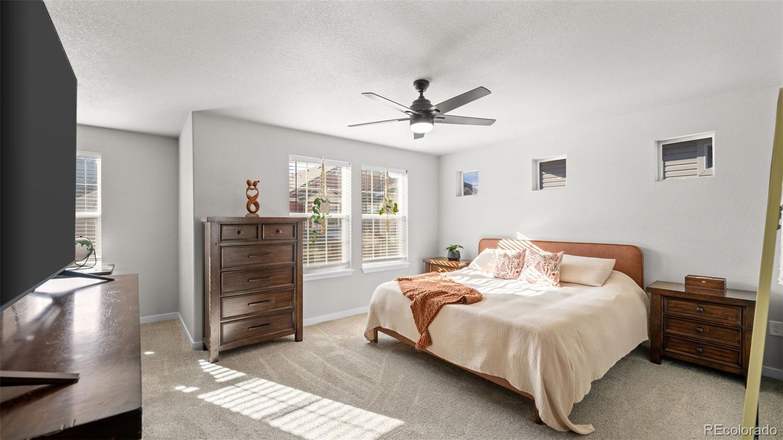 Welcome to this inviting home featuring an open and functional layout designed for both everyday living and entertaining. The kitchen is equipped with granite countertops, gas for cooking, and ample cabinetry, making it a perfect space for home chefs. Central air conditioning ensures year-round comfort, while solar panels help improve energy efficiency and lower utility costs. The primary suite serves as a relaxing retreat, complete with a walk-in closet and a private bathroom featuring a double vanity. Additional living spaces are bright and welcoming, offering flexibility for guests, work-from-home needs, or recreation. Outside, enjoy the convenience and community feel and resort-style amenities that Banning Lewis is known for, with nearby parks, open spaces, and neighborhood amenities just minutes away. This home combines modern comforts, energy efficiency, and an exceptional location—making it an ideal place to call home.