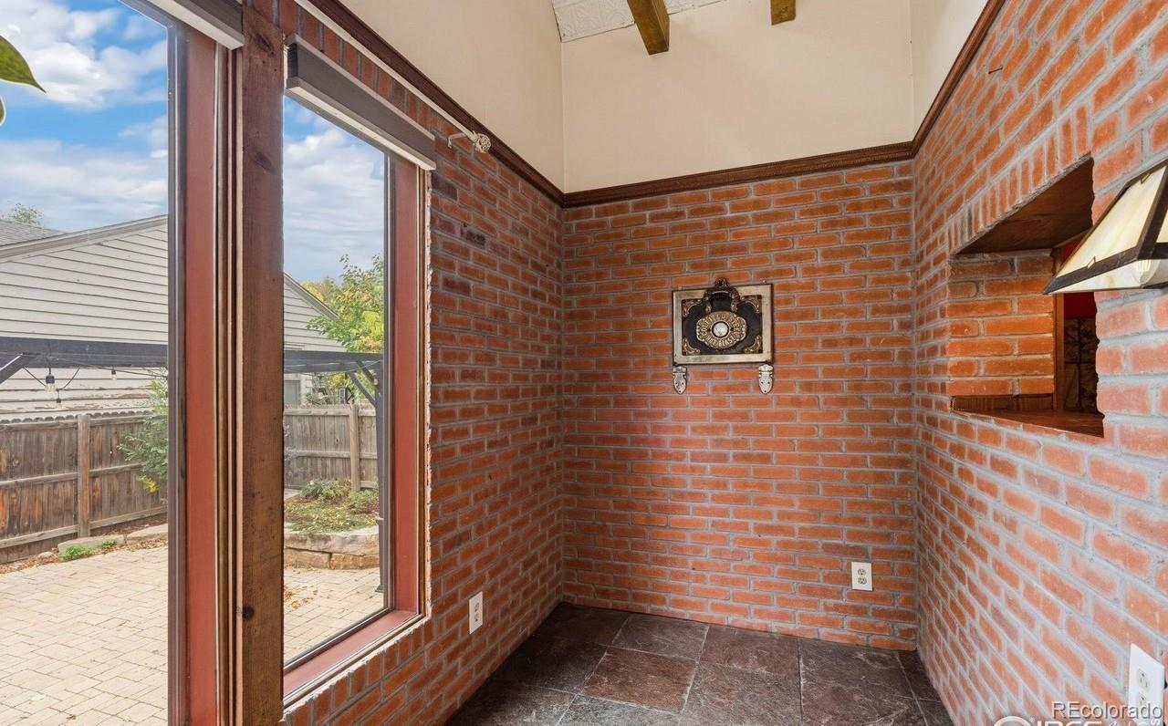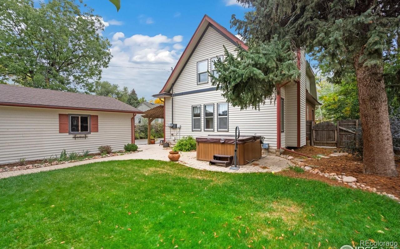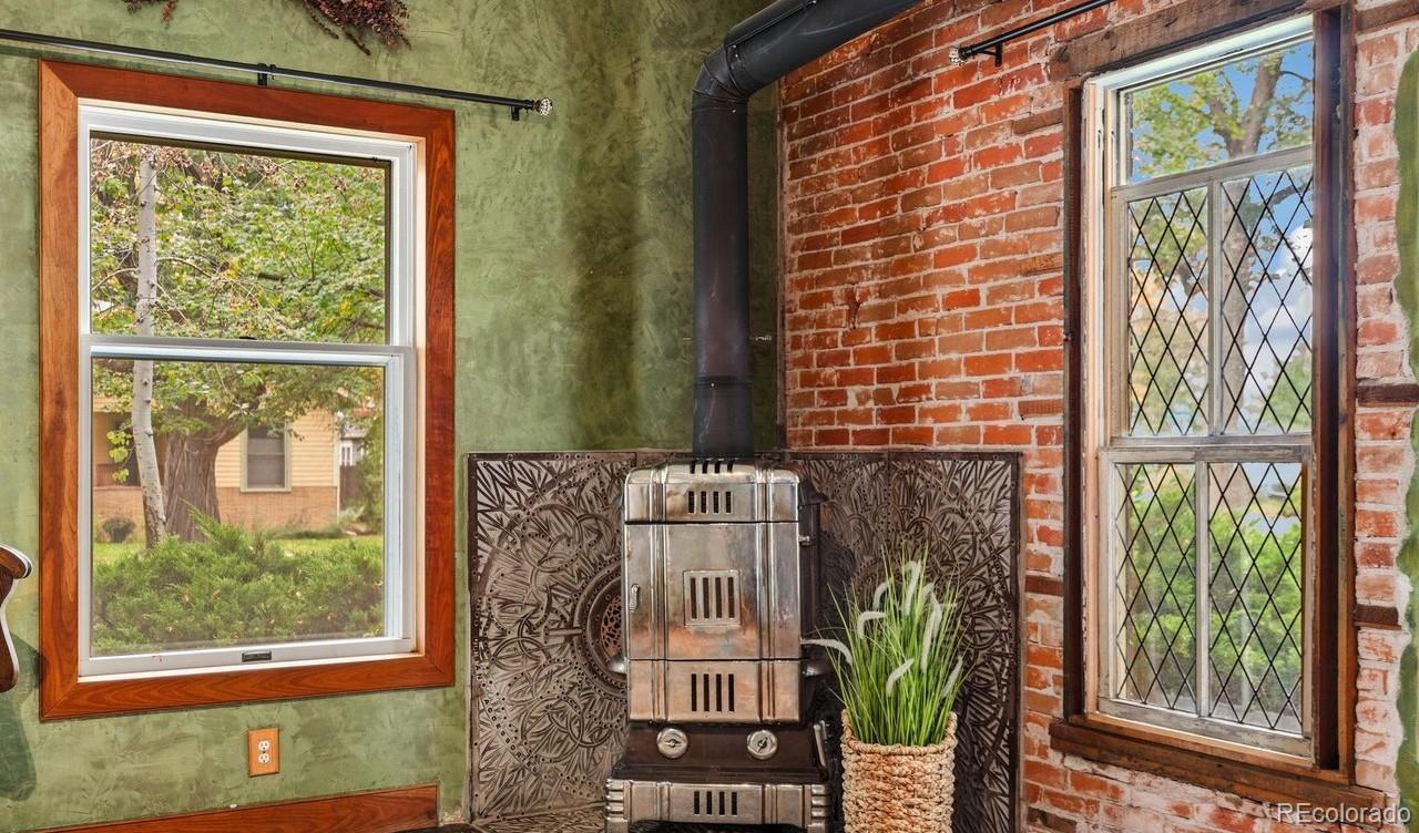 Charming and timeless 1945 brick 2-Story in the heart of Loveland! This inviting home blends vintage craftsmanship with thoughtful updates and warm, welcoming spaces. Check out 3 D vitual tour. Beautiful wood floors and high ceilings flow through much of the main level, complementing the natural light. Enjoy your morning coffee in the charming sunroom (in mls as rec room, overlooking the swimming pool and pergola with peaceful views that make every day feel like a retreat. Inside, the front living room features a pressed tin ceiling, elegant wood stove, and the original organ with ornate woodwork and mirrored top-an heirloom piece that stays with the home. A vintage L'Instant Taittinger poster featuring Grace Kelly adds a touch of Hollywood glamour to the space. The kitchen combines old-world charm with modern convenience: built-in refrigerator, gas range, microwave, and pantry, butler serving area plus a sink and dishwasher area along the sunroom wall. Plenty of space to spread out while cooking and entertaining. A main-floor bedroom, and bath with clawfoot tub, pull-chain toilet, add to the home's authentic vintage character. The family room with a cozy fireplace offers easy access to the backyard, where you'll find a hot tub and raised garden beds ready for your green thumb. Upstairs, a bonus room makes a perfect playroom, yoga space, or studio. The primary bedroom boasts cedar-lined closets and an adjoining room ideal for an office, art space, or reading nook or close the wall and make another bedroom. Full bath with shower and shared hall sink offers practicality and charm. Oversized two-car garage with alley access and front parking completes this rare find. A truly unique Loveland classic-filled with history, warmth, and personality.