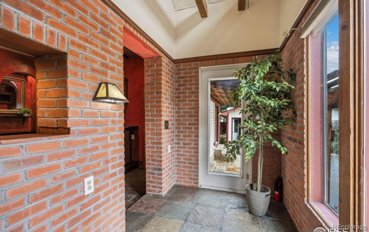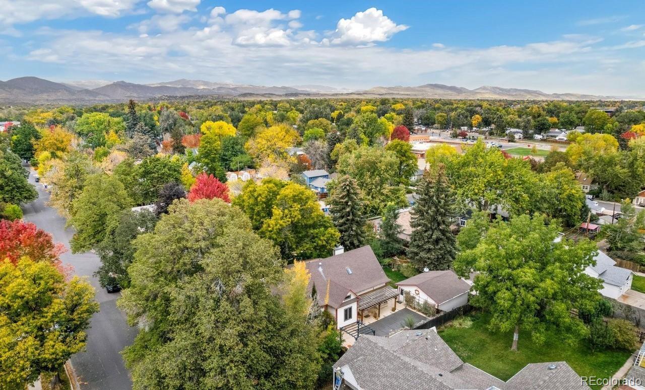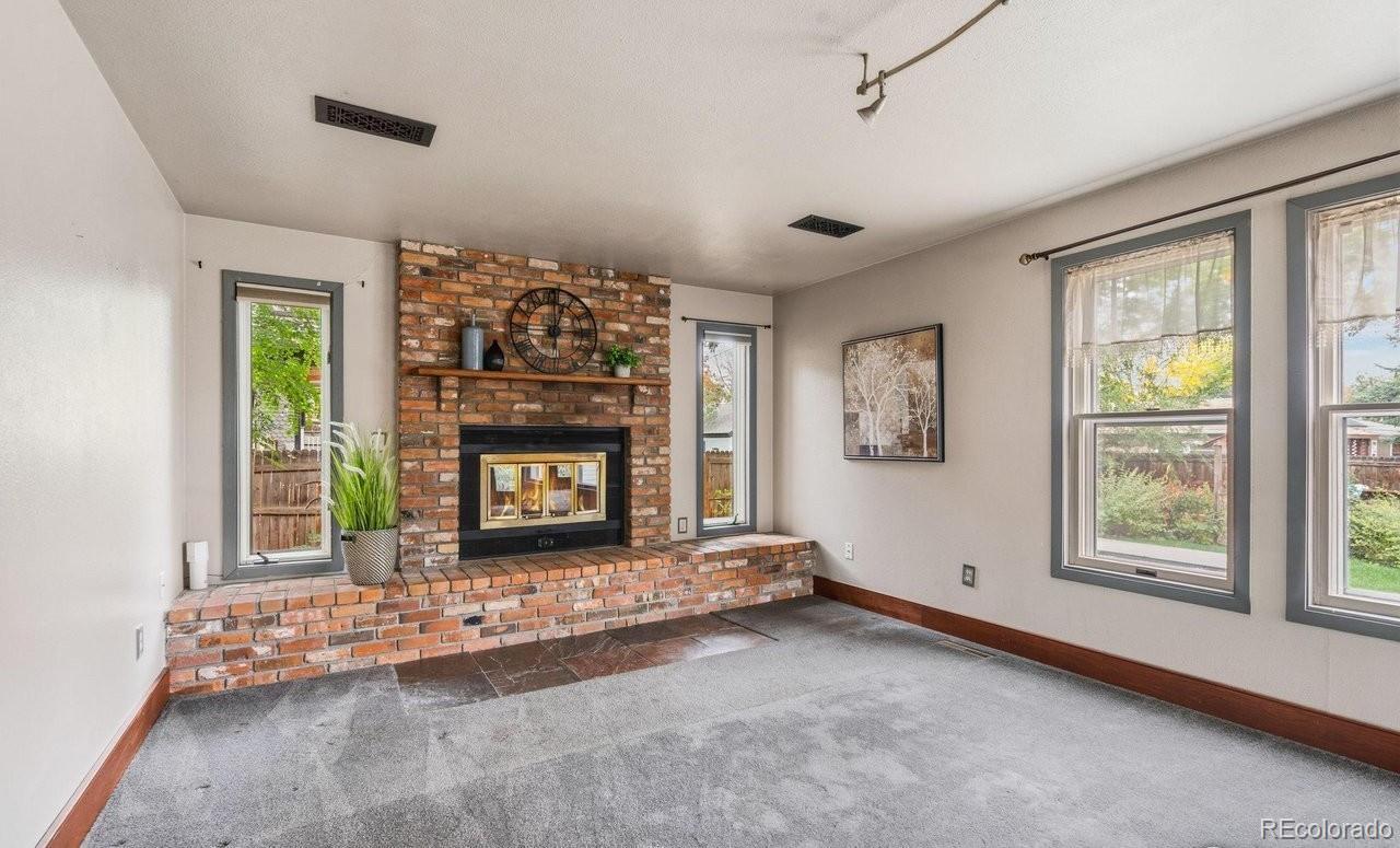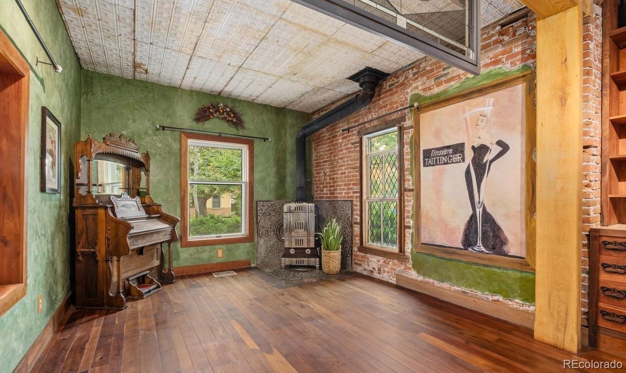 Charming and timeless 1945 brick 2-Story in the heart of Loveland! This inviting home blends vintage craftsmanship with thoughtful updates and warm, welcoming spaces. Check out 3 D vitual tour. Beautiful wood floors and high ceilings flow through much of the main level, complementing the natural light. Enjoy your morning coffee in the charming sunroom (in mls as rec room, overlooking the swimming pool and pergola with peaceful views that make every day feel like a retreat. Inside, the front living room features a pressed tin ceiling, elegant wood stove, and the original organ with ornate woodwork and mirrored top-an heirloom piece that stays with the home. A vintage L'Instant Taittinger poster featuring Grace Kelly adds a touch of Hollywood glamour to the space. The kitchen combines old-world charm with modern convenience: built-in refrigerator, gas range, microwave, and pantry, butler serving area plus a sink and dishwasher area along the sunroom wall. Plenty of space to spread out while cooking and entertaining. A main-floor bedroom, and bath with clawfoot tub, pull-chain toilet, add to the home's authentic vintage character. The family room with a cozy fireplace offers easy access to the backyard, where you'll find a hot tub and raised garden beds ready for your green thumb. Upstairs, a bonus room makes a perfect playroom, yoga space, or studio. The primary bedroom boasts cedar-lined closets and an adjoining room ideal for an office, art space, or reading nook or close the wall and make another bedroom. Full bath with shower and shared hall sink offers practicality and charm. Oversized two-car garage with alley access and front parking completes this rare find. A truly unique Loveland classic-filled with history, warmth, and personality.