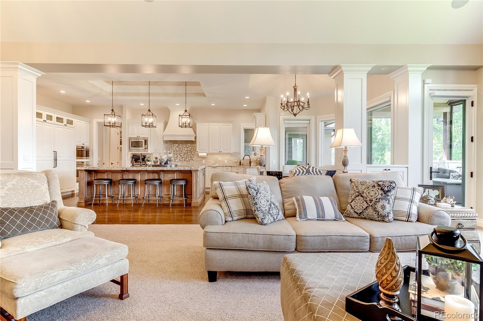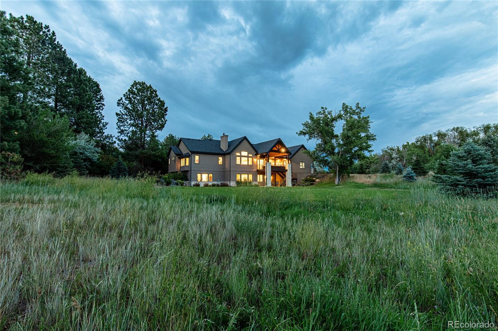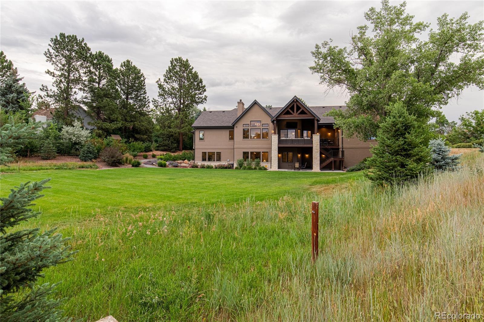 Welcome to 5899 Green Oaks Drive, a recently built residence on 1.37 acres located in the coveted community of Green Oaks in Greenwood Village. This transitional styled home has been carefully designed to encompass tremendous indoor and outdoor living spaces with attention to detail and quality workmanship. A two-story grand foyer leads one into an impressive vaulted open concept main family room /kitchen and formal/informal dining spaces. A chef's dream gourmet kitchen has top of the line professional appliances with a massive center island and breakfast bar/eat in area with turret style ceiling that over looks the back covered pitched roof patio with electric shaded awning and maturely manicured grounds and gardens. The dining room is perfect for more formal gatherings with inlay ceiling, millwork and rich hardwoods. A private office fully customized is located just off the kitchen along with a well designed designed pantry and mudroom. The main level has a primary bedroom wing with sitting area that transitions into a spa like bath with dual vanities and much desired master walk-in closet, there is an additional large bedroom with ensuite bath. The lower level has additional bedrooms each with own baths, a large family room with mini kitchen and full gym with rubber floor, games room, billard space and walkout access to lower level patio and yard. This home has a sought after 5 car dual heated garage, back staircase off deck that leads to a lush yard with over 63 Evergreens. This unique home allows for 2 horses, is located close to I-25 with easy access to downtown Denver, Cherry Creek, Aspen Academy/ St Mary's Academy, shopping and local dining, Highline Canal and Rollin D. Barnard Equestrian Park. Green Oaks has always been a destination community affording residence the beautiful community pool and tennis facilities.