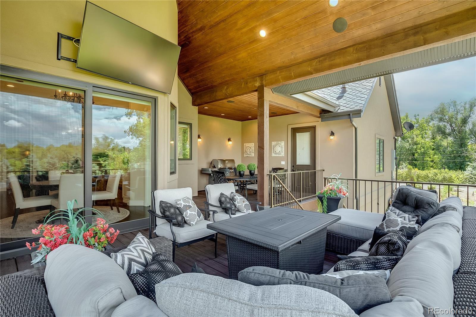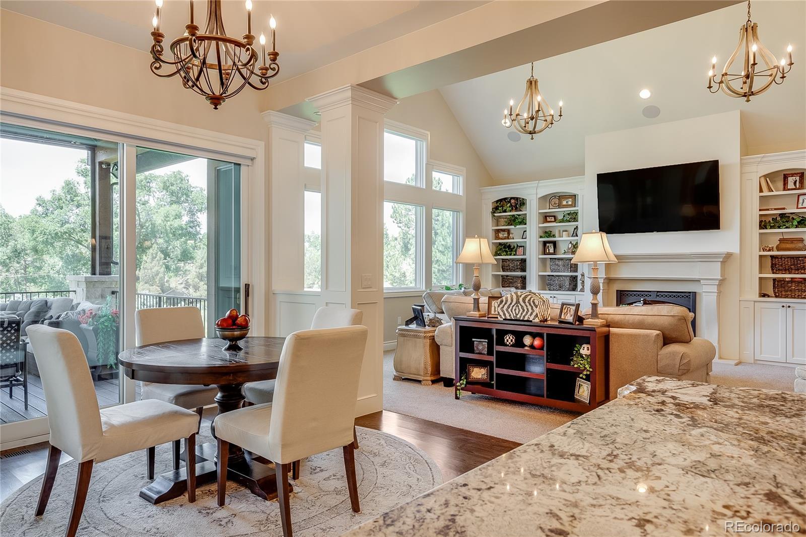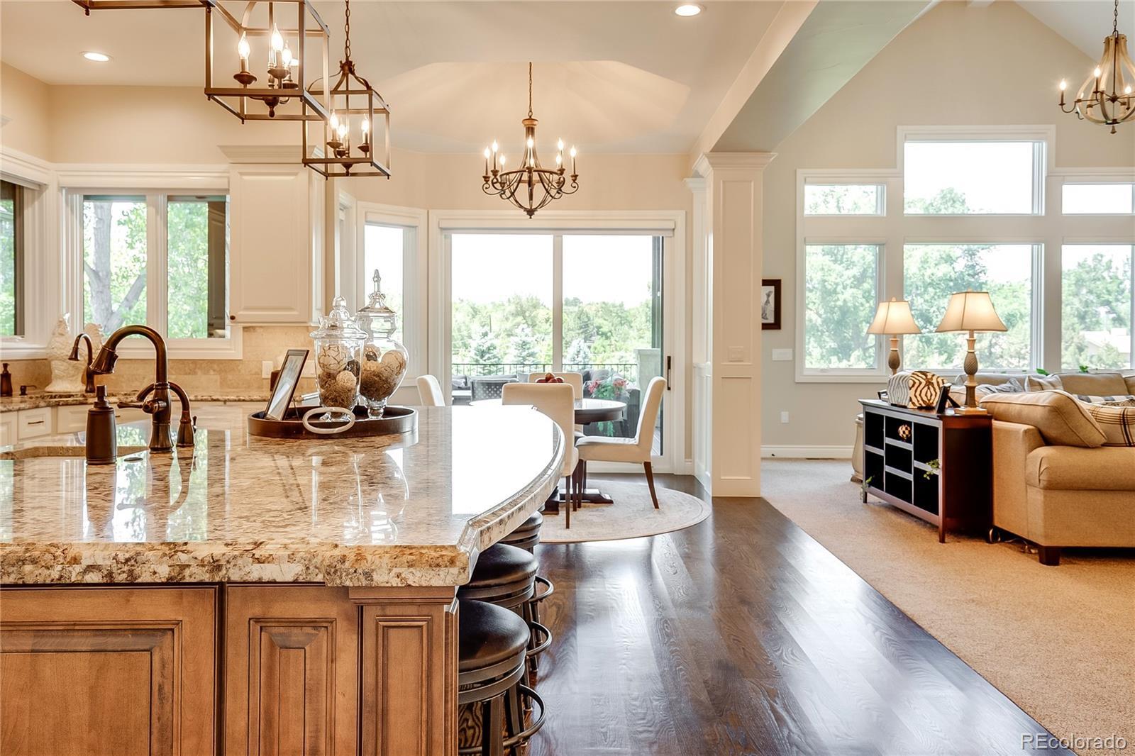 Welcome to 5899 Green Oaks Drive, a recently built residence on 1.37 acres located in the coveted community of Green Oaks in Greenwood Village. This transitional styled home has been carefully designed to encompass tremendous indoor and outdoor living spaces with attention to detail and quality workmanship. A two-story grand foyer leads one into an impressive vaulted open concept main family room /kitchen and formal/informal dining spaces. A chef's dream gourmet kitchen has top of the line professional appliances with a massive center island and breakfast bar/eat in area with turret style ceiling that over looks the back covered pitched roof patio with electric shaded awning and maturely manicured grounds and gardens. The dining room is perfect for more formal gatherings with inlay ceiling, millwork and rich hardwoods. A private office fully customized is located just off the kitchen along with a well designed designed pantry and mudroom. The main level has a primary bedroom wing with sitting area that transitions into a spa like bath with dual vanities and much desired master walk-in closet, there is an additional large bedroom with ensuite bath. The lower level has additional bedrooms each with own baths, a large family room with mini kitchen and full gym with rubber floor, games room, billard space and walkout access to lower level patio and yard. This home has a sought after 5 car dual heated garage, back staircase off deck that leads to a lush yard with over 63 Evergreens. This unique home allows for 2 horses, is located close to I-25 with easy access to downtown Denver, Cherry Creek, Aspen Academy/ St Mary's Academy, shopping and local dining, Highline Canal and Rollin D. Barnard Equestrian Park. Green Oaks has always been a destination community affording residence the beautiful community pool and tennis facilities.