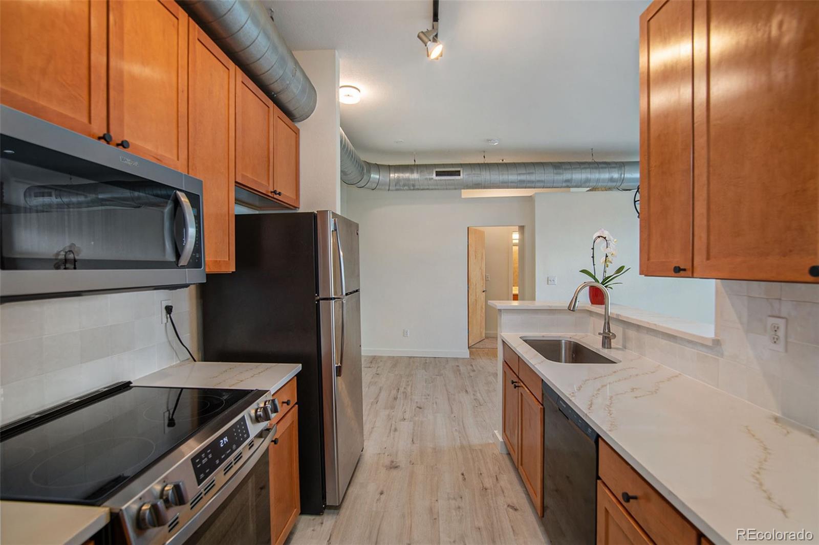 *Incredible value alert: priced well under market value!* Discover your perfect urban retreat in this beautifully updated 2-bedroom, 2-bath condo, ideally located in the sought-after Central Park neighborhood of Denver. Step outside, and you'll find a vibrant array of shops and restaurants just moments away, offering the ultimate in convenience and walkability. This unit is a true gem within the building, featuring a private covered patio that overlooks the picturesque South Green. Enjoy the lively atmosphere as this green space hosts community events, including concerts, a farmers market, and Movies in The Park. Inside, the condo has been thoughtfully updated with brand new flooring, including luxurious designer carpet, fresh paint, and high-end finishes throughout. The kitchen shines with elegant quartz countertops, modern fixtures, and a beautiful backsplash, perfect for the culinary enthusiast. The spacious and desirable floorplan includes a true primary suite, complete with a walk-in closet and a generously sized en suite bathroom. Abundant natural light fills the space, enhancing the warm and inviting ambiance. With its prime location, stylish updates, and functional layout, this condo is a must-see. Don’t miss your chance to call this vibrant community home!