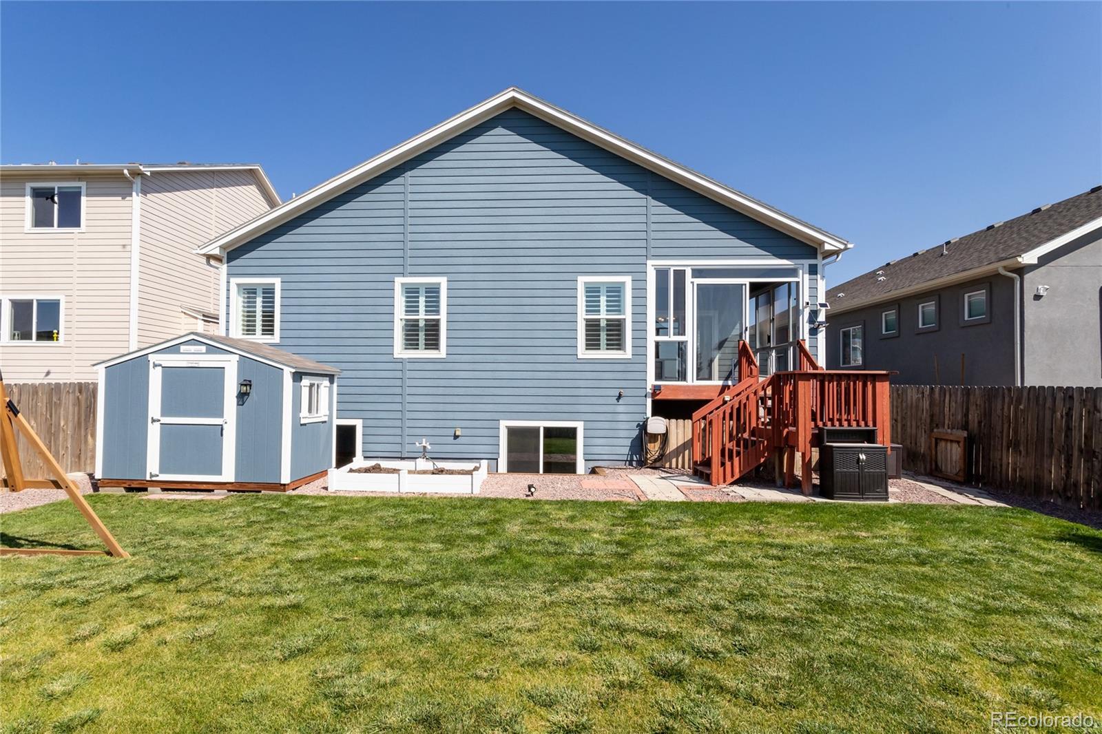 Welcome home to this Sterling Ranch beauty! As you walk into the entry of this rancher you are greeted with a bright open floorplan. The kitchen shows off with its granite counters, timeless cabinetry, large pantry and modern appliances. A laundry room leading into the garage means this home is true main level living! The attached dining area opens up to a custom enclosed deck with large glass sliders, perfect for enjoying the outdoors during every season! Every main level window in the home is dressed with custom plantation shutters for style and privacy. Three bedrooms are situated on the main level, the first being a flexible space with paned French doors. The master bedroom can be found at the end of the hallway, with access to the deck. The attached five piece bathroom is spacious with a walk in closet and plenty of sunshine. A third bedroom is home to a large closet and is situated next to the hallway bathroom. Heading downstairs, the spanning family room space is ready to be customized to fit your lifestyle! Down the hall you will find two more bedrooms, one has double doors and can be a flexible space, the other hosts a walk in closet. The basement is also home to a third bathroom with modern touches. On this level you will also find a generously sized storage space to keep all your goodies organized and put away! The only thing left to see is the well maintained yard! Lush green grass and carefully placed plants make this yard one for enjoying! So, what are you waiting for? Get in and see it today!