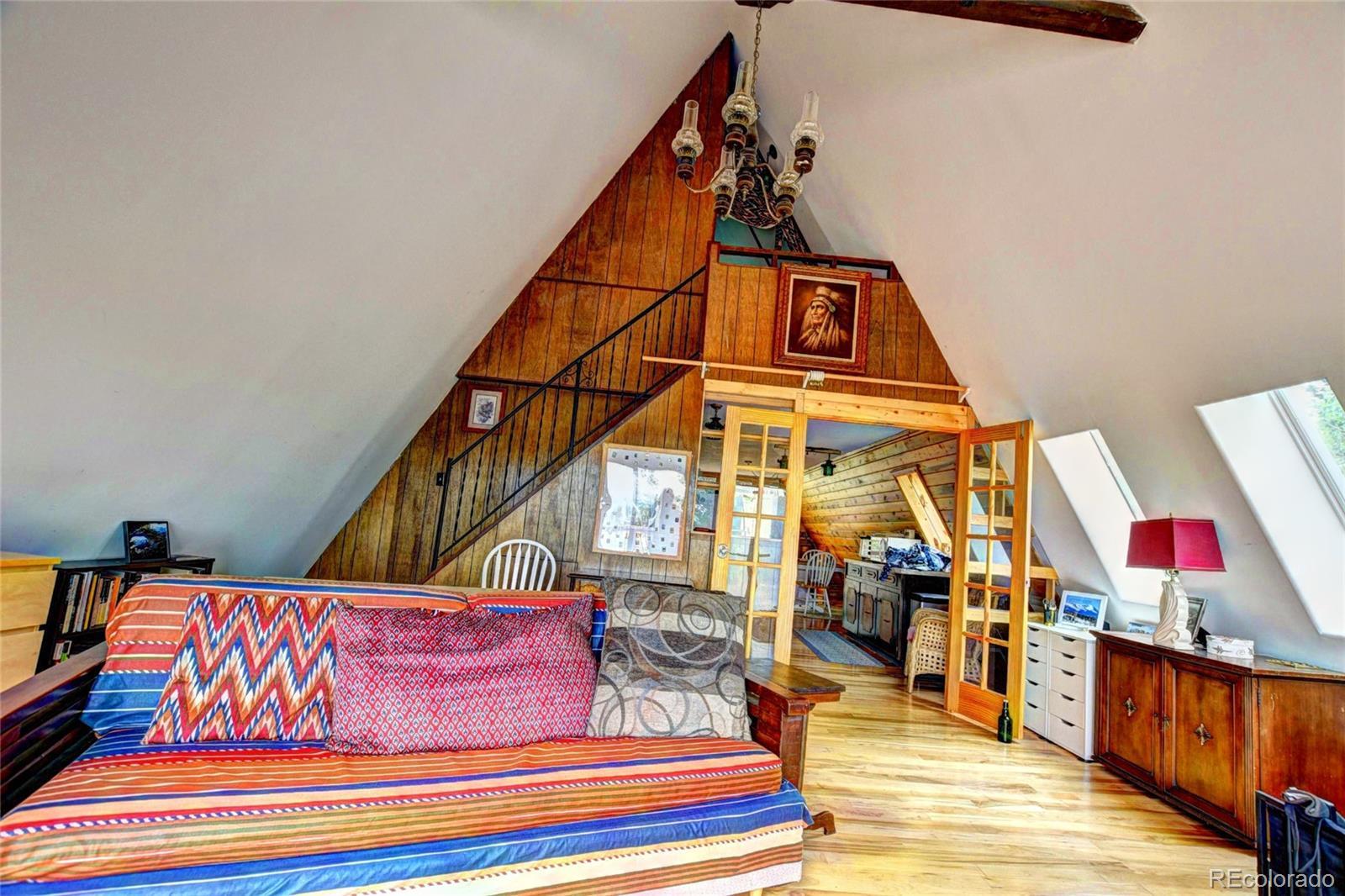 Nestled deep in the woods of Colorado, this charming 2-bedroom, 1-bath A-Frame house is surrounded by a serene grove of pine and aspen trees. The short driveway enhances the secluded feel, making it a perfect retreat. With 1220 square feet of thoughtfully designed space, this home offers small-size living at its finest, blending charm and functionality. The interior exudes a warm mountain feel, perfect for cozying up by the wood-burning stove. The house features one generously sized bedroom and a full bath, while the spacious upstairs loft provides breathtaking views from the windows. The front deck offers astonishing divide vistas, perfect for watching sunsets, stargazing, and spotting wildlife. Two rear decks offer privacy and a great place to enjoy your morning coffee. The detached garage, with its two unique bays, provides ample space for parking and storing all your outdoor gear, with additional storage above. Ideal for the mountain outdoor enthusiast, this home is situated in the Indian Mountain Community, with county-maintained roads ensuring easy access year-round. It is conveniently located near Hwy 285, Colorado Springs, Metro Denver, Breckenridge, Pike National Forest, and countless opportunities for outdoor adventures. The community offers amenities such as a clubhouse, showers, and an RV dump station. Whether you're looking for a year-round residence, a seasonal getaway from city life, or an opportunity for short-term rentals, this charming A-Frame home fits the bill. Additionally, adjoining property is available for purchase if you wish to expand your acreage.