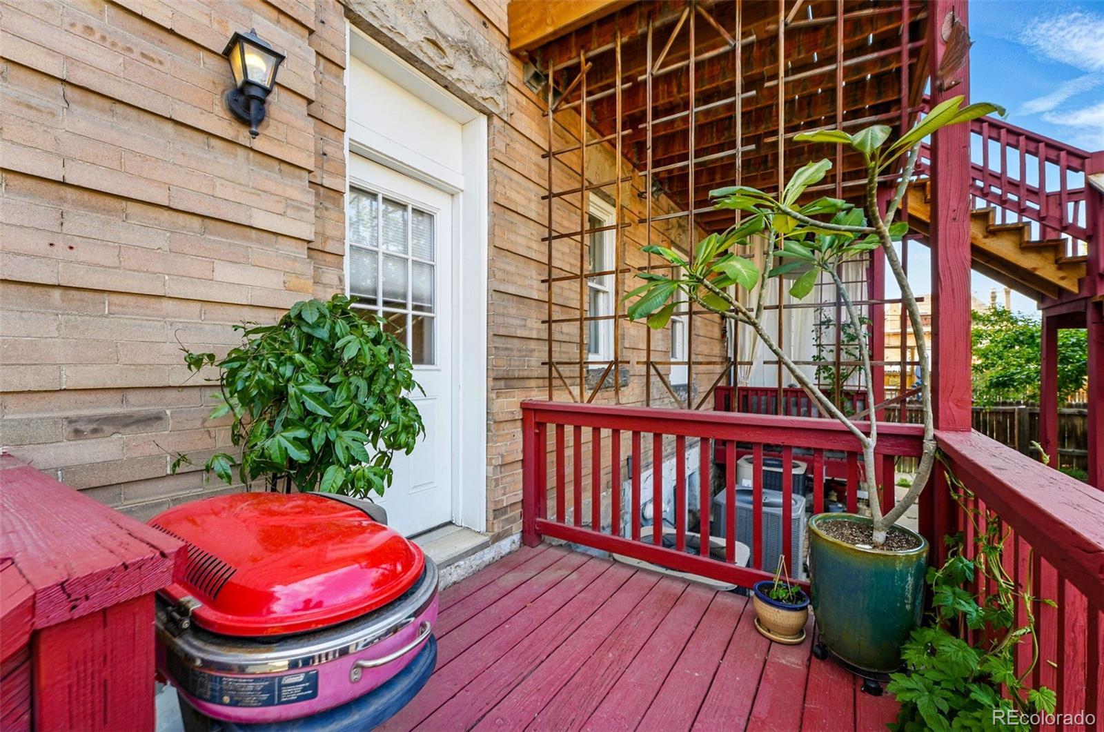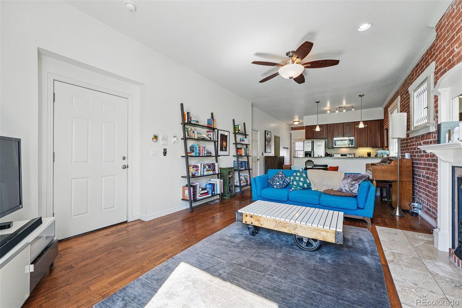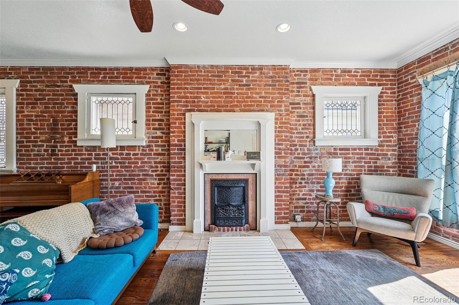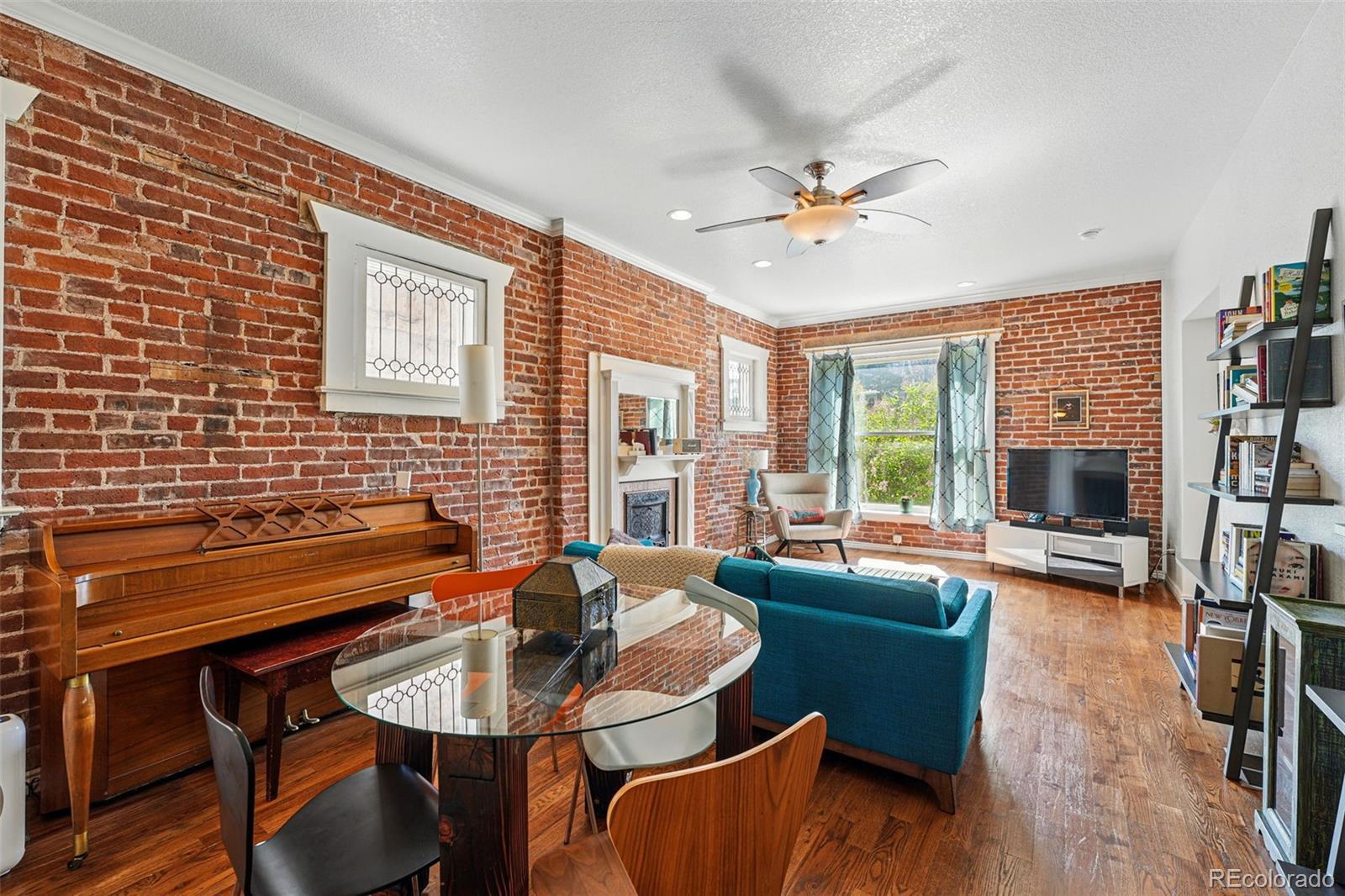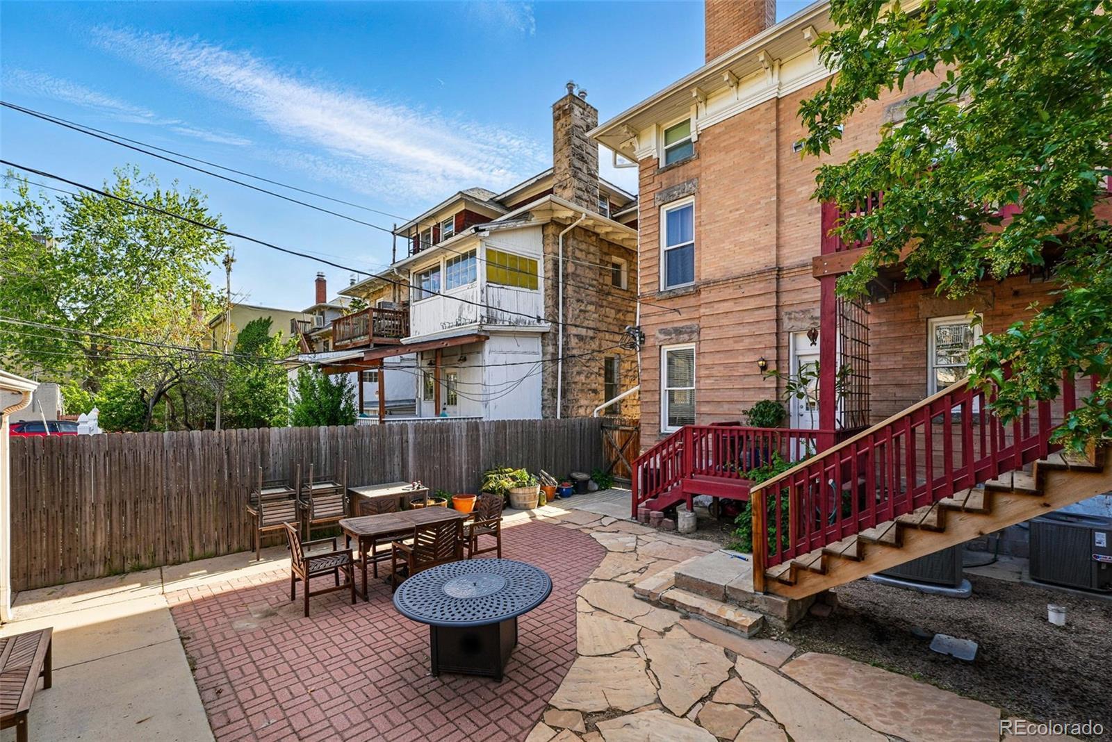 A rare gem in the historic Franklin Mansion! Built in 1898 and beautifully reimagined for today’s lifestyle, this home captures the best of Denver’s charm and modern convenience. The main level impresses with tall ceilings, oversized windows, rich hardwood floors, and exposed brick that highlights its timeless character. The inviting living space centers around an original fireplace mantle, flowing seamlessly into a stylishly updated kitchen featuring marble countertops, stainless steel appliances, and an undermount sink—perfect for entertaining or everyday comfort. A bright and spacious half bath on the main floor adds both convenience and charm. Downstairs, two generously sized bedrooms each feature their own fully remodeled en-suite bath, offering privacy and comfort for residents or guests. A dramatic two-story built-in bookshelf creates a stunning architectural focal point at the landing. Step out through your private rear entrance to enjoy your own deck, opening to a shared courtyard with a community garden, fire pit, and outdoor dining area—ideal for relaxing or gathering with neighbors. With a private garage and prime location just one block from Cheesman Park, this home is the perfect balance of historic soul and modern ease.
