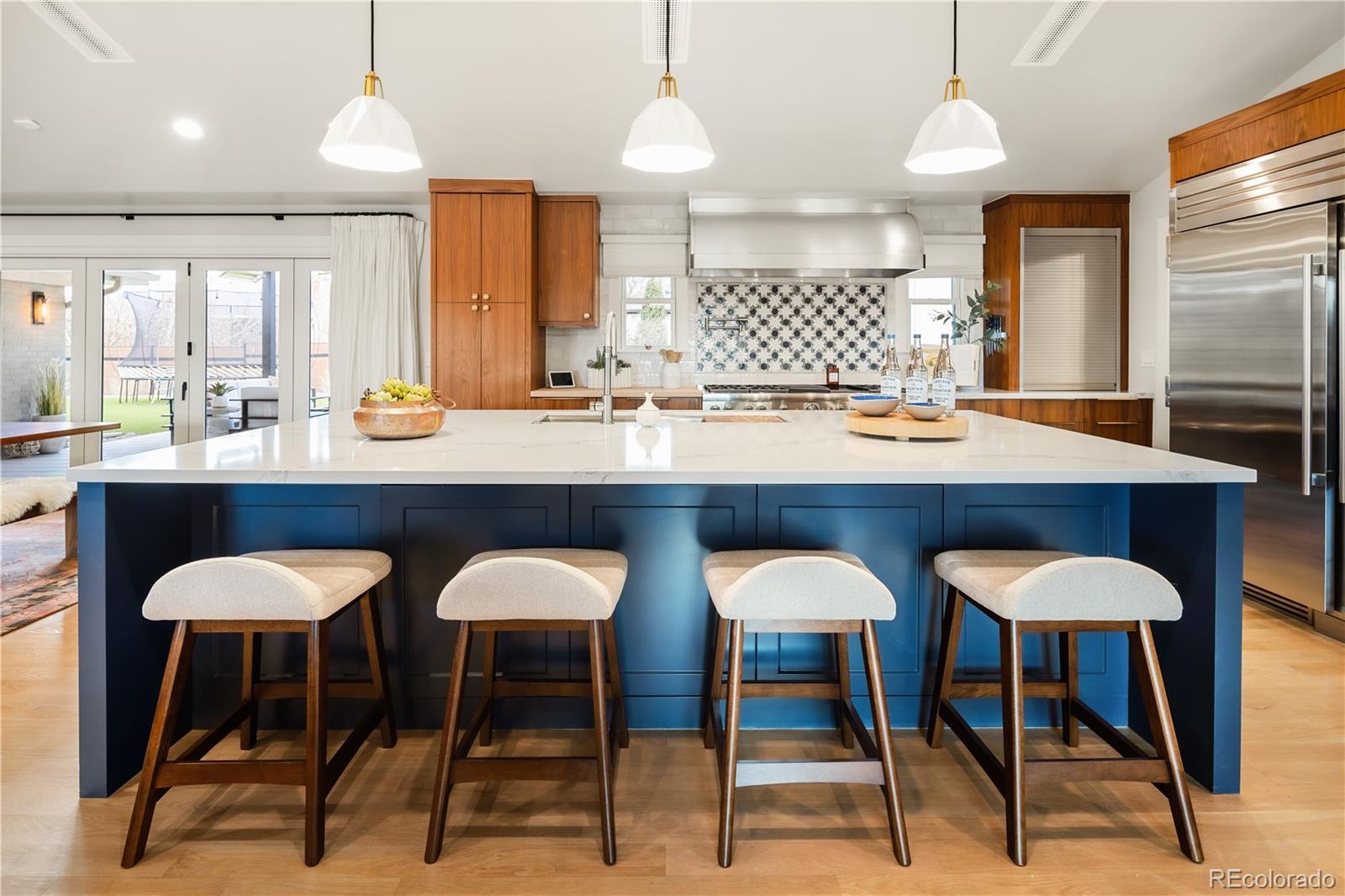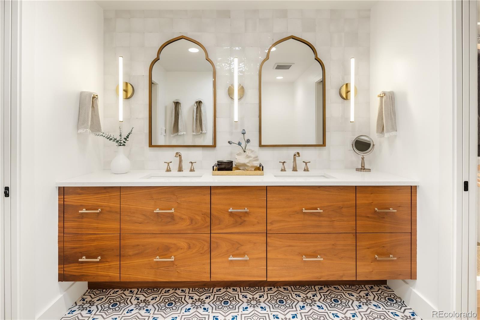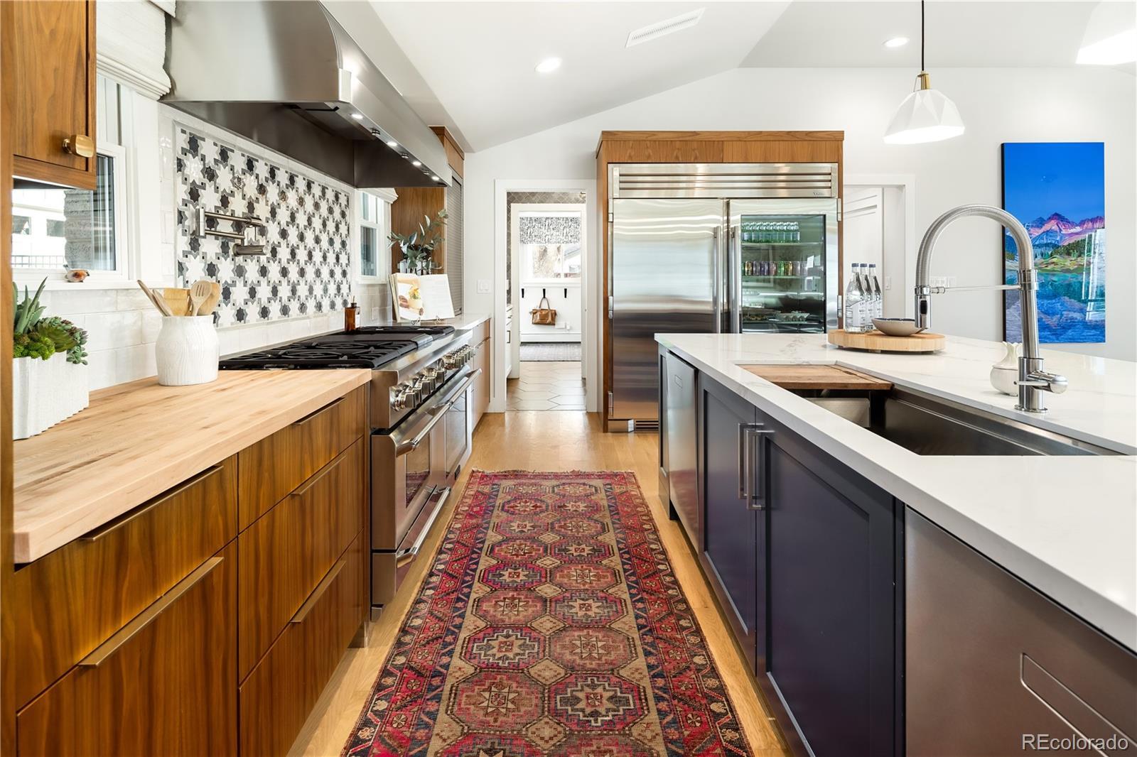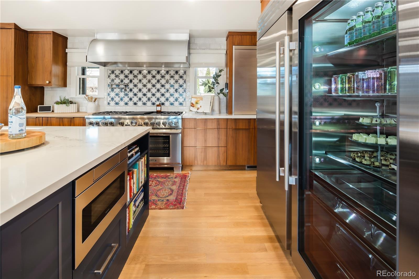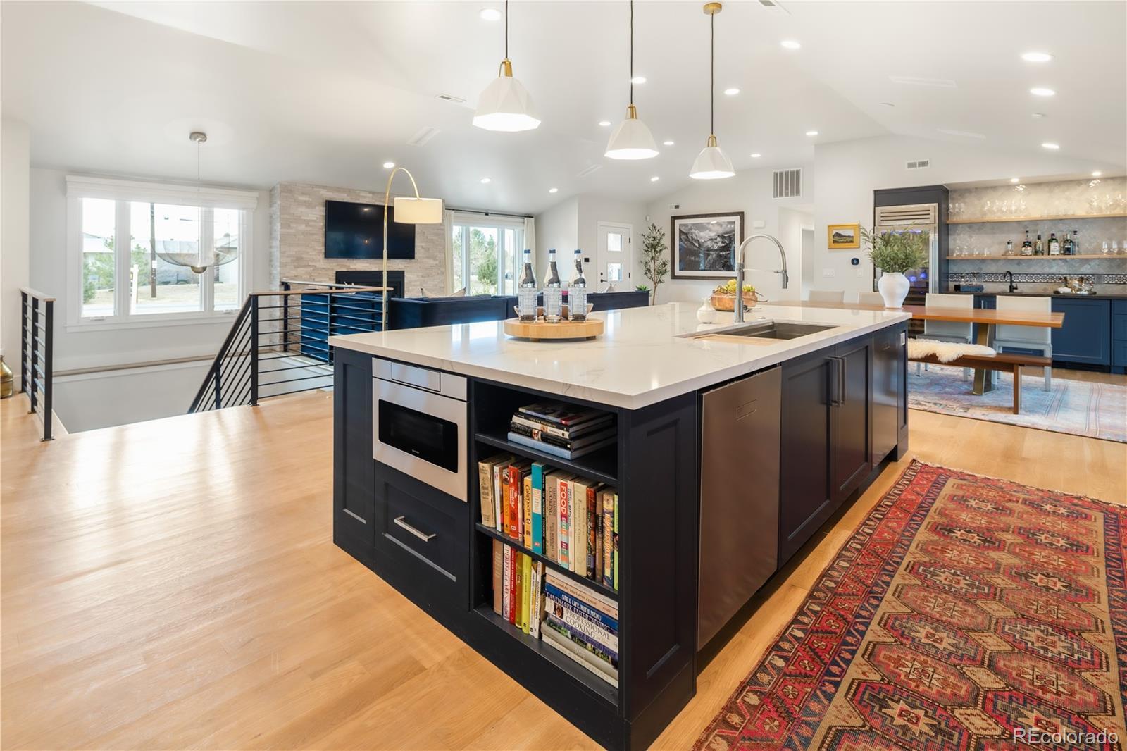 Thoughtfully curated, five bed/six bath masterful renovation. Two additional dens serve as convenient home offices. Vaulted ceiling great room with mountain views and custom floor-to-ceiling stone fireplace. With imported Moroccan Zellige tile, Ann Sacks and Delta selections, you will find no detail overlooked. Spacious main floor living and three zones for household members or guests, including four en suites with in-floor heat. Professional chef-designed kitchen with custom walnut cabinetry, pass through pantry with Elkay water dispenser, Thermador 60" Range, True Side by Side Refrigerator/Freezer, Vent-A-Hood and dual Asko dishwashers. Plenty of storage on three sides of the white quartz island. Stunning custom wet bar, complete with 150 bottle True wine refrigerator, integrated beverage center and Sub Zero ice machine. Perfect indoor-outdoor connection via accordion doors, which open onto the half-acre lot. Design aficionados will appreciate this zen oasis, complete with luxury hardscape, xeriscaping and modern Infinity Euro panel fencing (over 300K in exterior additions.) Elevated entertaining abounds with whole-house sound system which features high-end REL, Vienna Acoustics and BluSound speakers with BluSound amps, motorized louvered pergola, patio heaters, firepit, outdoor television, and low maintenance artificial turf. All televisions, Blusound sound bars and sound system are included. Massive ~1,000 square foot 3-car heated garage reaching 17 feet in height, custom cabinetry and room for year round hobbies. Modern efficiency with 26 owned Silfab 400-watt solar panels (10.4 kW system), a new Bryant 800SA high-efficiency heat pump (approx. 60% utility savings), full security system, Cat 6 wiring with three wifi hubs, Level exterior smart locks, epoxy garage floors, Chargepoint EV station, and even a dedicated dog wash—this is easy living in one of Denver’s most sought-after enclaves. Moments from Kent Denver School, St. Mary’s Academy & Denver Academy.