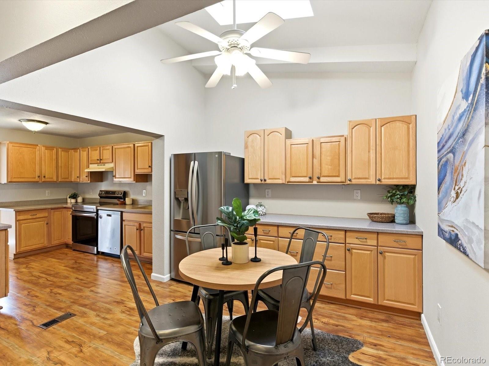 Welcome to this spacious two-story townhome located in the desirable Woodcrest neighborhood, offering comfort, functionality, and an unbeatable location. This 3-bedroom, 3 bath home features 1,778 square feet of thoughtfully designed living space, along with a two-car garage and a private front patio—perfect for relaxing or entertaining. As you enter the home, you are welcomed by a bright and comfortable living room on the main level, creating an inviting space to relax or host guests. The main floor continues into an extended kitchen filled with natural light from a skylight, complete with extra cabinet space, a large pantry, and a cozy breakfast nook area. A separate dining space provides the ideal setting for gatherings and everyday meals. A convenient half bathroom is also located on the main floor for guests. Along, with a Laundry room with built-in shelving, and a full size washer and dryer. Upstairs, you’ll find the primary bedroom along with two additional bedrooms and two full bathrooms. Also, in the basement there is a generous 457-square-foot versatile space, along with an additional room next to the utility closet—perfect for a home office, workout room, playroom, or extra storage. Recent updates include a brand-new A/C and furnace installed in 2024, new roof (June 2025), along with fresh interior paint and new carpet in 2026, making this home truly move-in ready. Conveniently located directly across from shopping and restaurants, this townhome also offers easy access—just minutes away—to Highway 70 for commuting and travel. The property is close to schools in the area, adding to its appeal for families and investors alike. Priced attractively, this move-in ready home provides exceptional space, updates, and location at a great value. Schedule a showing today!