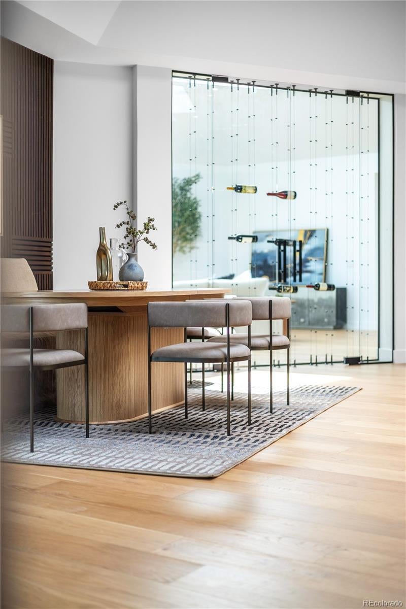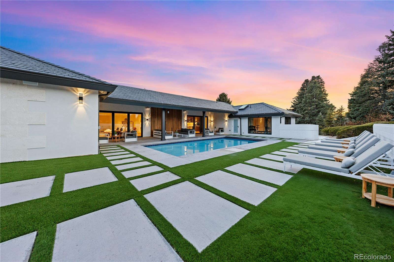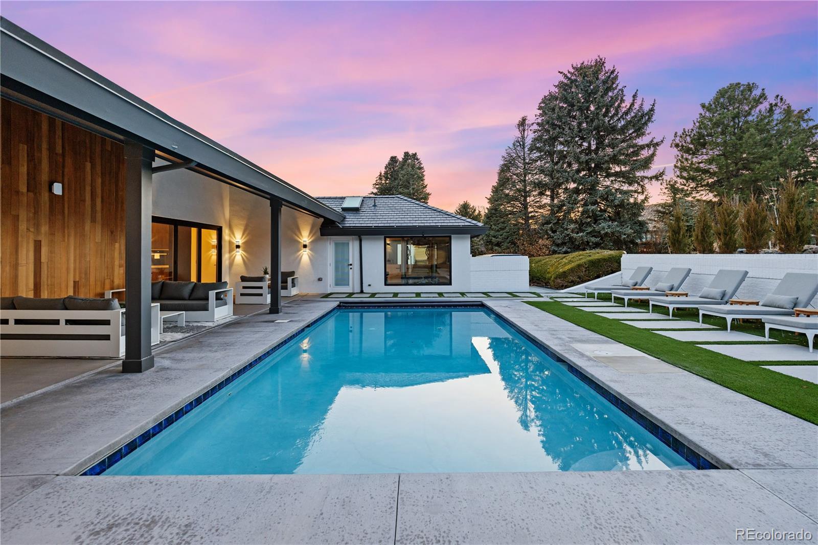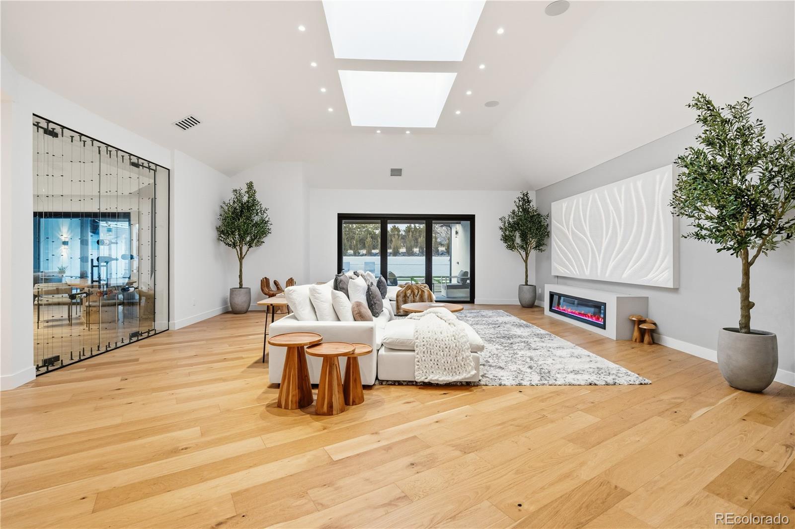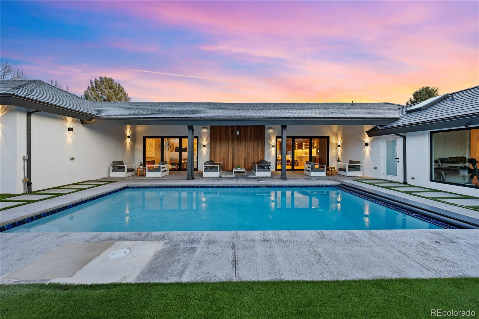 Welcome to an exceptional estate in the heart of Cherry Hills Village, where architectural sophistication, intentional design, and elevated living converge effortlessly. Set on a private one-acre setting, this light-filled residence offers a rare balance of presence and comfort, thoughtfully curated for discerning lifestyles. A striking solid wood pivot door opens to a grand travertine entry framed by soaring cathedral ceilings and skylights, immediately establishing refined elegance. The open main level is designed for both everyday living and polished entertaining. At its center, the chef’s kitchen features premium Miele appliances, sleek European flat-panel cabinetry, a concealed pantry, two integrated dishwashers, and seamless connection to the living and dining spaces. Accordion glass doors create a fluid indoor-outdoor experience, opening to a tranquil backyard retreat with pool, hot tub, turf, shaded patio, and expansive entertaining areas. The main-level primary suite is a private sanctuary, offering heated floors in the spa-inspired bathroom, elevated finishes, and a custom walk-in closet with a dedicated washer and dryer. Three additional en-suite bedrooms on the main level provide flexibility and comfort. The lower level is an entertainer’s destination, featuring an open lounge with fireplace, full bar, theater screen, a third dishwasher, and a dedicated ice maker. Two additional bedrooms, a full laundry room, and a spa-style bathroom with sauna and shower complete the space. Additional highlights include a Savant home technology system, a real wood fireplace, and exceptional craftsmanship throughout. Ideally positioned across from walking trail #6247, the property enjoys immediate access to Cherry Hills Village’s scenic path network. Defined by seamless indoor-outdoor living, refined execution, and elevated positioning, this is a legacy-level residence designed to stand apart.