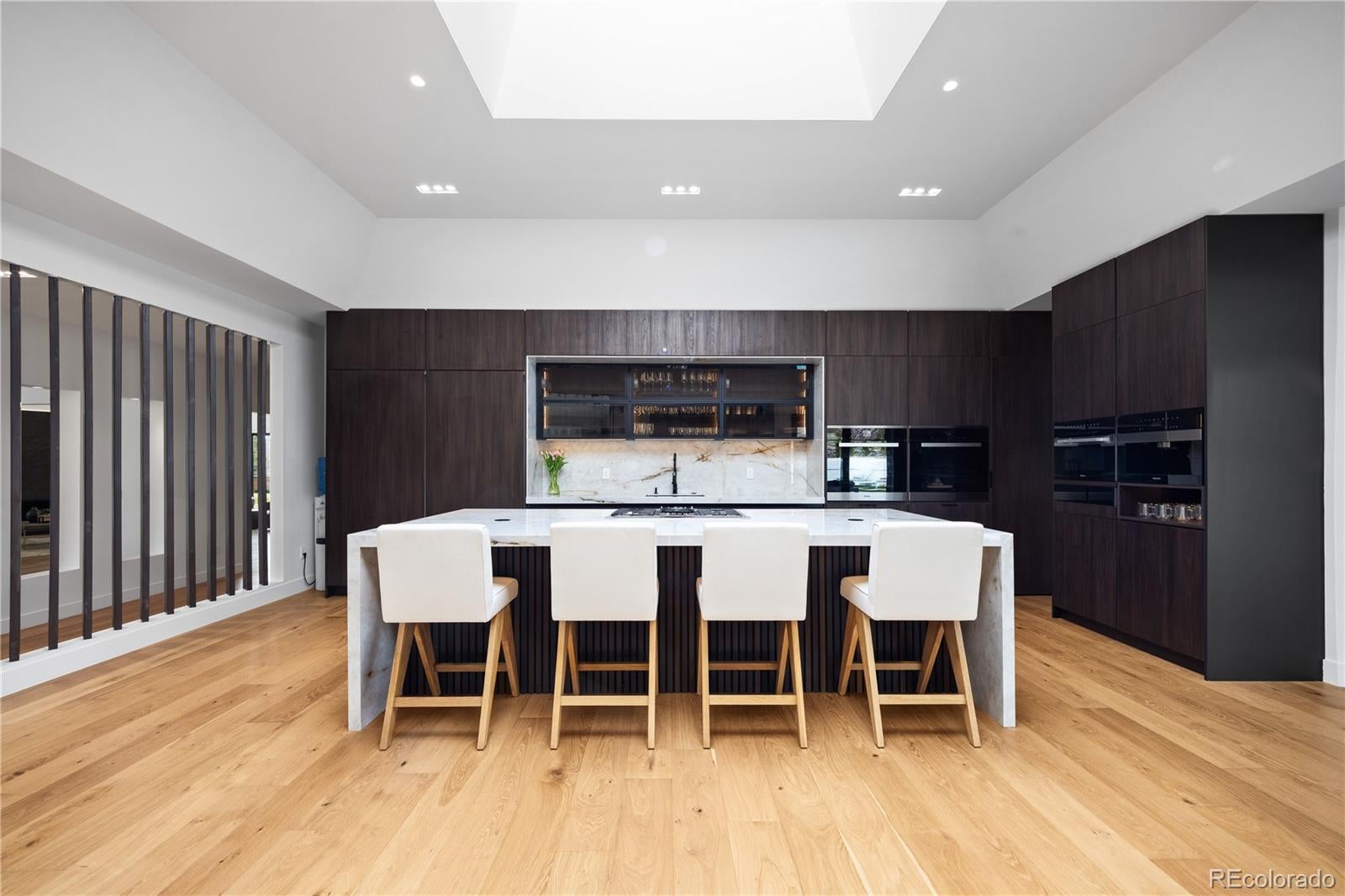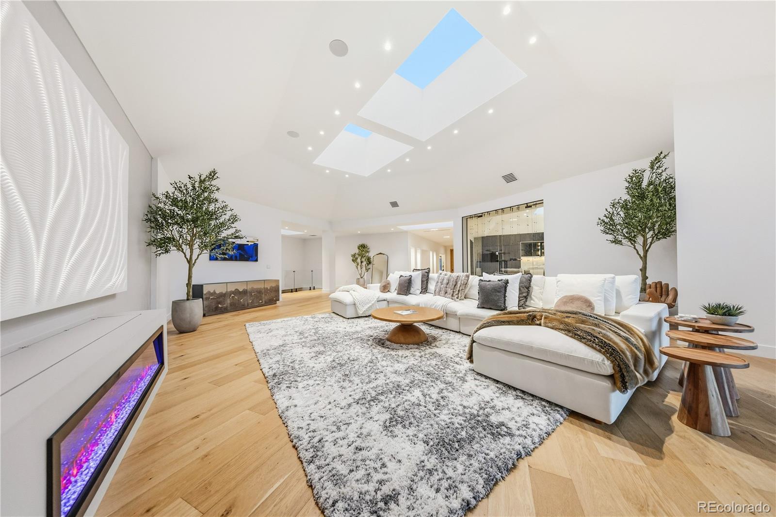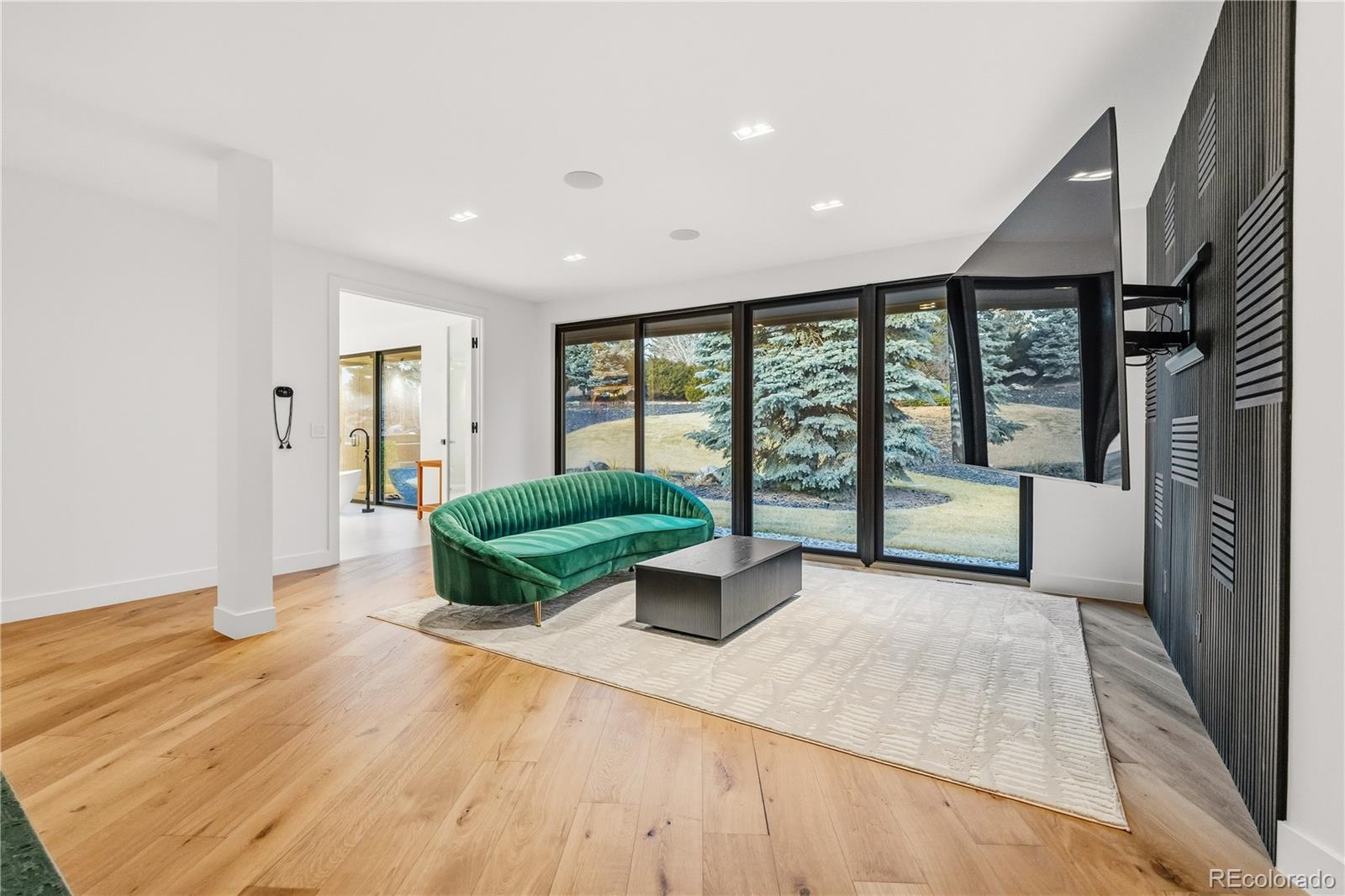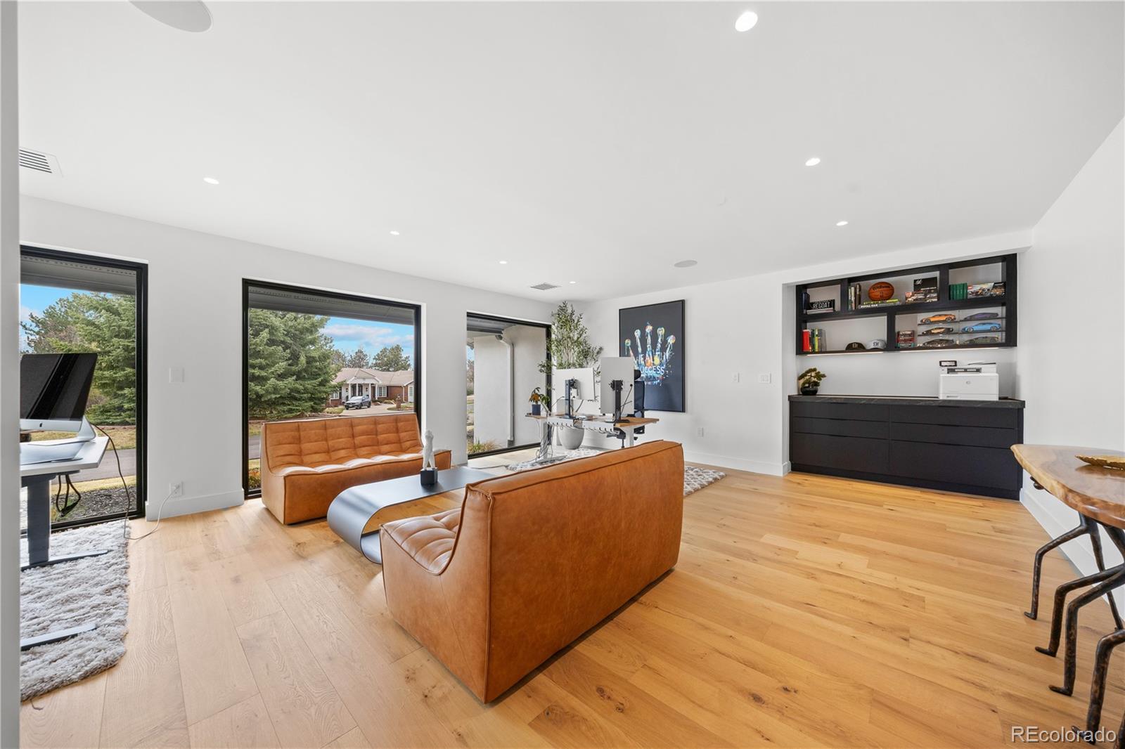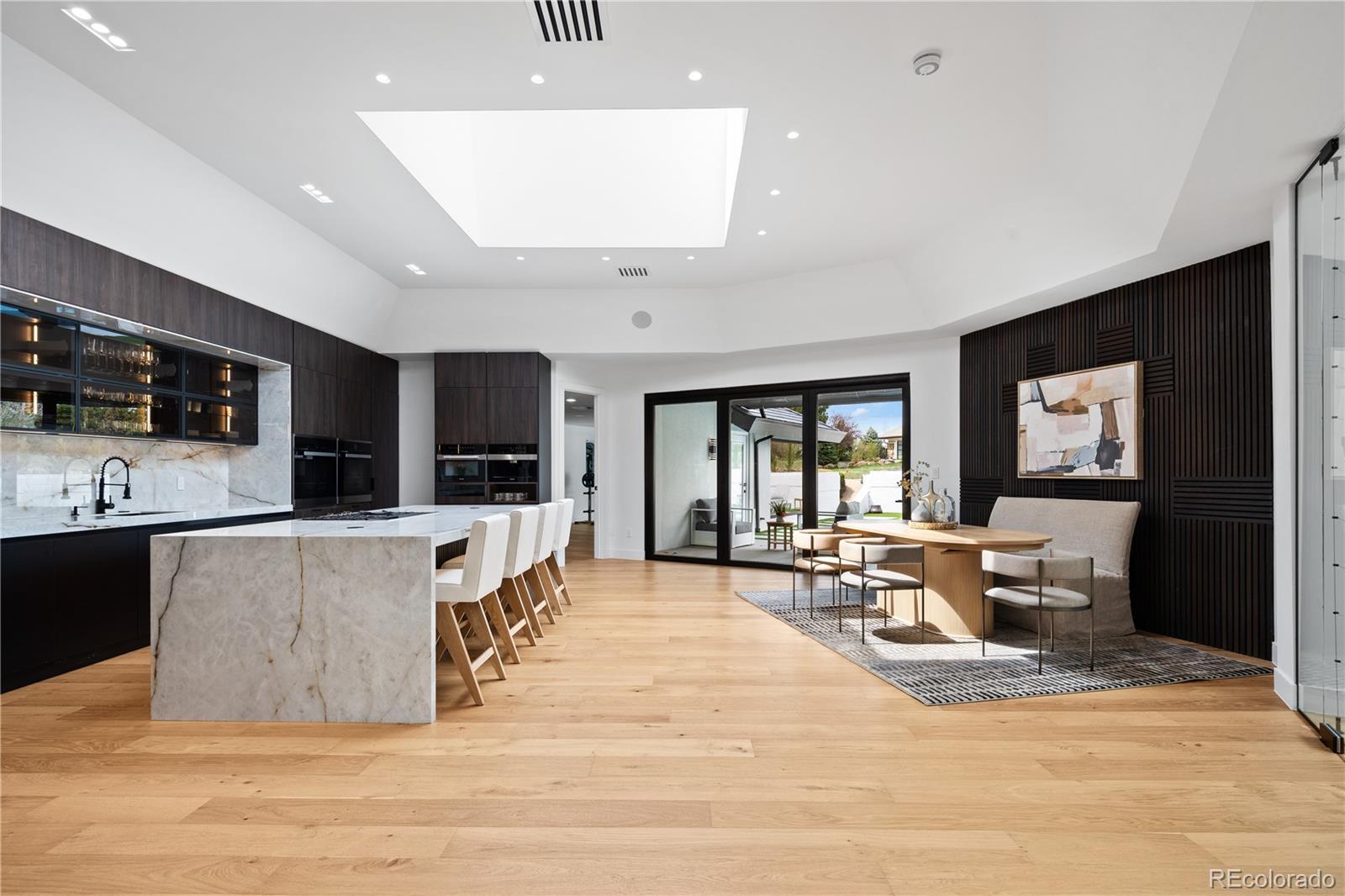 Welcome to an exceptional estate in the heart of Cherry Hills Village, where architectural sophistication, intentional design, and elevated living converge effortlessly. Set on a private one-acre setting, this light-filled residence offers a rare balance of presence and comfort, thoughtfully curated for discerning lifestyles. A striking solid wood pivot door opens to a grand travertine entry framed by soaring cathedral ceilings and skylights, immediately establishing refined elegance. The open main level is designed for both everyday living and polished entertaining. At its center, the chef’s kitchen features premium Miele appliances, sleek European flat-panel cabinetry, a concealed pantry, two integrated dishwashers, and seamless connection to the living and dining spaces. Accordion glass doors create a fluid indoor-outdoor experience, opening to a tranquil backyard retreat with pool, hot tub, turf, shaded patio, and expansive entertaining areas. The main-level primary suite is a private sanctuary, offering heated floors in the spa-inspired bathroom, elevated finishes, and a custom walk-in closet with a dedicated washer and dryer. Three additional en-suite bedrooms on the main level provide flexibility and comfort. The lower level is an entertainer’s destination, featuring an open lounge with fireplace, full bar, theater screen, a third dishwasher, and a dedicated ice maker. Two additional bedrooms, a full laundry room, and a spa-style bathroom with sauna and shower complete the space. Additional highlights include a Savant home technology system, a real wood fireplace, and exceptional craftsmanship throughout. Ideally positioned across from walking trail #6247, the property enjoys immediate access to Cherry Hills Village’s scenic path network. Defined by seamless indoor-outdoor living, refined execution, and elevated positioning, this is a legacy-level residence designed to stand apart.