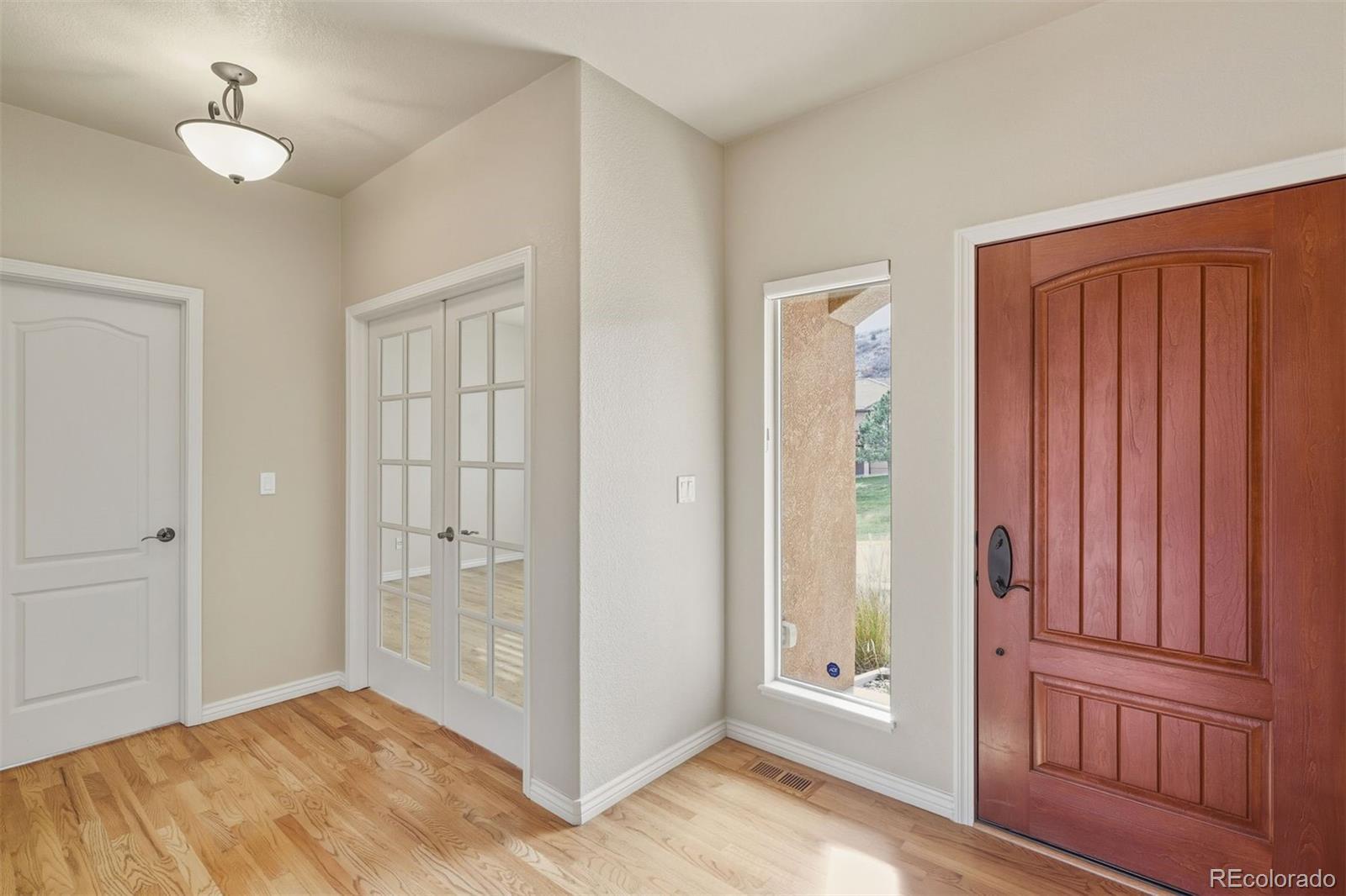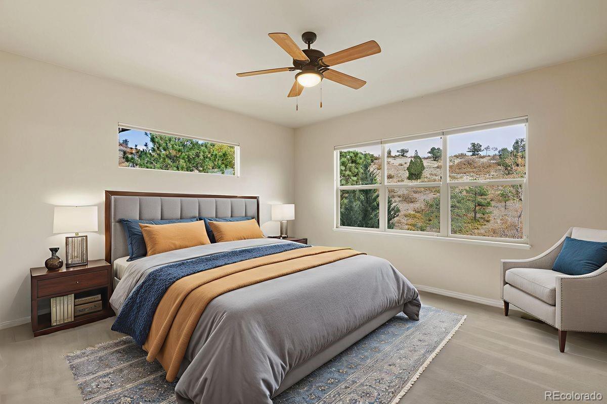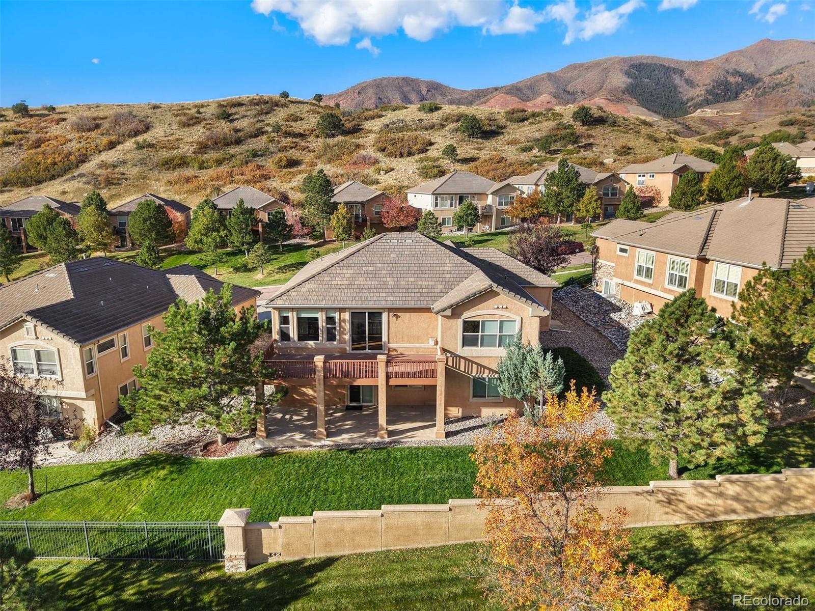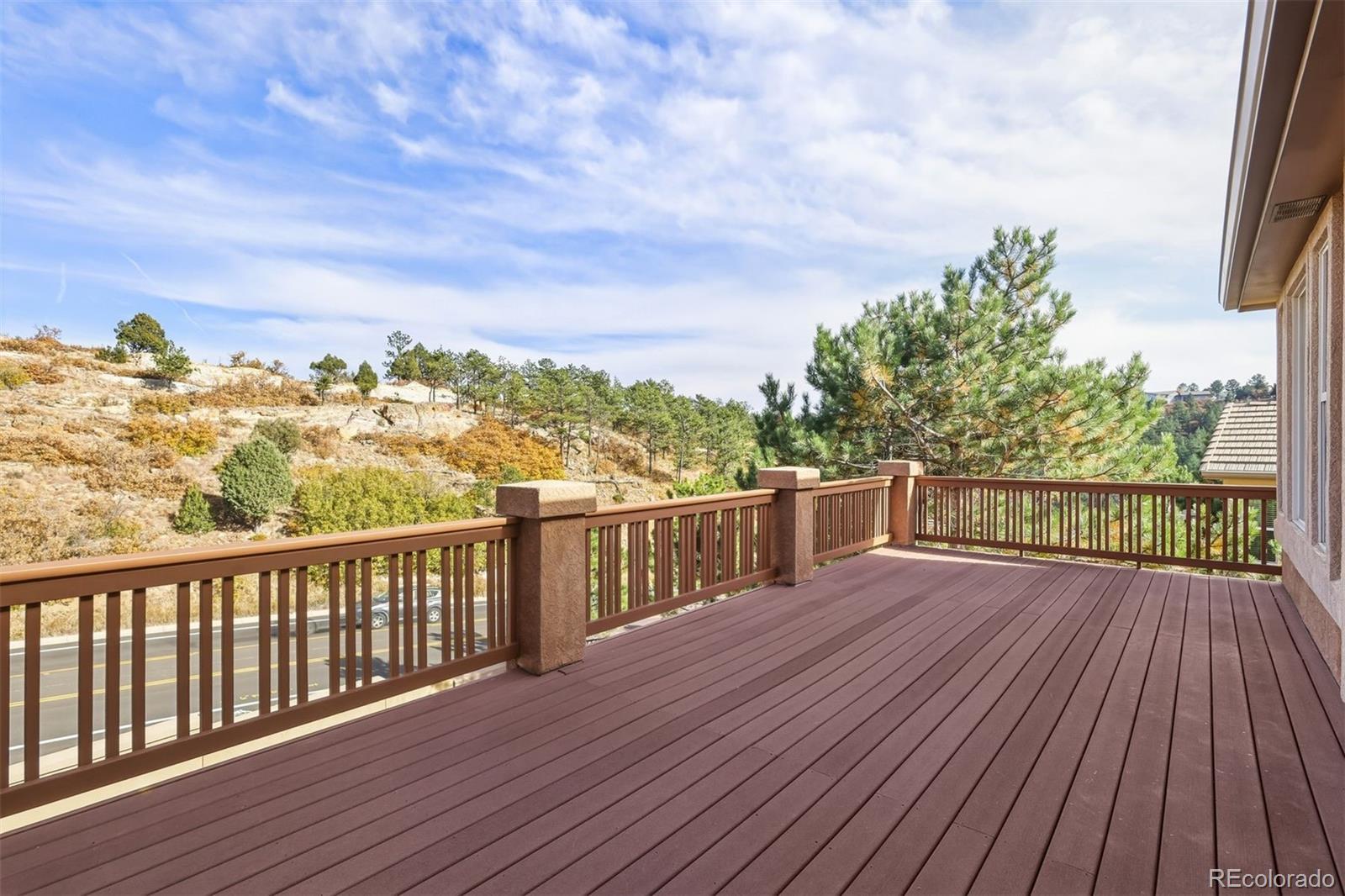 Stunning Ranch Style Home Backing to a Scenic Bluff in Sought-After Peregrine. Welcome home to this beautifully appointed ranch-style retreat offering four bedrooms, three bathrooms, and breathtaking views from every angle. The inviting kitchen features gleaming hardwood floors, granite countertops, stainless steel appliances including a gas range, a walk-in pantry, and an adjoining dining space perfect for everyday living or entertaining. The open-concept family room showcases a cozy gas fireplace, hardwood flooring, and seamless flow to the dining nook. The main-level primary suite is a true haven with a luxurious 5-piece bath featuring a walk-in shower and jetted soaking tub. Step out from the main level to the enclosed composite deck and take in the serene scenery of the bluff directly behind the home. A main-level office provides the perfect space for the stay-at-home professional. Downstairs, the finished walk-out basement offers three spacious bedrooms, a full bath, and a large recreation room with a wet bar, ideal for entertaining or movie nights. Walk out to the lower patio and enjoy the private backyard surrounded by natural beauty. Located in the highly desired Peregrine neighborhood, this home is within the award-winning Academy District 20 schools and just a short drive to the Air Force Academy, shopping, restaurants, and entertainment. Experience the perfect blend of comfort, elegance, and Colorado living at its finest.