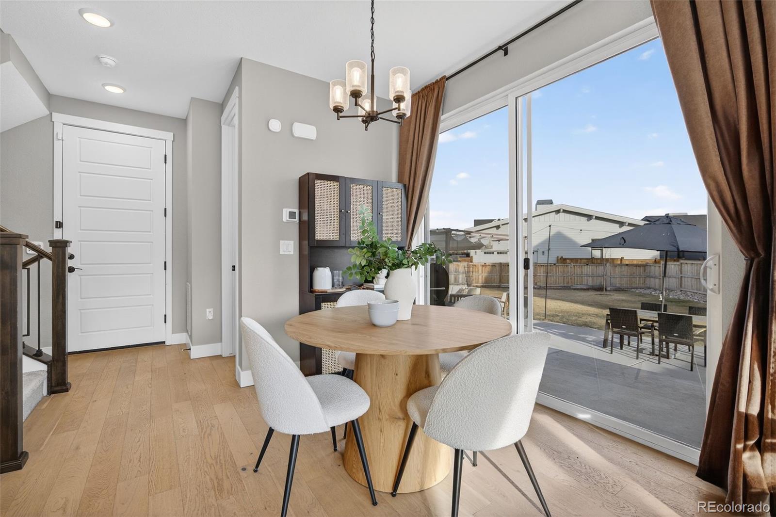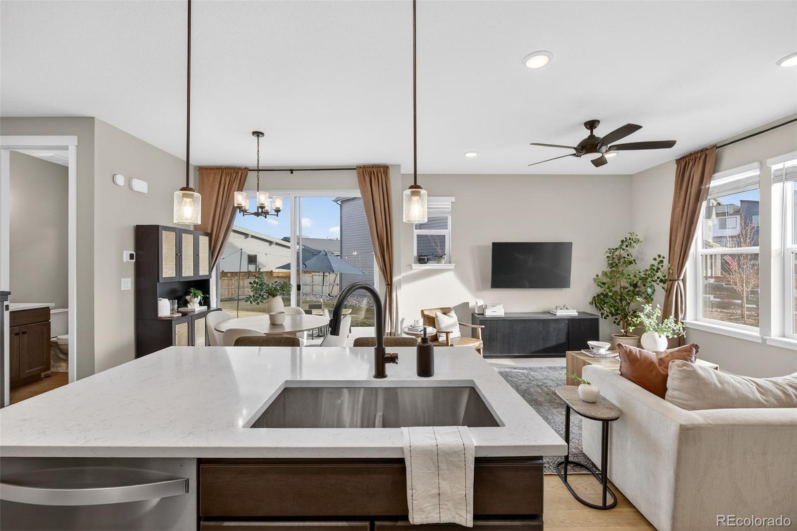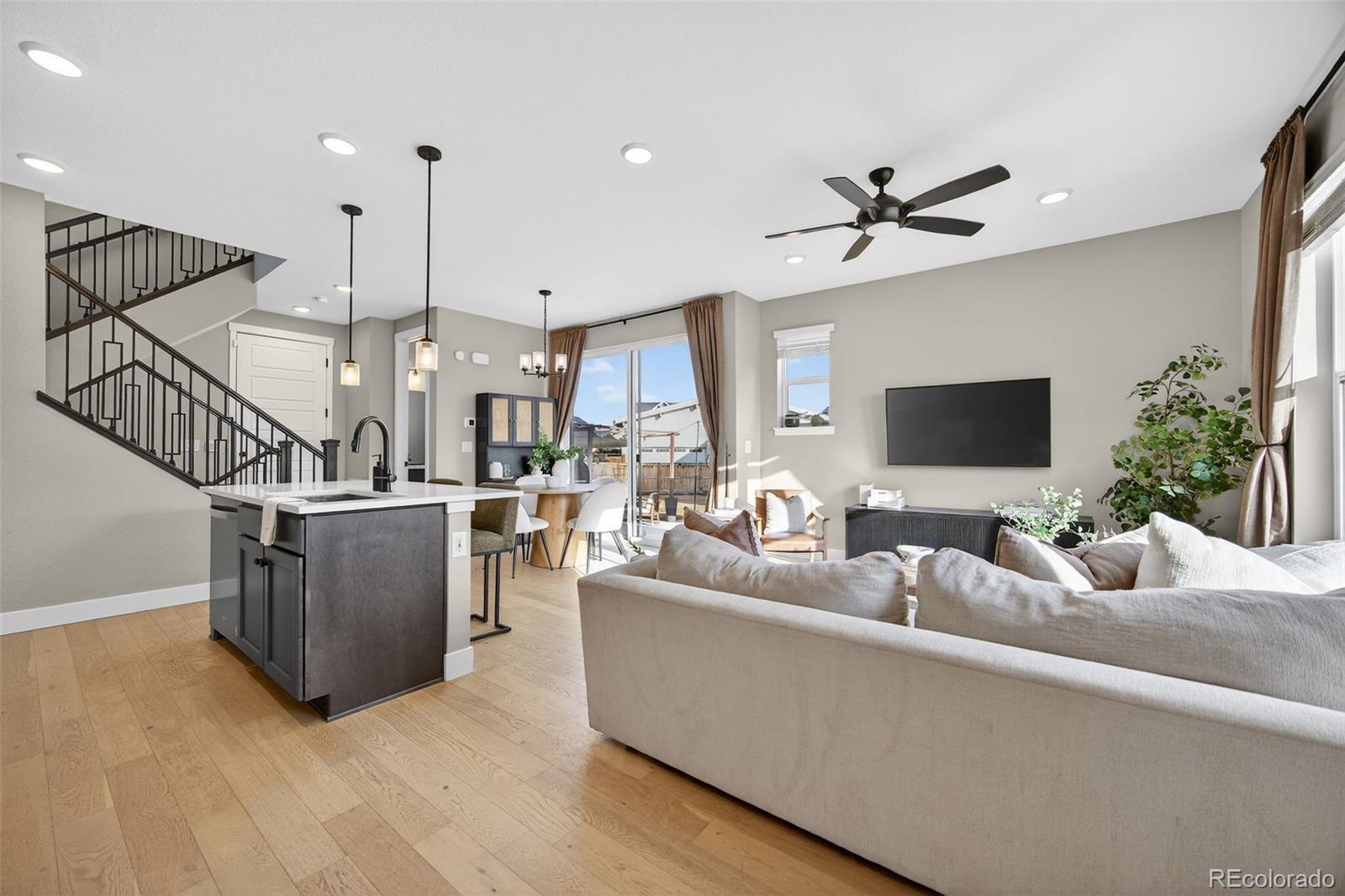 Bright, spacious, and move-in ready. This 3-bedroom, 4-bathroom home sits on one of the most desirable lots in Central Park. An airy, open-concept main level features light wood LVP flooring and oversized windows that flood the space with natural light. The sleek modern kitchen centers on a stylish island with contrasting dark cabinetry, white quartz counters, matte-black fixtures, pendant lighting, and stainless steel appliances, ideal for brunches and dinner parties. The adjacent dining area and sliding glass doors open to a fully fenced backyard and patio perfect for barbecues, bonfires, or lazy mornings with coffee. Upstairs are three bedrooms, a cozy office or reading nook, and a convenient laundry room. The primary suite feels like a mini-retreat with vaulted ceilings, large windows, a roomy walk-in closet, and a spa-like bathroom with dual vanities. A large finished basement with its own full bath serves as a fourth bedroom or a cozy hangout, so there is room for everyone. With a 2-car attached garage, high-end finishes, and a smart, livable floor plan, this house is ready for your next chapter!