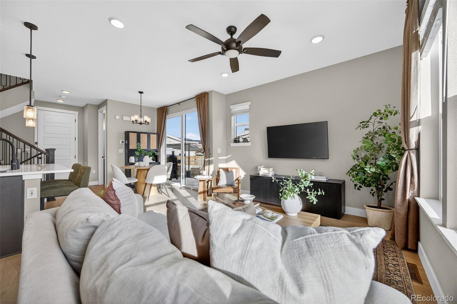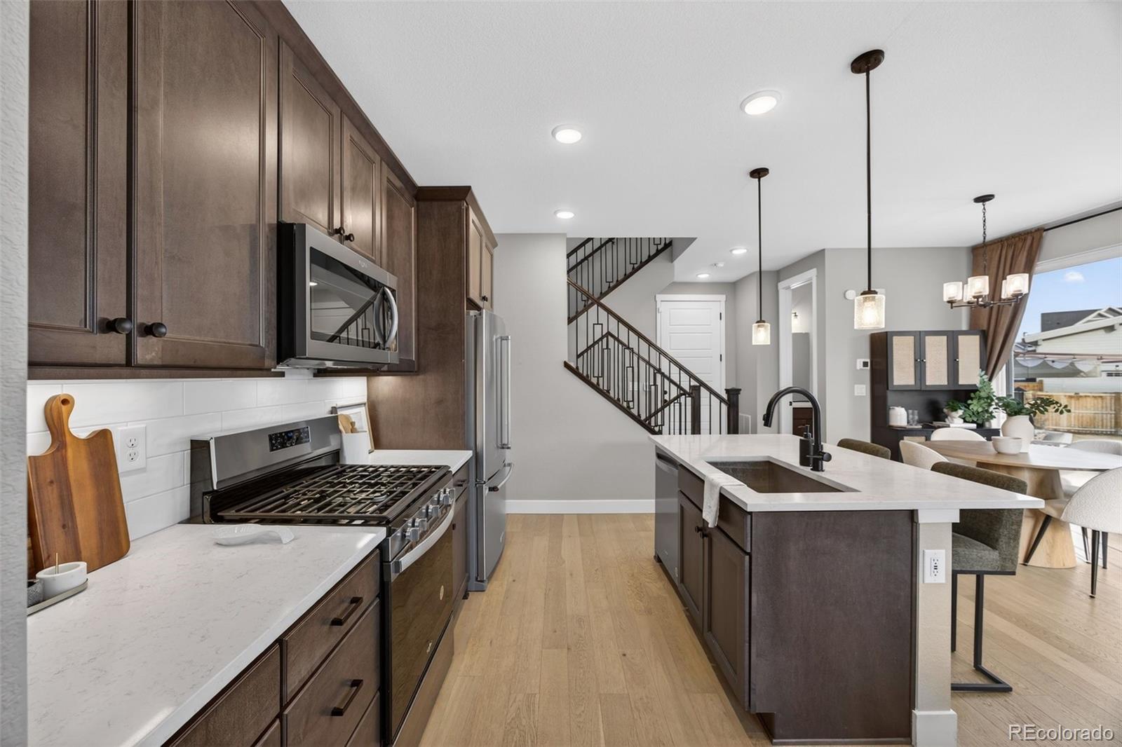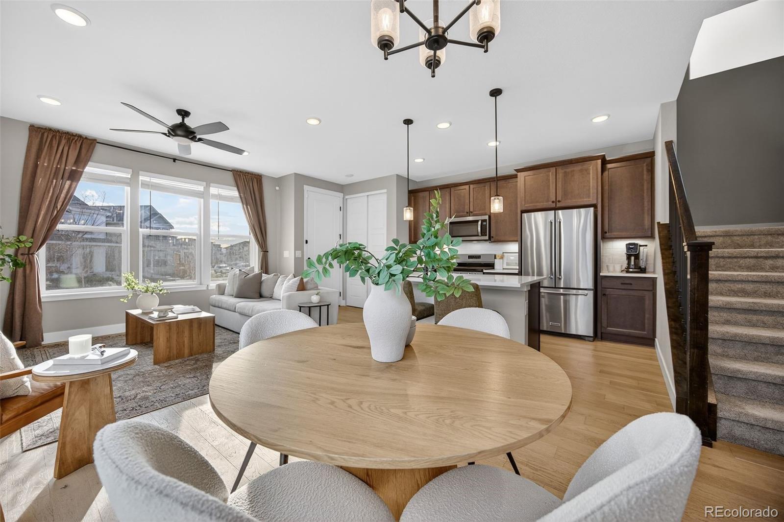 Bright, spacious, and move-in ready. This 3-bedroom, 4-bathroom home sits on one of the most desirable lots in Central Park. An airy, open-concept main level features light wood LVP flooring and oversized windows that flood the space with natural light. The sleek modern kitchen centers on a stylish island with contrasting dark cabinetry, white quartz counters, matte-black fixtures, pendant lighting, and stainless steel appliances, ideal for brunches and dinner parties. The adjacent dining area and sliding glass doors open to a fully fenced backyard and patio perfect for barbecues, bonfires, or lazy mornings with coffee. Upstairs are three bedrooms, a cozy office or reading nook, and a convenient laundry room. The primary suite feels like a mini-retreat with vaulted ceilings, large windows, a roomy walk-in closet, and a spa-like bathroom with dual vanities. A large finished basement with its own full bath serves as a fourth bedroom or a cozy hangout, so there is room for everyone. With a 2-car attached garage, high-end finishes, and a smart, livable floor plan, this house is ready for your next chapter!