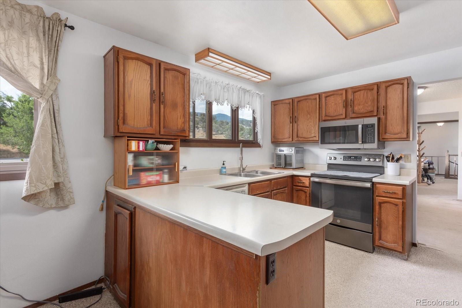 Nestled on 3.5 acres on Methodist Mountain, this home captures some of the best valley and Collegiate Peaks views, with a peaceful ditch running through the property. The main level features a welcoming foyer that opens into a spacious living room with a striking river stone wood-burning fireplace and access to a balcony perfect for taking in the scenery. A designated dining room connects to the kitchen, which offers a breakfast nook, island, stove with built-in microwave, garbage disposal, and a bar area. The kitchen also provides access to the garage—complete with a workbench and built-in shelves—as well as to the downstairs level and hallway leading to the bedrooms. The primary suite includes a private full bath and balcony access, while the second bedroom enjoys stunning mountain views. A full guest bath completes the main level. The finished basement, accessible by a spiral staircase from the living room or stairs from the kitchen, offers a second living room with a wood-burning stove and walkout to a covered back patio, two additional bedrooms, a bonus office or exercise room, a half bath, and laundry area. Additional outdoor features include a storage shed, two balconies, and a covered patio—offering multiple spots to unwind or entertain. With no HOA and easy access to the Methodist Mountain Trail System, this home combines freedom, privacy, and adventure in one unforgettable setting.