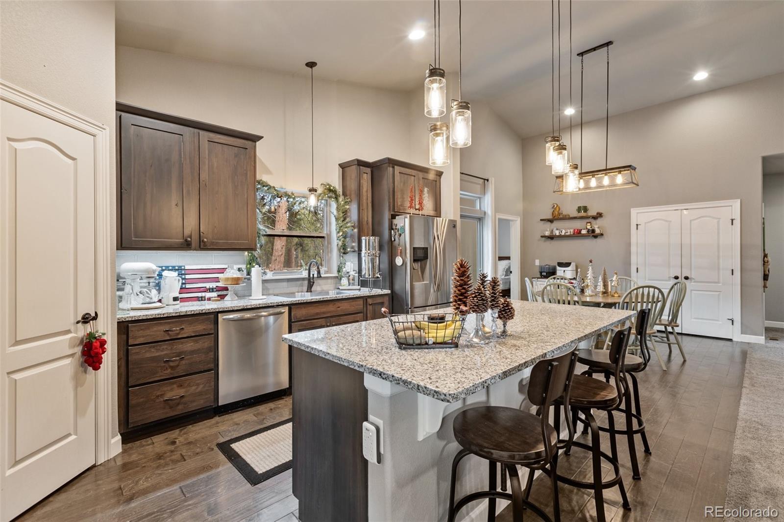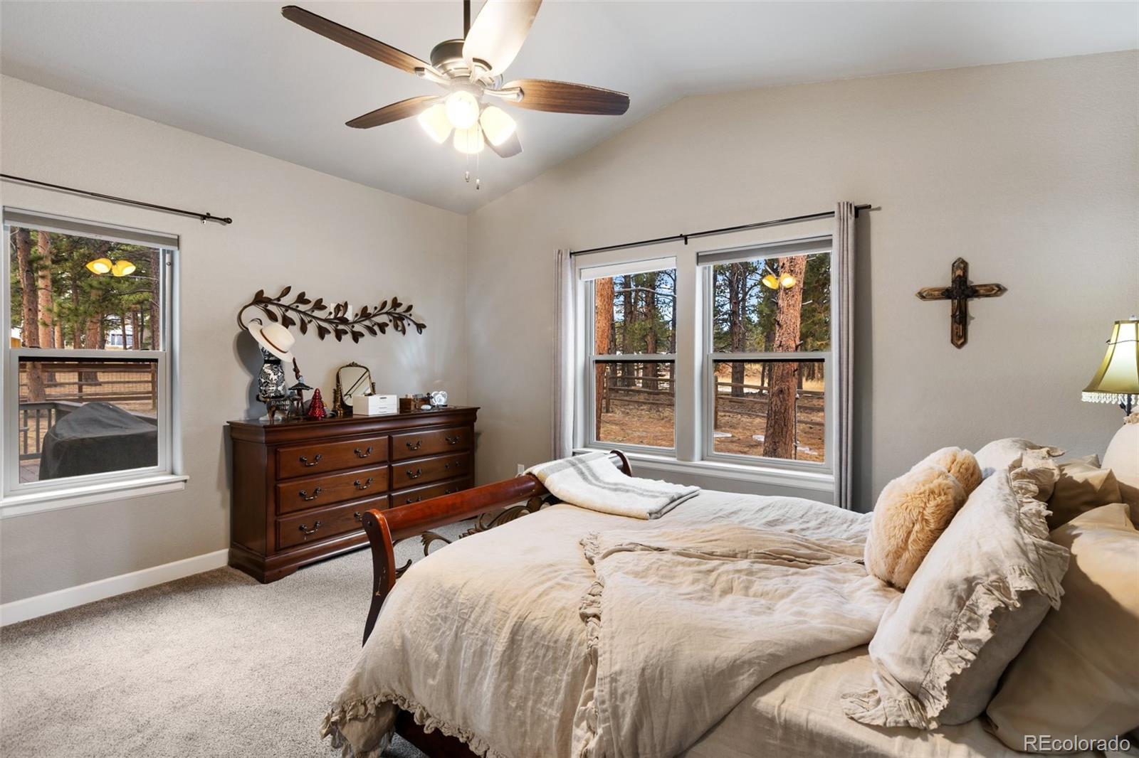 Well-maintained one-level ranch-style home with low maintenance stucco exterior in Woodland Park. Located in the highly desirable and sought after neighborhood in Stone Ridge Village offering new, and semi-custom built homes. This 1,642 sq ft 3-bedroom, 2-bath home offers a functional single-level layout with vaulted ceilings in the great room, offering engineered hardwood floors. Large kitchen overlooks the living area, and is equipped with a huge center island with counter-bar seating, solid granite countertops, and stainless appliances. The living area is comfortably set-up with a masonry stone wall natural gas fireplace at the focal point of room, making for cozy entertaining and a relaxing space! Dining area adjacent the kitchen walks out to a level fenced backyard with plenty of space for outdoor use, gardening, or entertaining, patio area. Owners suite is located at the rear of the home, nicely sized, adjoining a 4 pc. bathroom adjacent a walk-in closet. 2 additional bedrooms are served by a full hall bathroom. Located within the Woodland Park School District and situated in a convenient location with easy access to local amenities, this home offers comfortable mountain living with everyday practicality. Only 5 minutes from grocery shopping, restaurants, and coffee shops!