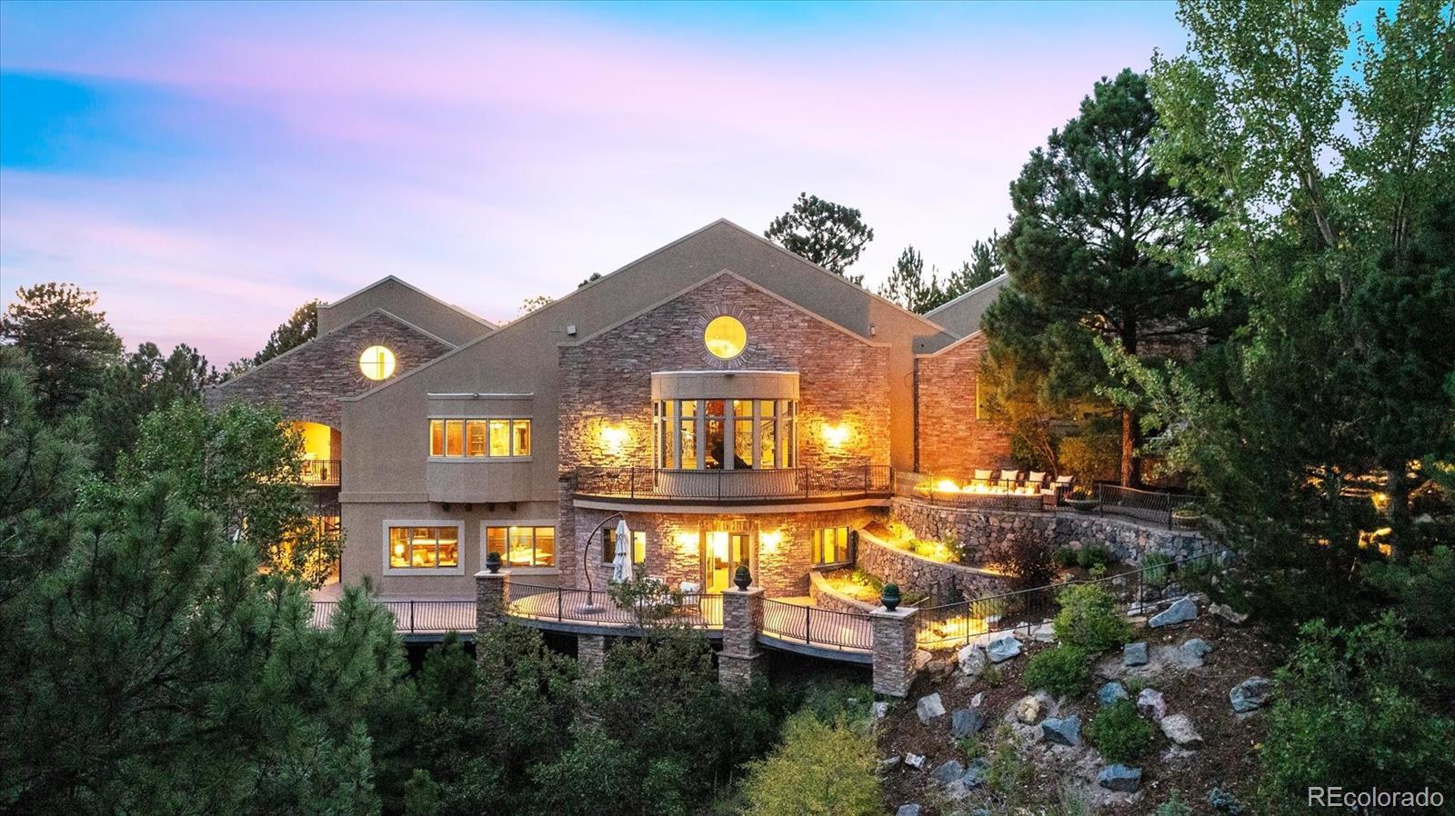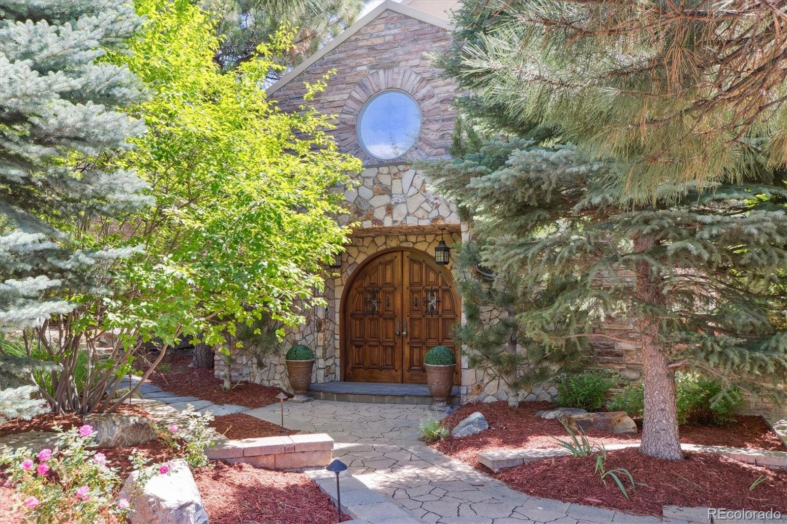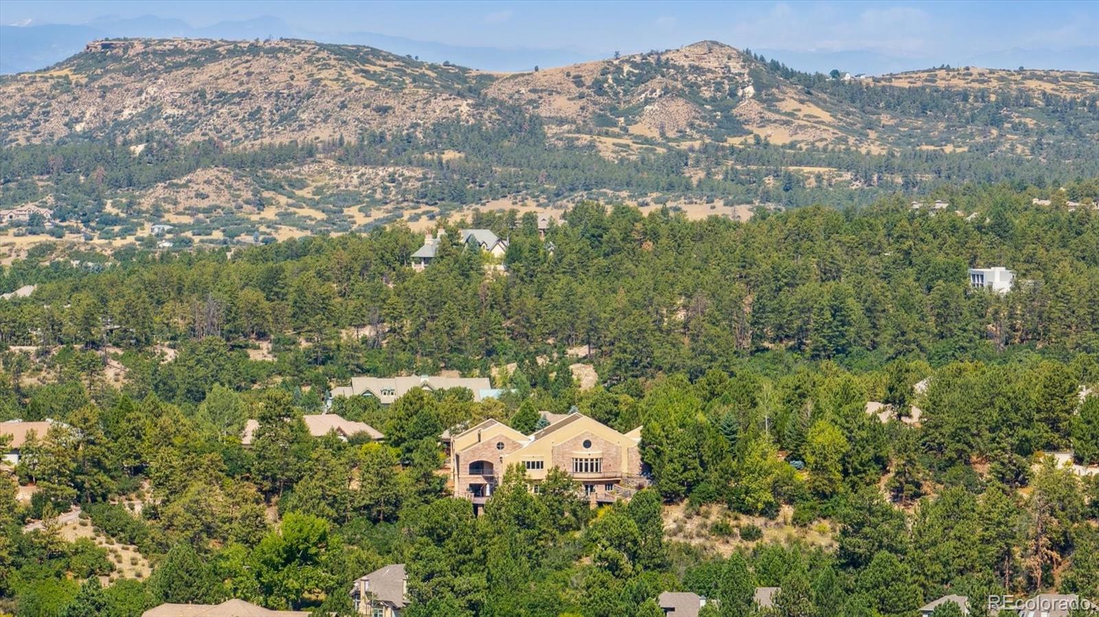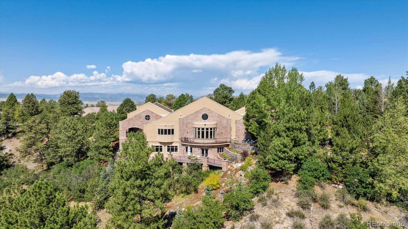 Spectacular Views & Unparalleled Luxury in Castle Pines Village. Nestled on a serene 1.75-acre wooded lot in the exclusive Castle Pines Village, this custom estate offers the perfect blend of privacy, elegance, and breathtaking views. From the moment you step inside, you are greeted by a stunning entryway and exquisite custom woodwork that set the tone for the home’s timeless charm. The great room, highlighted by soaring wood cathedral ceilings and walls of windows, frames panoramic mountain views and flows seamlessly into the gourmet kitchen. Designed for both everyday living and entertaining, the kitchen features top-of-the-line appliances, a large center island, and an adjacent 300-bottle wine cellar. A formal dining room provides an elegant space for gatherings, while multiple living areas invite comfort and relaxation. The primary suite is a true retreat, offering dramatic views, a spa-inspired bath with heated floors, infinity tub, steam shower, and a custom wardrobe dressing room. Each of the spacious secondary bedrooms features en suite baths, and a private guest suite with deck access ensures comfort for visitors. Designed for entertainment, this home includes a bonus room with a pub-style bar and billiards, a theater room, and a private office with custom built-ins. A cozy den with a grand fireplace provides yet another inviting living space. Step outside to experience unbelievable outdoor living with multiple decks overlooking the treetops and mountains, a fire pit, hot tub spa, and a beautifully landscaped private yard. This rare Castle Pines Village retreat combines luxurious living with Colorado’s natural beauty. Fantastic gated community with swimming, tennis, fitness center trails and Security rate access to restaurants and shopping.
