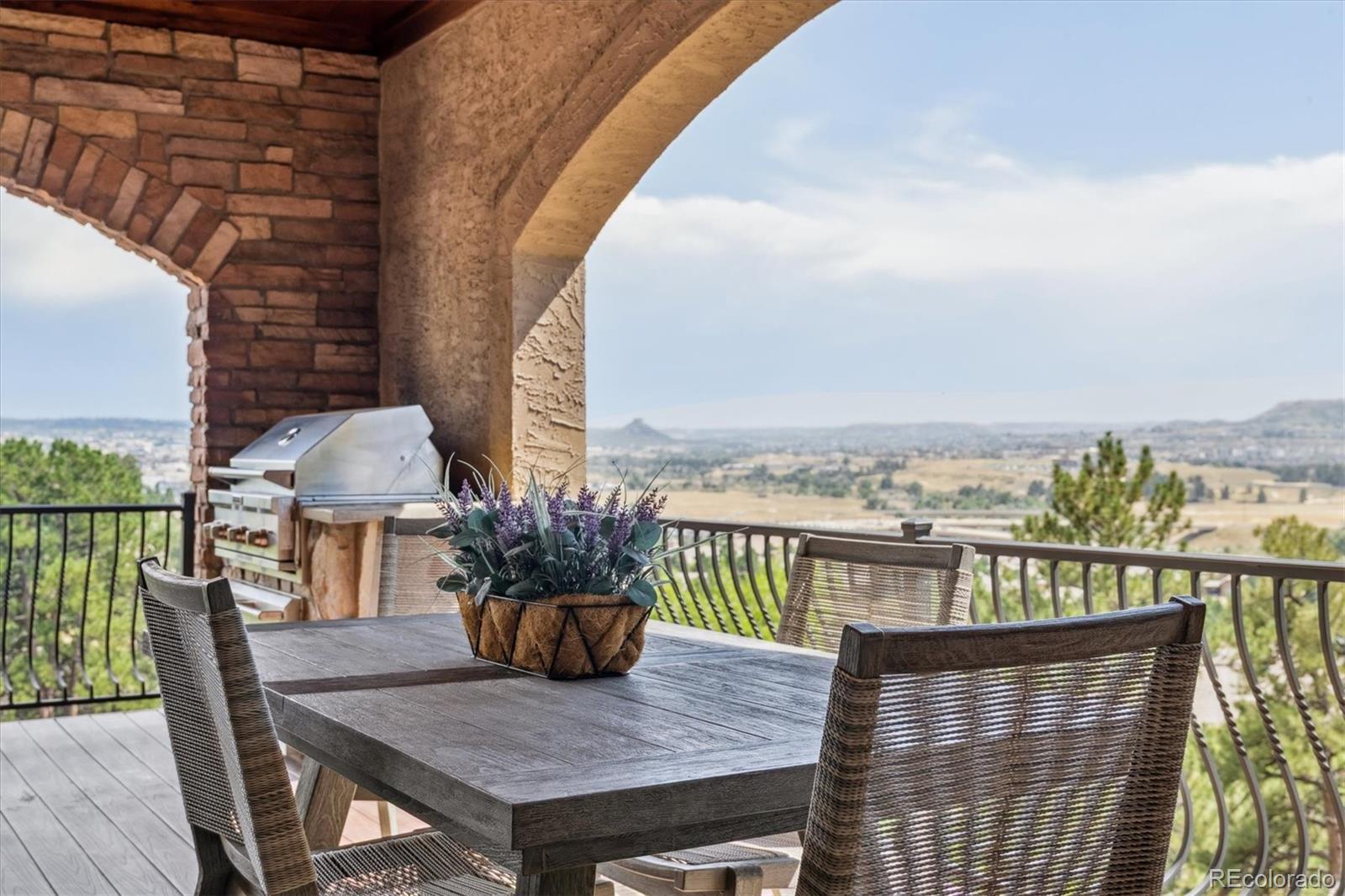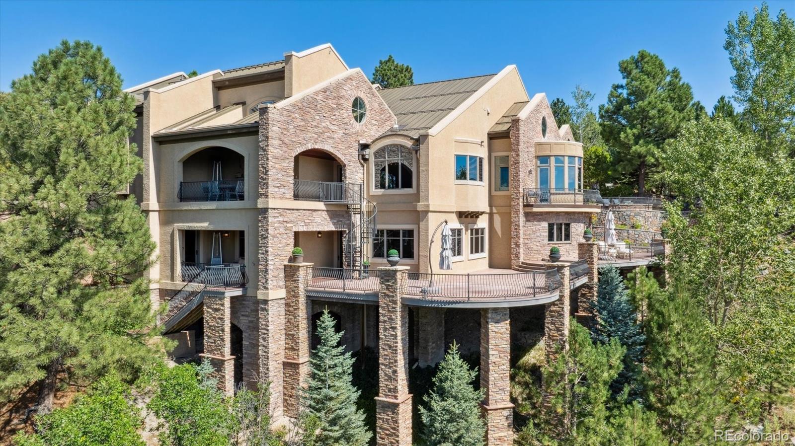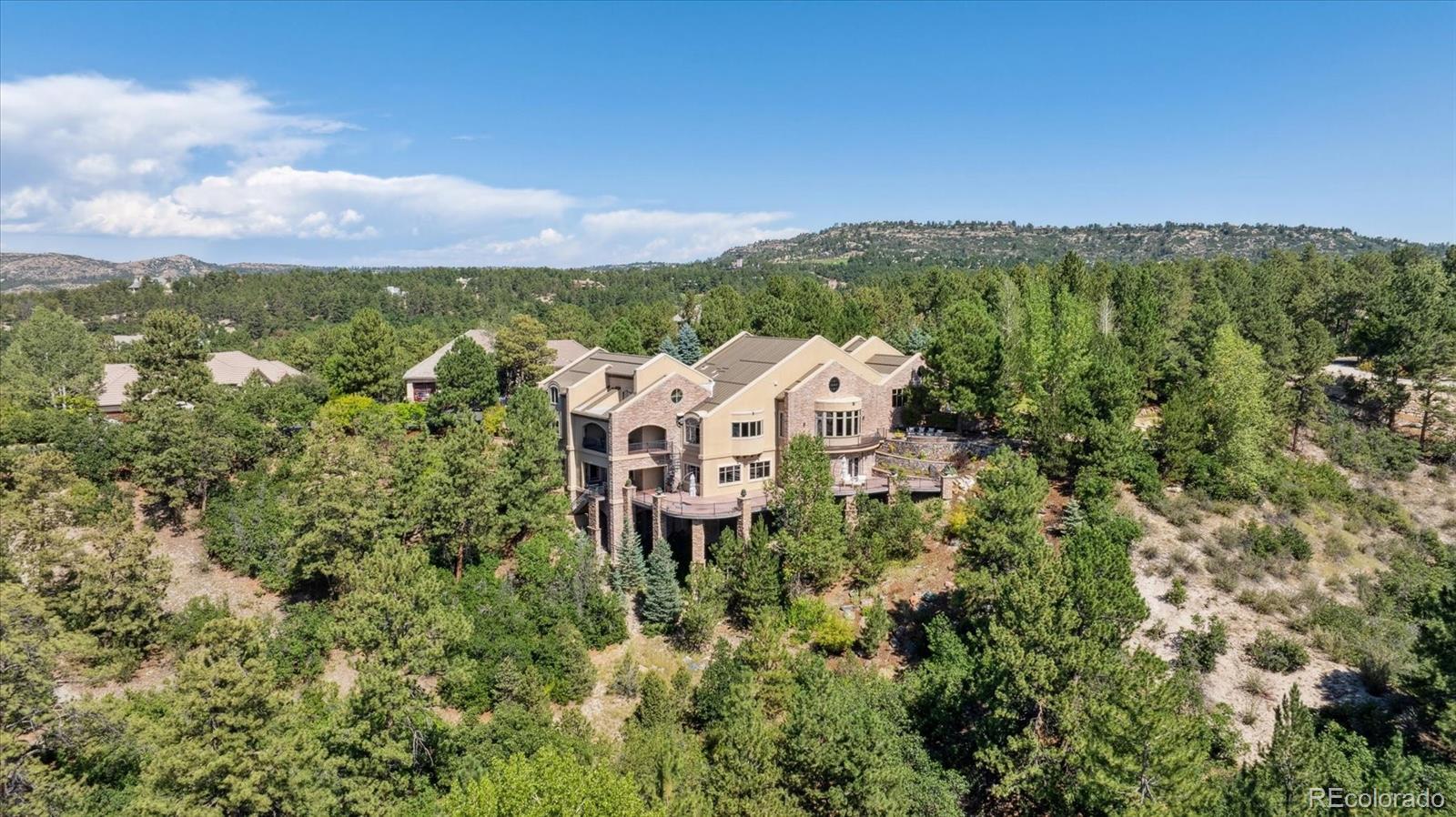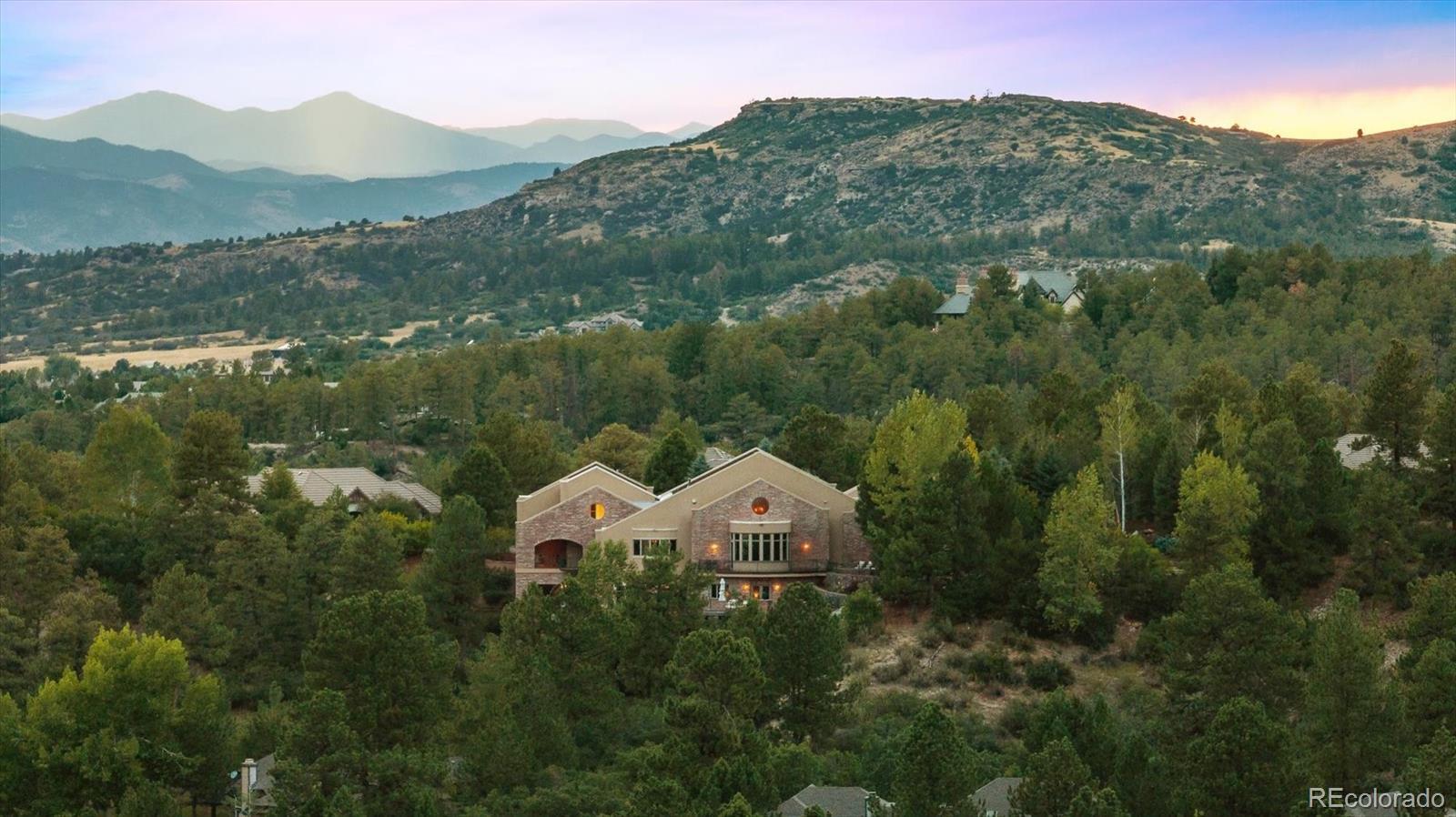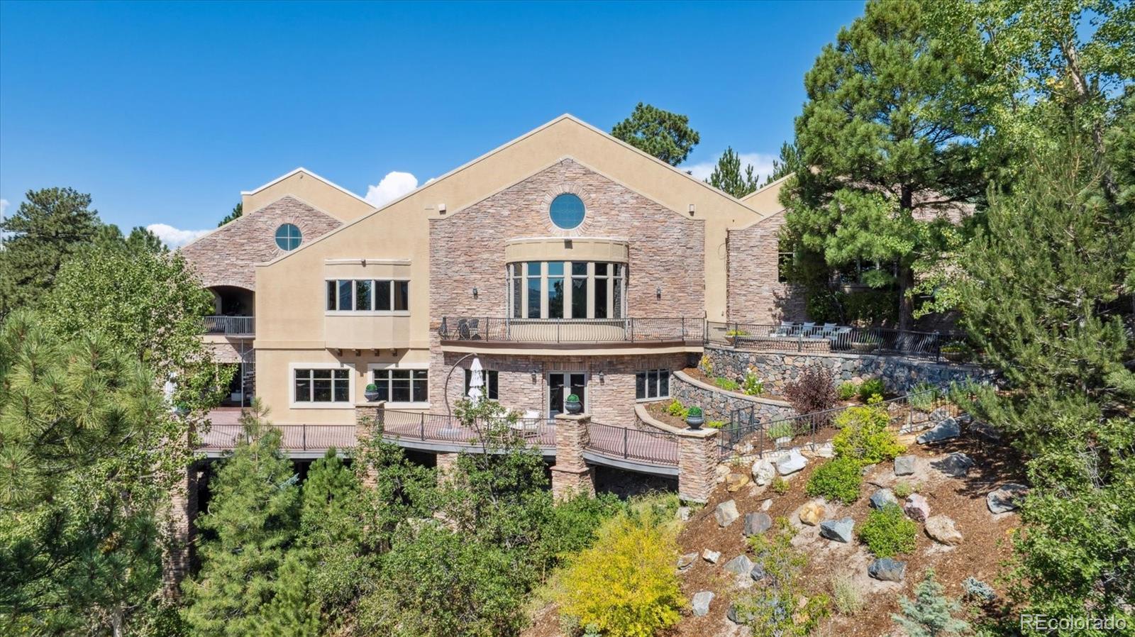 Spectacular Views & Unparalleled Luxury in Castle Pines Village. Nestled on a serene 1.75-acre wooded lot in the exclusive Castle Pines Village, this custom estate offers the perfect blend of privacy, elegance, and breathtaking views. From the moment you step inside, you are greeted by a stunning entryway and exquisite custom woodwork that set the tone for the home’s timeless charm. The great room, highlighted by soaring wood cathedral ceilings and walls of windows, frames panoramic mountain views and flows seamlessly into the gourmet kitchen. Designed for both everyday living and entertaining, the kitchen features top-of-the-line appliances, a large center island, and an adjacent 300-bottle wine cellar. A formal dining room provides an elegant space for gatherings, while multiple living areas invite comfort and relaxation. The primary suite is a true retreat, offering dramatic views, a spa-inspired bath with heated floors, infinity tub, steam shower, and a custom wardrobe dressing room. Each of the spacious secondary bedrooms features en suite baths, and a private guest suite with deck access ensures comfort for visitors. Designed for entertainment, this home includes a bonus room with a pub-style bar and billiards, a theater room, and a private office with custom built-ins. A cozy den with a grand fireplace provides yet another inviting living space. Step outside to experience unbelievable outdoor living with multiple decks overlooking the treetops and mountains, a fire pit, hot tub spa, and a beautifully landscaped private yard. This rare Castle Pines Village retreat combines luxurious living with Colorado’s natural beauty. Fantastic gated community with swimming, tennis, fitness center trails and Security rate access to restaurants and shopping.