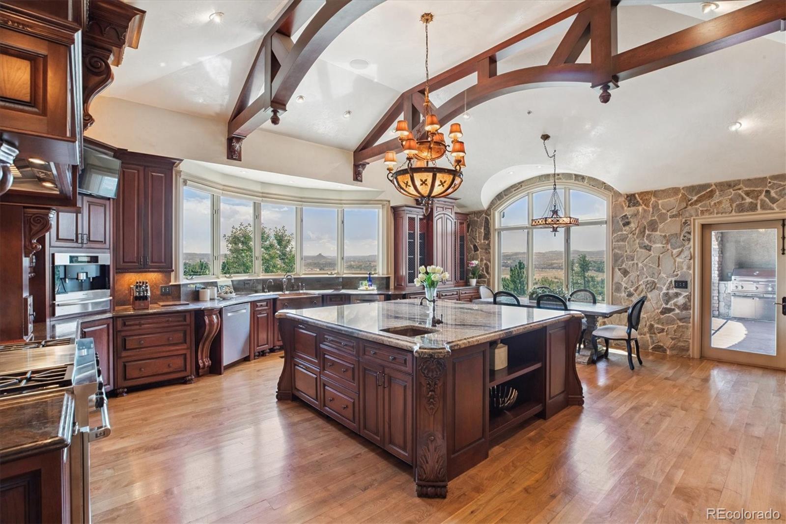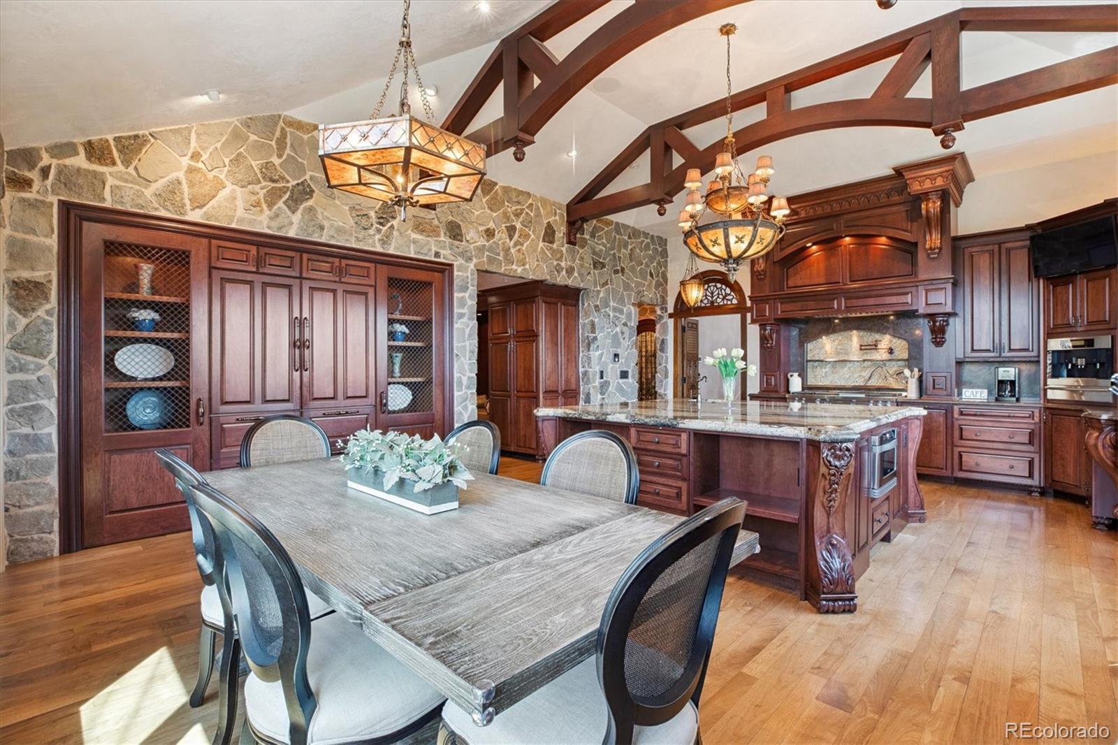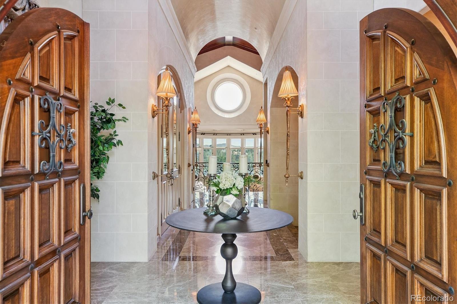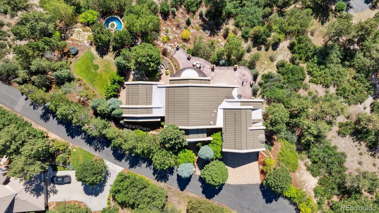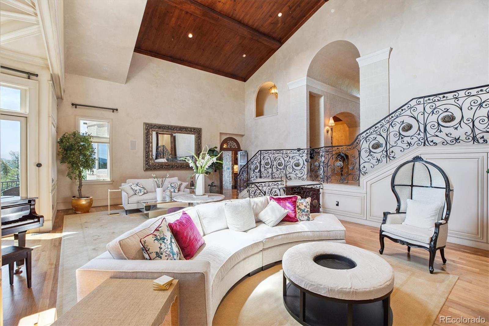 Spectacular Views & Unparalleled Luxury in Castle Pines Village. Nestled on a serene 1.75-acre wooded lot in the exclusive Castle Pines Village, this custom estate offers the perfect blend of privacy, elegance, and breathtaking views. From the moment you step inside, you are greeted by a stunning entryway and exquisite custom woodwork that set the tone for the home’s timeless charm. The great room, highlighted by soaring wood cathedral ceilings and walls of windows, frames panoramic mountain views and flows seamlessly into the gourmet kitchen. Designed for both everyday living and entertaining, the kitchen features top-of-the-line appliances, a large center island, and an adjacent 300-bottle wine cellar. A formal dining room provides an elegant space for gatherings, while multiple living areas invite comfort and relaxation. The primary suite is a true retreat, offering dramatic views, a spa-inspired bath with heated floors, infinity tub, steam shower, and a custom wardrobe dressing room. Each of the spacious secondary bedrooms features en suite baths, and a private guest suite with deck access ensures comfort for visitors. Designed for entertainment, this home includes a bonus room with a pub-style bar and billiards, a theater room, and a private office with custom built-ins. A cozy den with a grand fireplace provides yet another inviting living space. Step outside to experience unbelievable outdoor living with multiple decks overlooking the treetops and mountains, a fire pit, hot tub spa, and a beautifully landscaped private yard. This rare Castle Pines Village retreat combines luxurious living with Colorado’s natural beauty. Fantastic gated community with swimming, tennis, fitness center trails and Security rate access to restaurants and shopping.