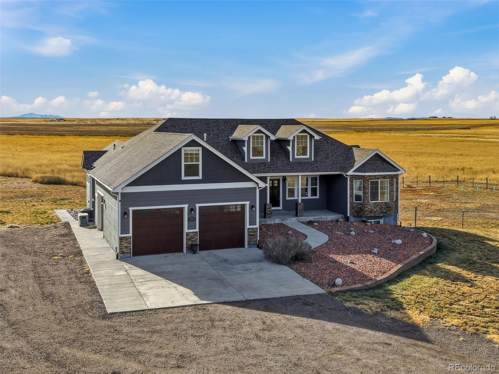 Situated on 35+ acres of level, sunlit plains with expansive skies and panoramic distant Rocky Mountain views, this property offers complete privacy with no immediate neighbors—ideal for equestrian activities, gardening, raising animals, or pure seclusion. This modern ranch home offers 4 beds, 4 baths, and 5,756 sq ft, with vaulted ceilings that create an open feel, large windows bringing in plenty of natural light, and a versatile loft off the kitchen above the garage—suitable for a home office, playroom, or additional living space. At the heart of the home is a gourmet kitchen equipped with a large granite island, whitewashed soft-close cabinetry, ZLINE professional stainless range, Bosch appliances, farmhouse sink, and custom tile backsplash—perfect for daily meals or entertaining. The welcoming primary suite includes dual walk-in closets and a spa-like bathroom with an oversized walk-in shower, rainfall fixture, pebble flooring, and elegant stone and tile finishes. The finished walk-out basement serves as an exceptional entertainment level, complete with a full wet bar featuring stone accents and new appliances, a dedicated wine room, and a home theater with projector—ideal for game nights. This level also provides an additional bedroom, bathroom, and a fitness room that can easily be converted to a 5th bedroom. Additional highlights include a water filtration system, an oversized 3 car attached garage, matching chicken coop, and a deck with views of seasonal beauty: spring wildflowers, starry nights, and snow-capped Rocky Mountains. A heated outbuilding, originally designed as a kennel, features a sealed concrete floor with full-length wrought-iron trench drain for easy cleaning, a partially completed dog washing station with existing plumbing and framing, and a office area plumbed for an another bathroom. Just 45 minutes from DIA and DTC—delivering convenient city access alongside unparalleled peace and privacy.
