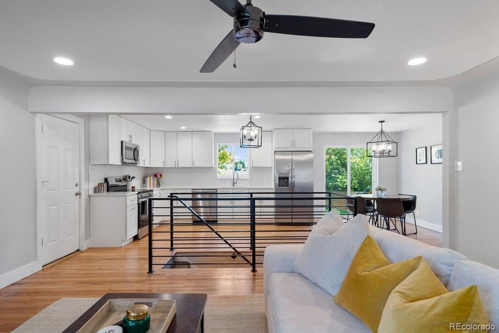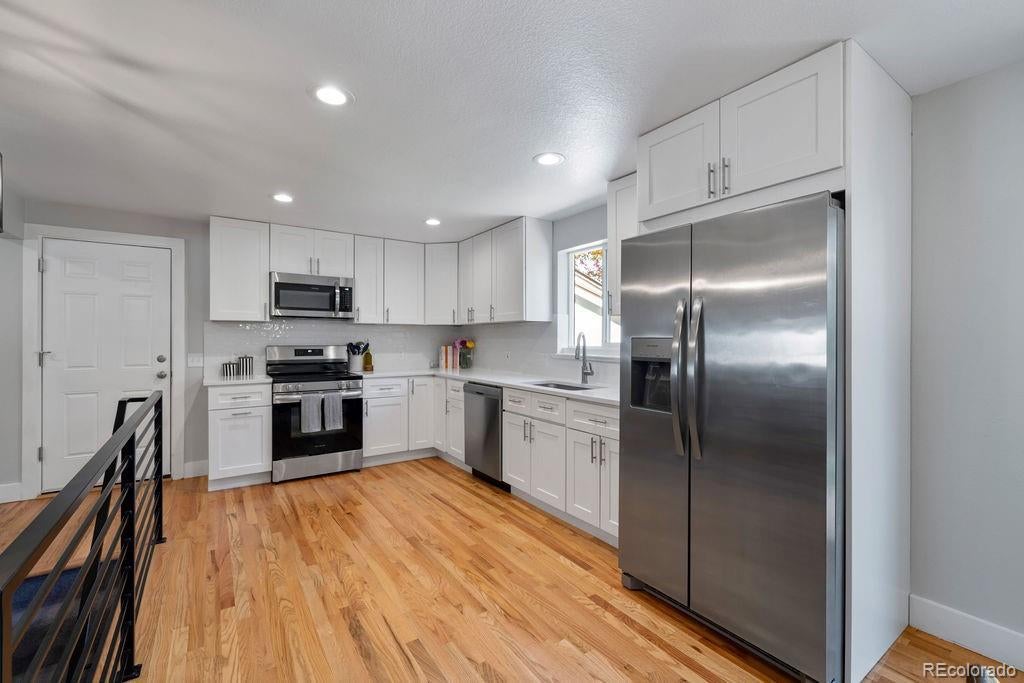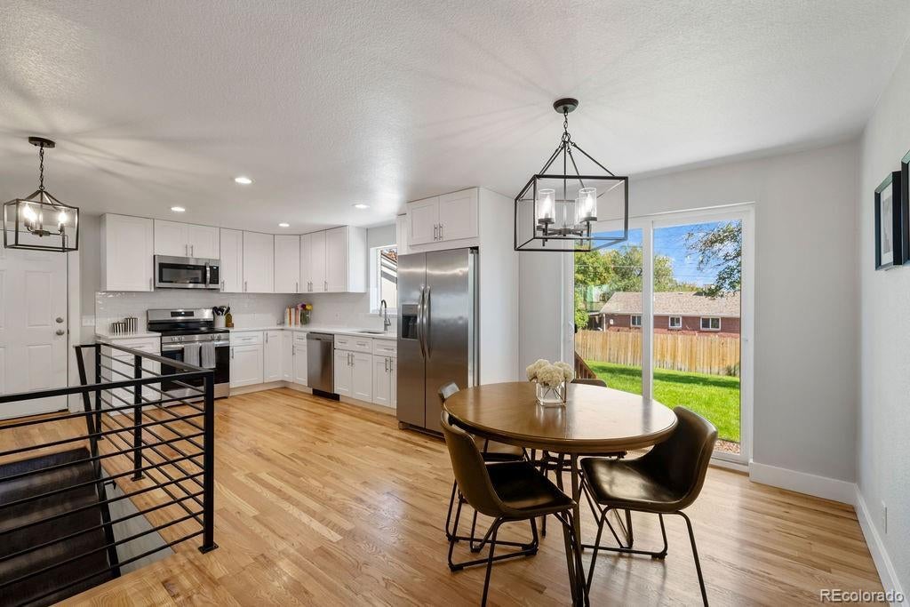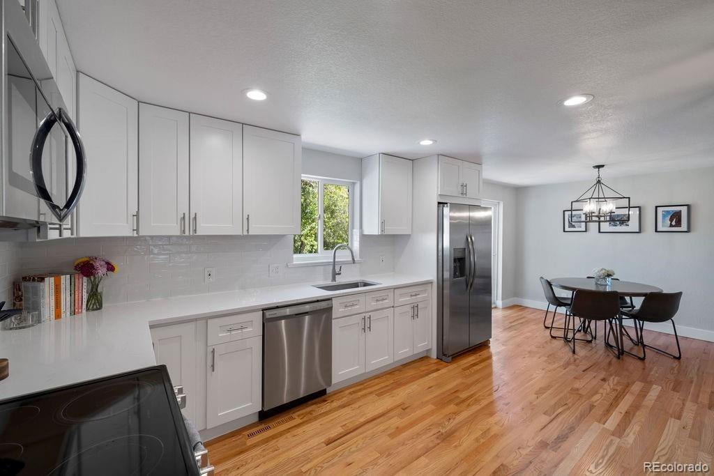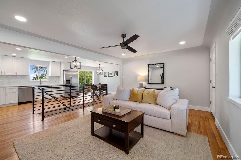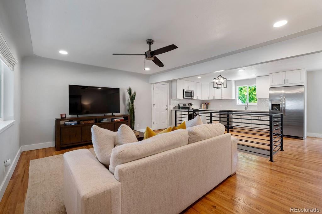 Welcome to 5406 Iris Street, an impeccably remodeled 4-bedroom, 3-bath home in the heart of Arvada. Every inch of this residence has been thoughtfully updated — from the fresh paint and new fixtures throughout to the custom design choices in the kitchen and baths. The open floor plan is enhanced by beautiful hardwood flooring that flows seamlessly from living spaces into the kitchen. The heart of the home is the all-new kitchen, featuring soft-close wood cabinets, quartz slab countertops, stainless steel appliances, and a glass tile backsplash. Bathrooms shine with modern designer tile, custom tile showers and tubs, and quartz counters. Beautiful double-pane windows bring in natural light while boosting energy efficiency. Additional finishing touches include custom steel railings, elegant lighting upgrades, and clean, contemporary aesthetics everywhere. Outside, the home sits on a generous lot framed by mature trees and lush greenery. The newly landscaped yard features a paver patio perfect for entertaining, plus new fencing for privacy and structure. The property was completely remodeled last year, so it’s move-in ready with all the systems refreshed. Unbeatable location — just a short walk to Olde Town Arvada's shops, restaurants, bars, and vibrant local events. Also convenient to light rail and major transit corridors for commuting. This is truly a rare find — style, comfort, and location all in one.