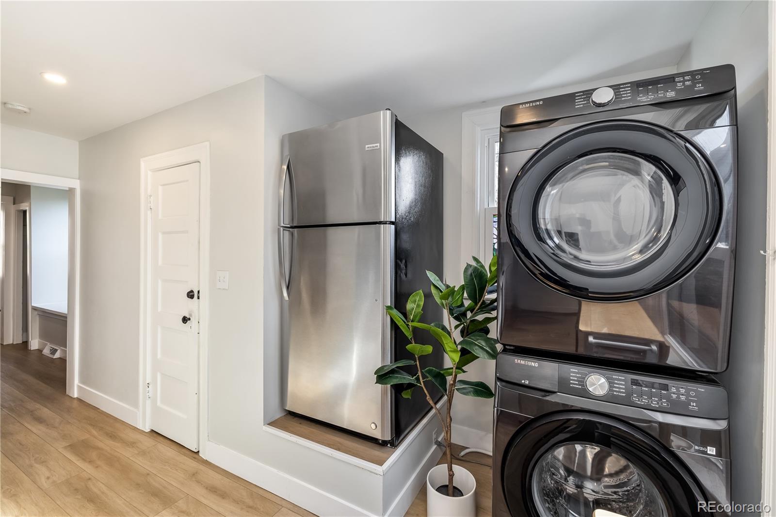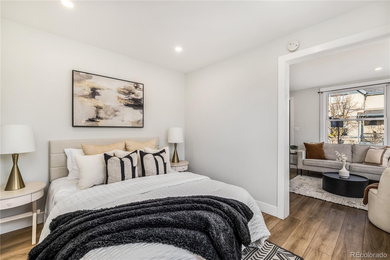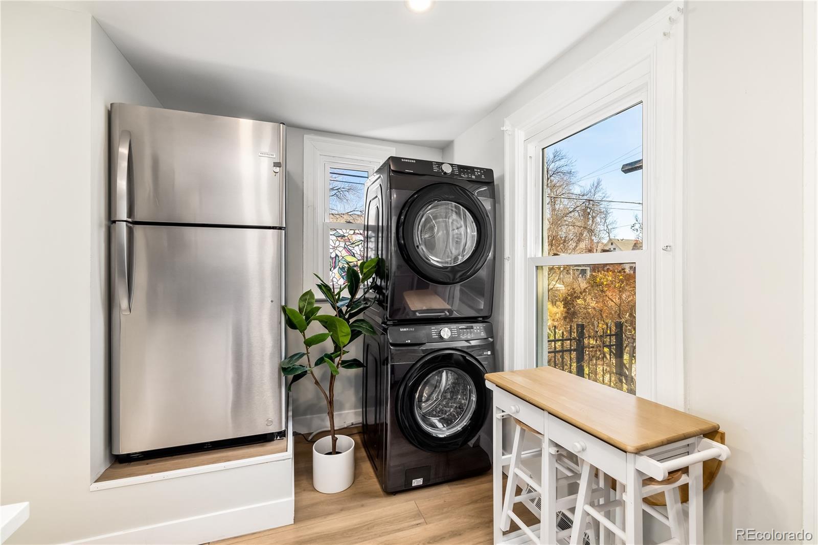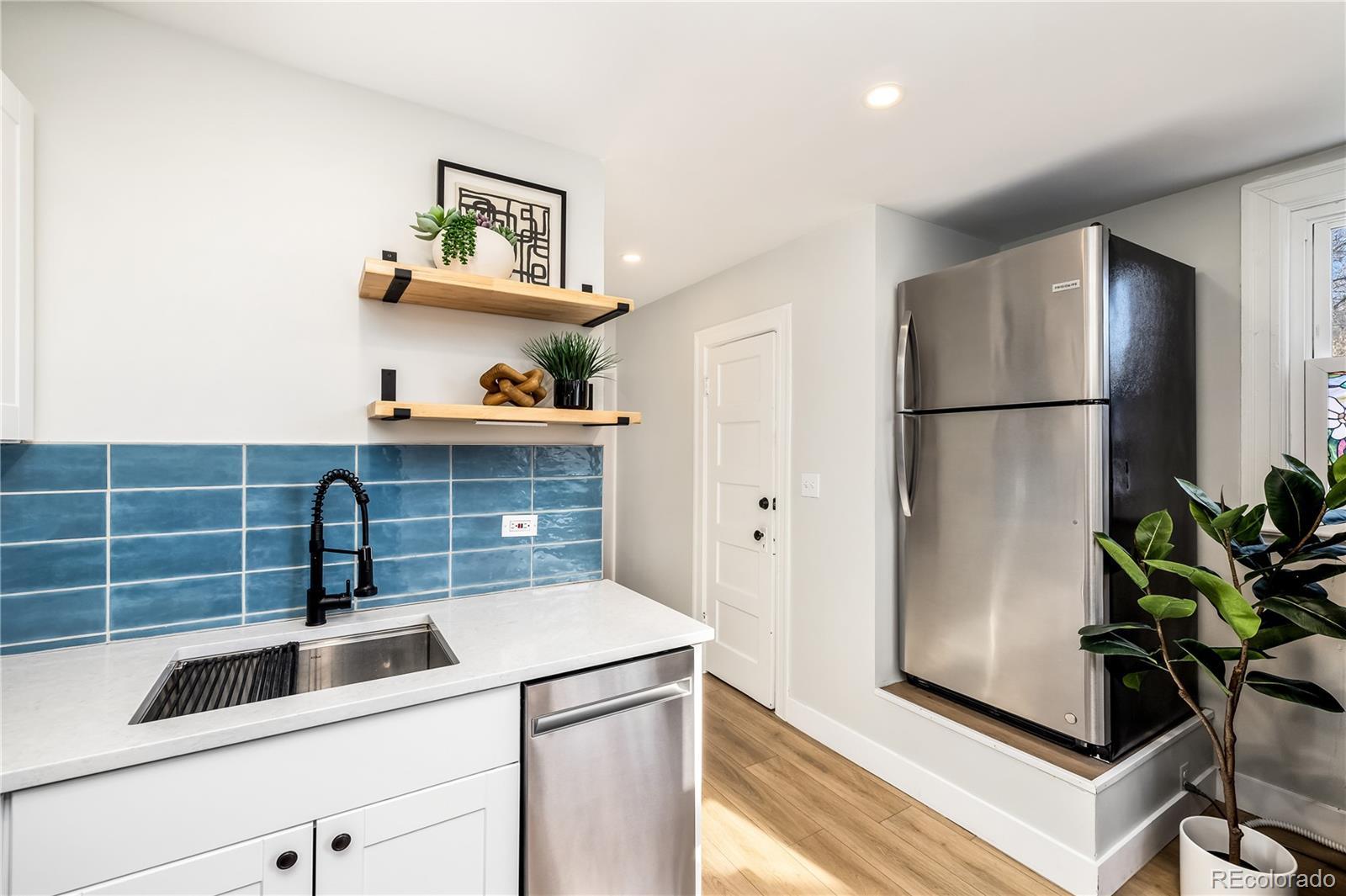 Updated one-bedroom, one-bathroom end-unit rowhome in the Baker neighborhood of Denver, located just off South Broadway. This corner unit offers approximately 500 sq. ft. with newer LVP and ceramic tile flooring throughout. The kitchen features quartz countertops, tile backsplash, stainless steel appliances, and an in-unit washer and dryer. Enjoy a fully fenced and landscaped private side yard for outdoor space and gardening. Parking is available through the Denver Resident Parking Permit program for convenient on-street parking. Excellent access to public transit with an RTD bus stop one block away and nearby light rail service. Dailey Park is one block from the home, and the property is close to restaurants, shops, and services along Broadway, Lincoln Street, and Speer Boulevard. Efficient layout, updated finishes, and a walkable urban location.