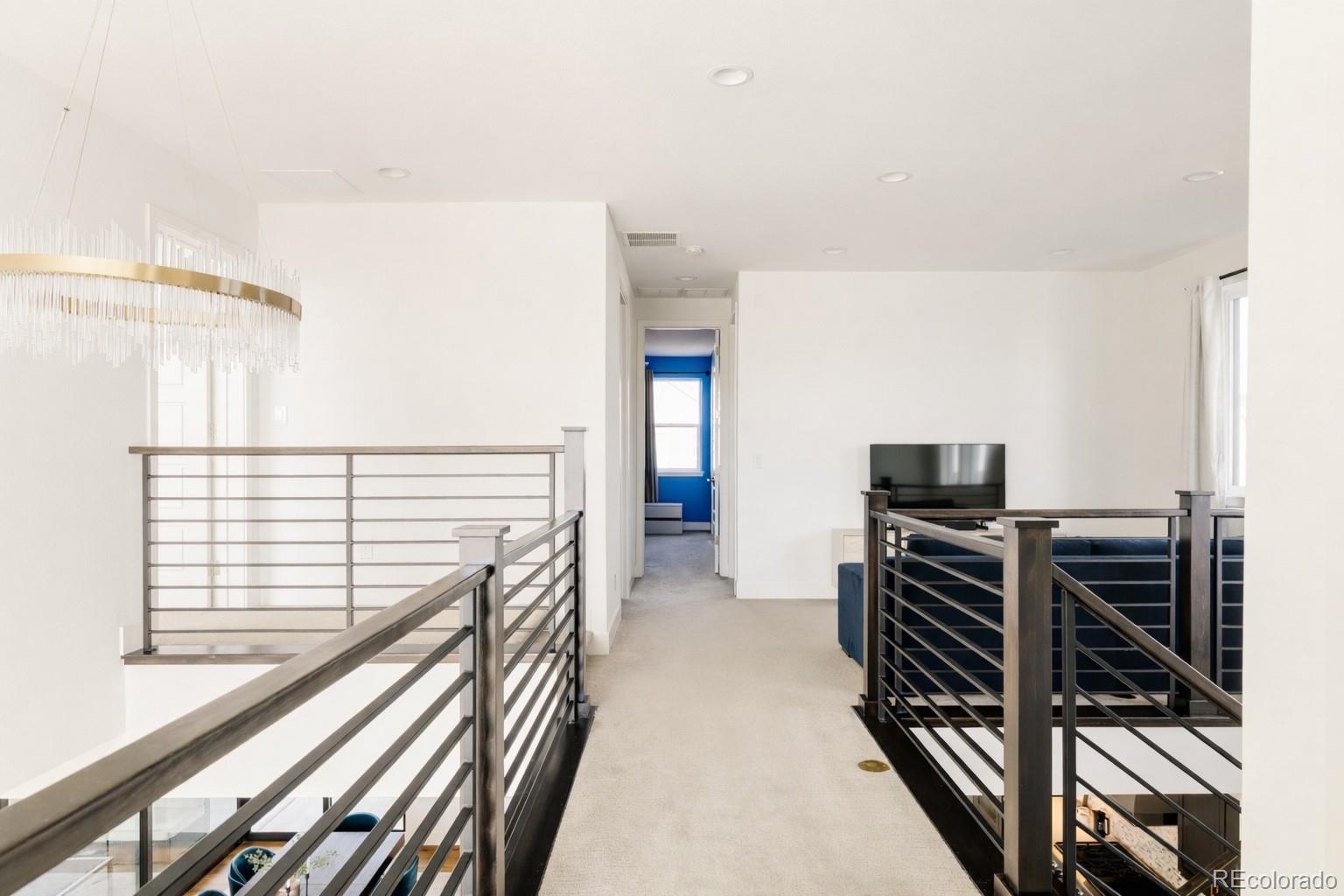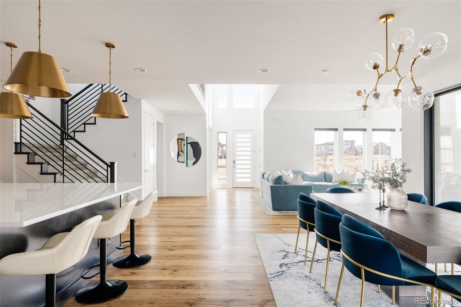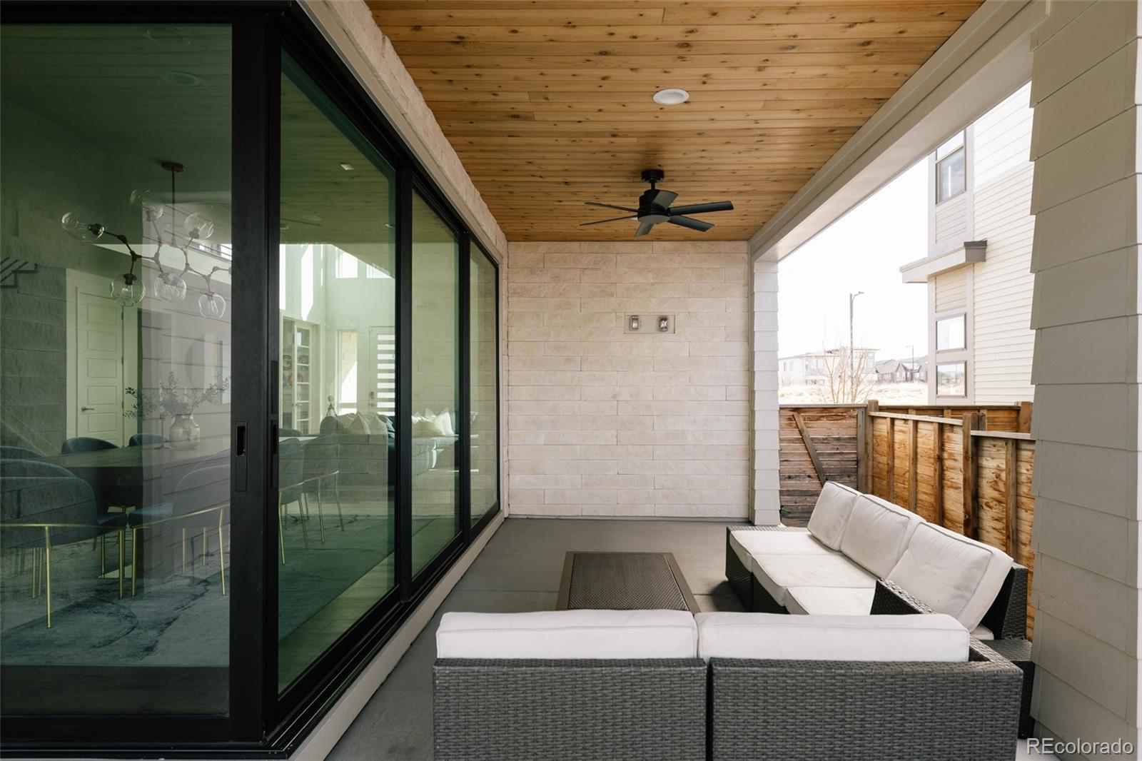 Fully upgraded Infinity Vive 1, ideally located a short walk to the F54 Pool with a south-facing entrance overlooking a park—an incredibly rare setting. A dramatic two-story entry makes a stunning first impression, showcasing three statement chandeliers and upgraded wide-plank hardwood floors flowing across the main level. Floor-to-ceiling windows flood the space with natural light, and a whole-house alarm system adds peace of mind. There is also a main floor office. The open-concept living, dining, and kitchen areas are designed for entertaining and daily living. The living room features motorized blinds, also found in the primary suite. The dining area is anchored by a statement chandelier and opens to the covered patio through a stacked slider for seamless indoor–outdoor living. The chef’s kitchen stands out with Thermador appliances, including a built-in refrigerator, 48-inch gas cooktop with vent, and refrigerator drawer bank. Updated cabinetry, decorative backsplash, oversized island with pendant lighting, and custom pantry organization complete this beautiful and functional space. The covered patio is upgraded with ceiling fans and a TV outlet—perfect for relaxing or hosting. Upstairs, a spacious loft offers flexible living space, with upgraded carpet throughout. Two bedrooms share a Jack-and-Jill bath, while a third features its own en-suite with upgraded lighting. The laundry room includes built-in cabinetry and a utility sink. The primary suite is a true retreat with motorized blinds, dual custom walk-in closets, and a fully updated spa-like bath featuring double vanities and an oversized shower. The basement offers future potential with rough-ins for a wet bar and bath. A custom mudroom, epoxied and painted garage, and thoughtful upgrades throughout reflect pride of ownership. Close to top-rated schools, parks, trails, shops, Dick’s Sporting Goods Park, the Wildlife Refuge, and Pearl Market—this is Central Park living at its finest.