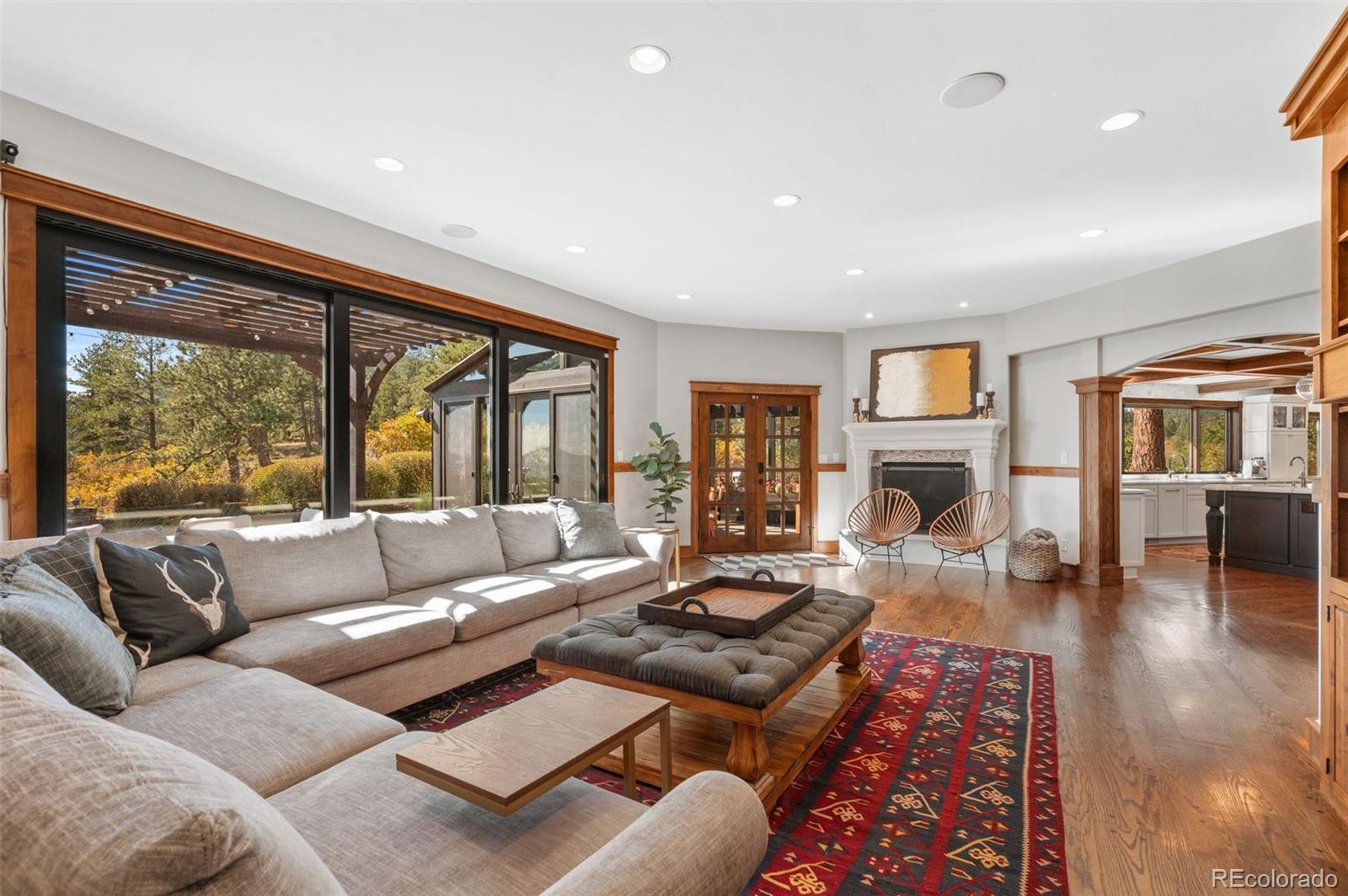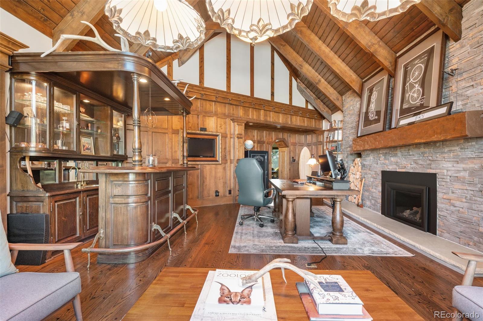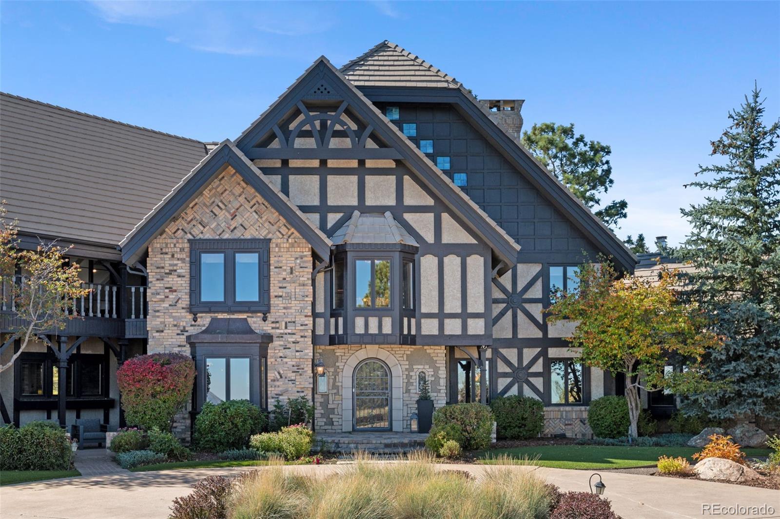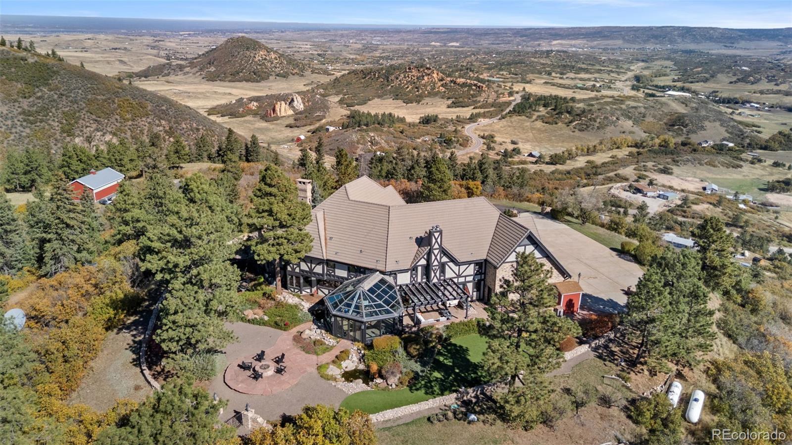 Situated atop 40 acres of breathtaking Colorado landscape, this fully renovated Tudor estate in Sedalia offers an unparalleled blend of sophistication and country charm in a private setting. The gourmet kitchen has been artfully reimagined with top-of-the-line finishes, fixtures, and appliances, featuring a rare artifact from the French Revolution as the cooktop backsplash. Charm and intrigue continue to flow throughout the home, highlighted by remarkable details such as an authentic stage coach bar, historic period fixtures, stunning chandeliers, and custom stonework, complemented by five inviting fireplaces and elegant marble flooring. This residence boasts a striking two-story glass atrium that invites natural light and panoramic views of the majestic mountains and Downtown Denver. The expansive outdoor living areas are equally impressive, showcasing meticulously landscaped grounds complete with low-maintenance turf, serene water features, sports field, grazing pasture, ATV track, shooting range, treehouse, and walking trails that enhance the estate's tranquility. Additional amenities include a spacious bonus/playroom, a state-of-the-art home theater, and two versatile outbuildings, ideal for vehicles, animals, or potential caregiver’s accommodations. The expansive primary suite is the epitome of luxury with dual walk-in closets, sitting area, fireplace, coffee bar and five piece marble bathroom. The generously proportioned secondary bedrooms are perfect for children and guests. For those with a passion for sustainable living, this estate features a goat and chicken farm, adding a unique touch to this luxurious retreat. Situated just 25 minutes from the Denver Tech Center and a mere 12 minutes from Whole Foods, this property ensures both privacy and accessibility. This exceptional estate is a rare opportunity, embodying the height of luxurious mountain living while providing countless amenities for a lifestyle of comfort and seclusion.