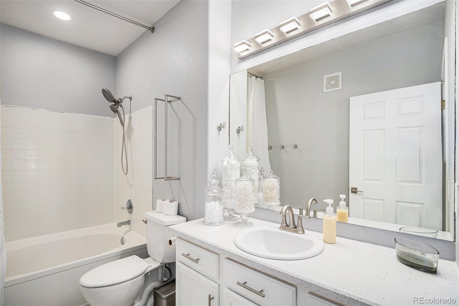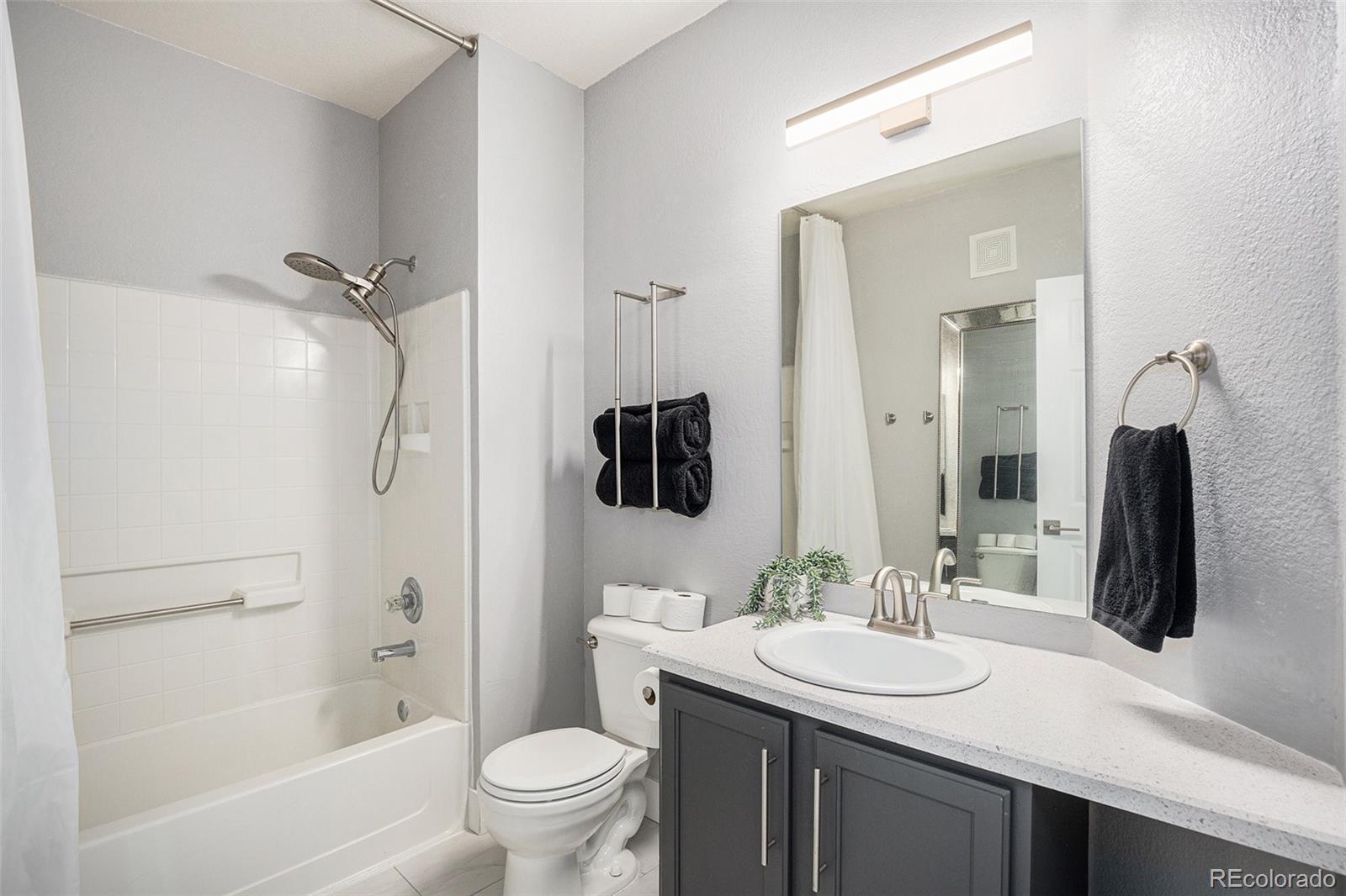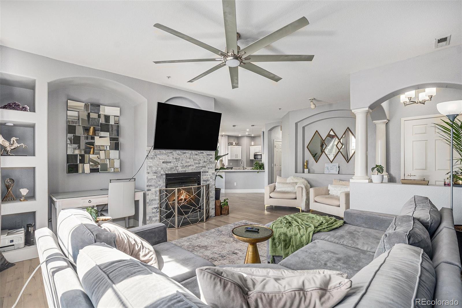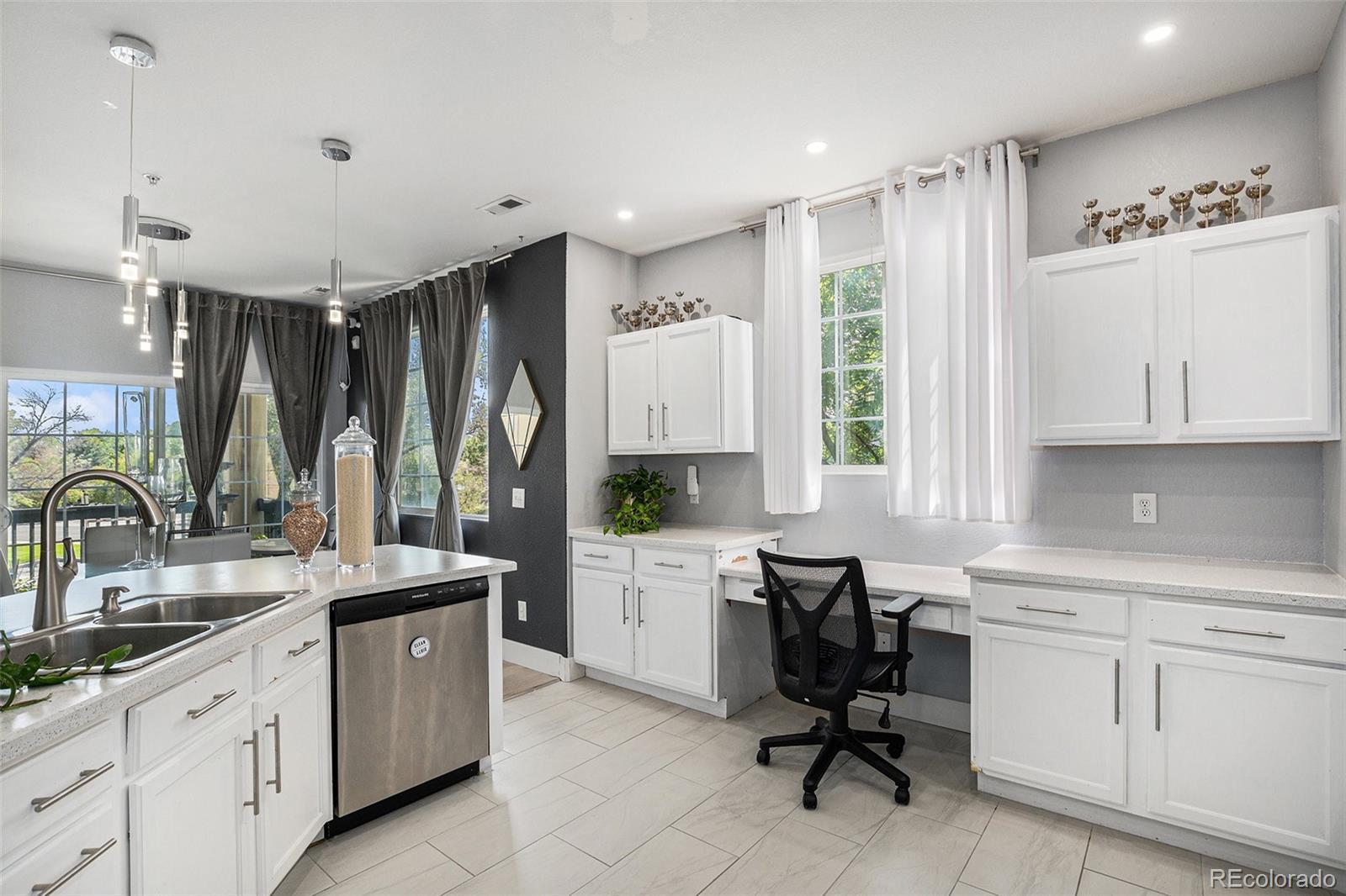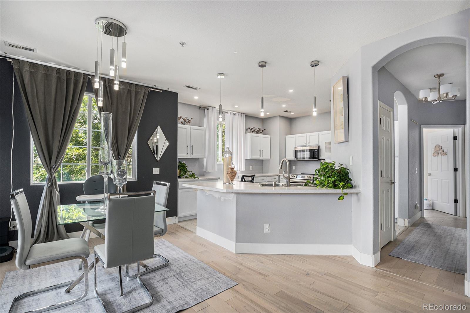 Welcome to this inviting 2nd floor corner condo in the Fox Creek community of Thornton, where comfort and convenience come together with a touch of modern style. From the moment you step inside, you’ll notice the warmth of hardwood flooring that flows through the great room, dining area, and both bedrooms, creating a space that feels both stylish and low-maintenance. The great room is designed for relaxing or entertaining, with tall ceilings, abundant natural light from multiple windows, and a cozy gas fireplace that sets the tone for quiet evenings at home. The adjoining dining space flows seamlessly into the kitchen, where creamy white cabinets, stainless steel appliances, and tile floors make cooking and gathering feel effortless. A built-in desk provides the perfect nook for working from home or staying organized day to day. The primary suite is a retreat of its own with a walk-in closet and ensuite full bath, while the second bedroom and bath add flexibility for guests, hobbies, or a home office. Being a corner unit, the condo feels open and private, with sunlight streaming in from two sides. Life at Fox Creek means you’re close to everything you need, yet just steps from nature. Spend your mornings walking or biking along the trails of Niver Creek Open Space or enjoy a picnic at Northstar Park. Nearby shops, dining options, and commuter routes make daily errands and travel simple, while the low-maintenance lifestyle of condo living leaves more time to enjoy Colorado’s sunshine and outdoor beauty. Whether you’re starting fresh, downsizing, or looking for a place that blends convenience with comfort, this home offers a welcoming balance of it all.