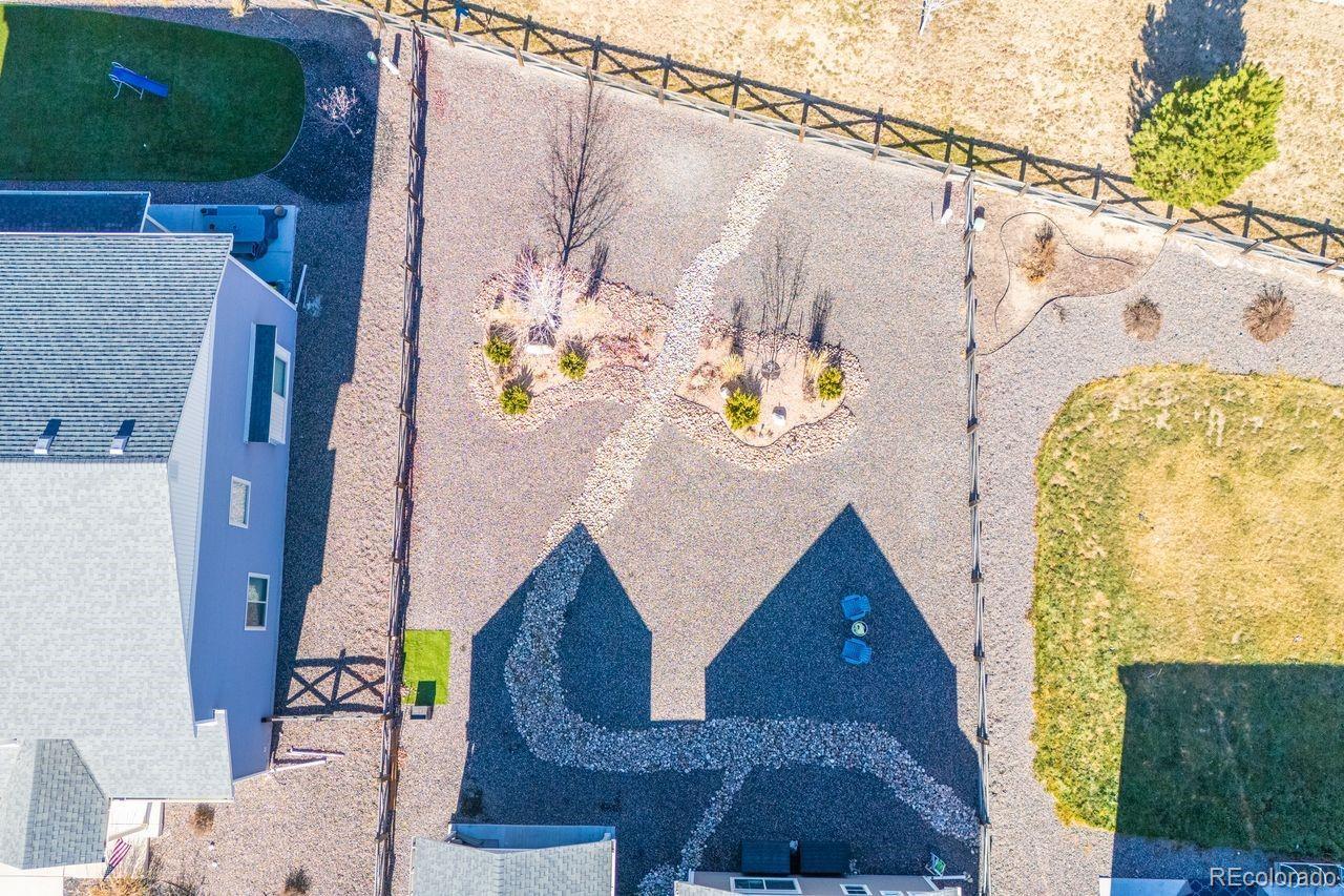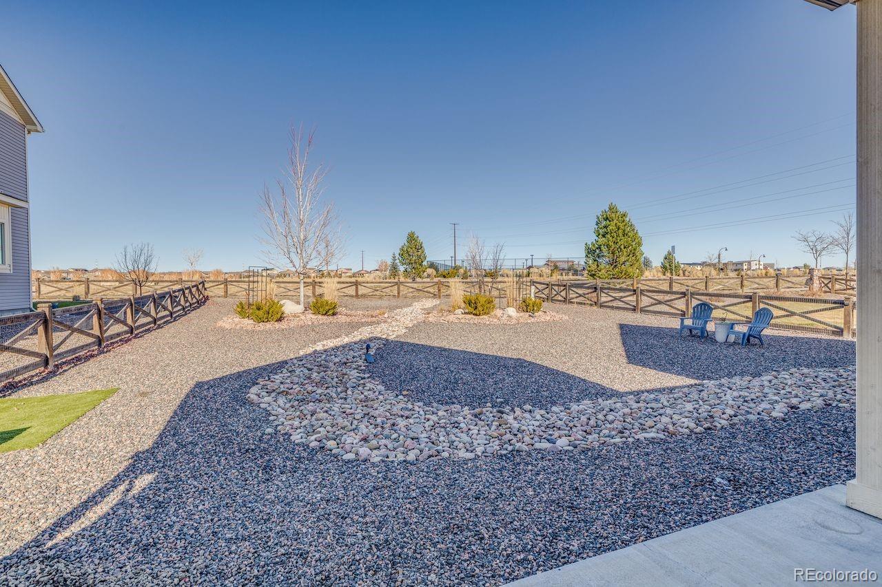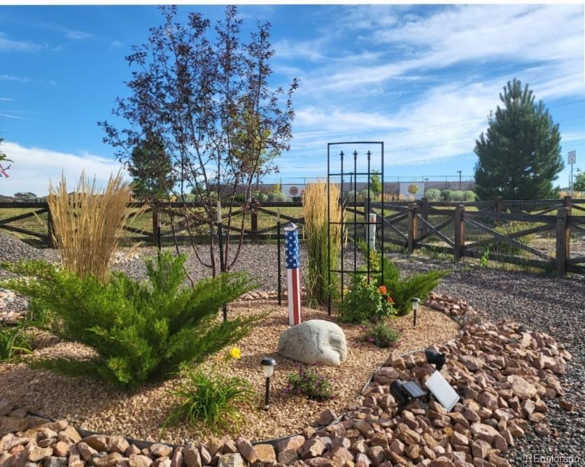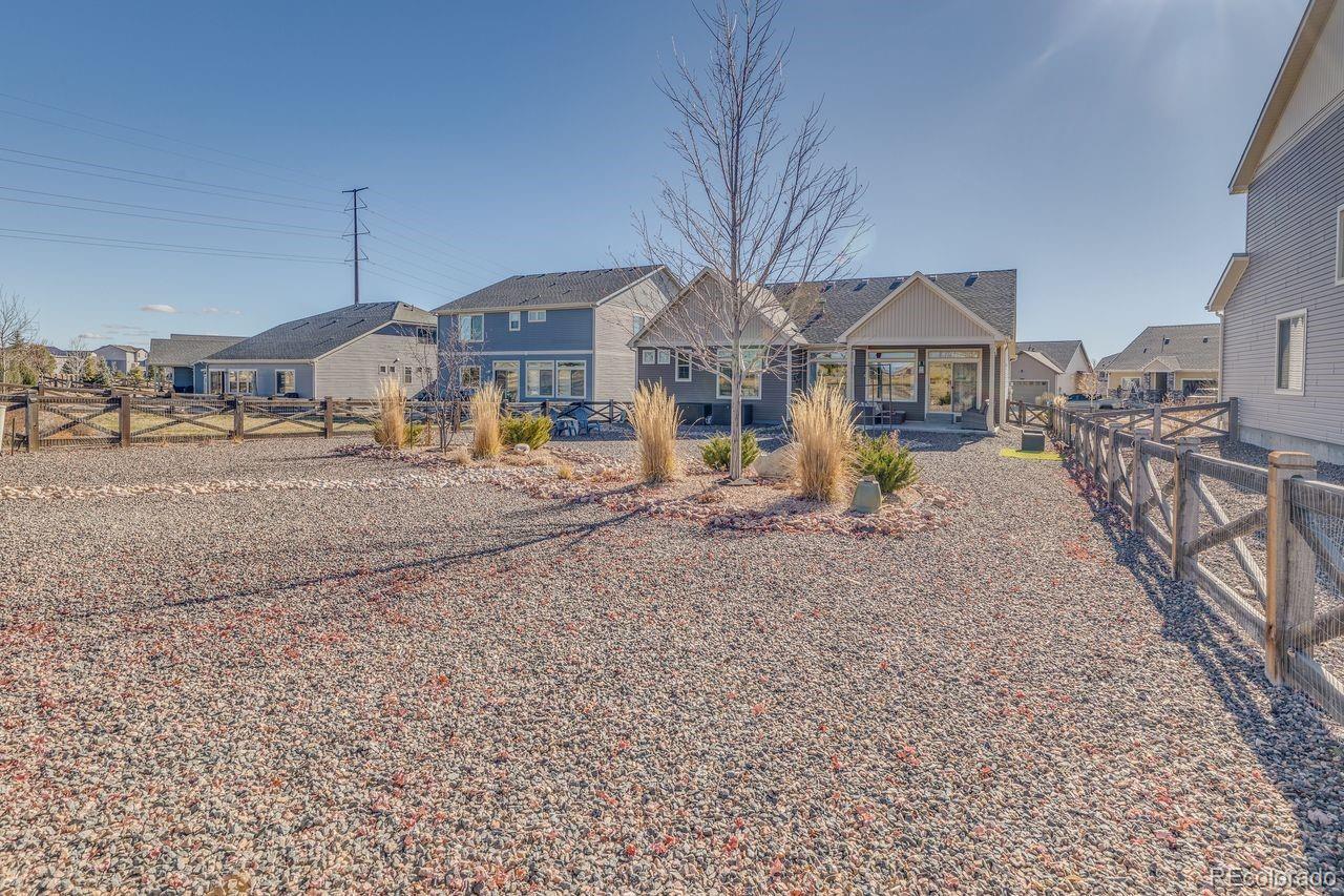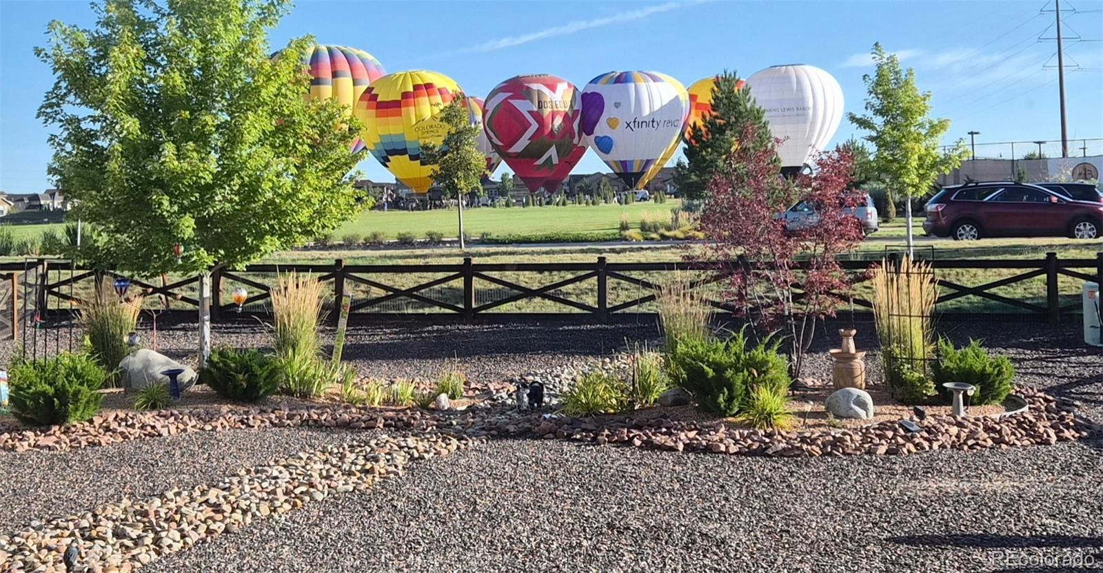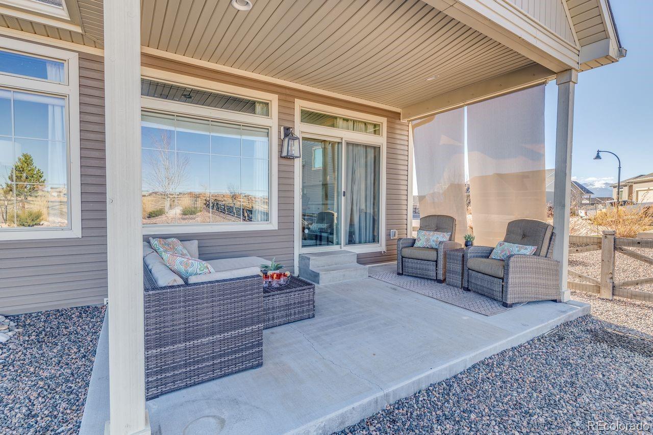 A rare find! This beautifully maintained, single-level home offers over 2,000 sq. ft. of low-maintenance living with 3 bedrooms & 3 bathrooms, with solar panels for efficiency and lower utility bills, and all the conveniences you’ve been looking for. As you enter, you’ll find a spacious front room currently used as an office—could also be used as a second living area or formal dining space. The open-concept layout features 9+ ft ceilings, gourmet kitchen complete with granite countertops, oversized island, gas range with double ovens (including convection), stainless steel refrigerator & dishwasher, plus upgraded shaker style cabinetry with pull-out shelving. The living room centers around a gas fireplace with a blower that heats up the main area and an adjustable mounted TV over the fireplace. . Step out to the back patio to a beautiful xeriscaped yard, fully fenced and equipped with a sprinkler and drip system. Enjoy your morning coffee on either the front or back covered patio. Unobstructed views from the back patio that you can see summer concerts and watch the hot air balloons just steps from the pickleball courts. The 2 full baths are large and feature Corian countertops. The spacious primary suite includes a large walk-in shower and expansive walk-in closet. Pride of ownership shines throughout—Mrs. Clean lives here. Located in the sought-after Banning Lewis Ranch community, you’ll enjoy unmatched amenities: walking distance to schools and miles of hiking/biking trails, multiple pools and parks, pickleball and tennis courts, basketball court, dog park, over 65 acres of open space, climbing parks, zip-lines, splash pad, water park, and more. The recreation center includes a fitness facility and regularly-scheduled classes and events for all ages. In the summer, enjoy neighborhood concerts, festivals, food trucks, and a weekly farmers market. This fabulous home has it all—luxury, convenience, community, and lifestyle. Ready for you to move in and enjoy!
