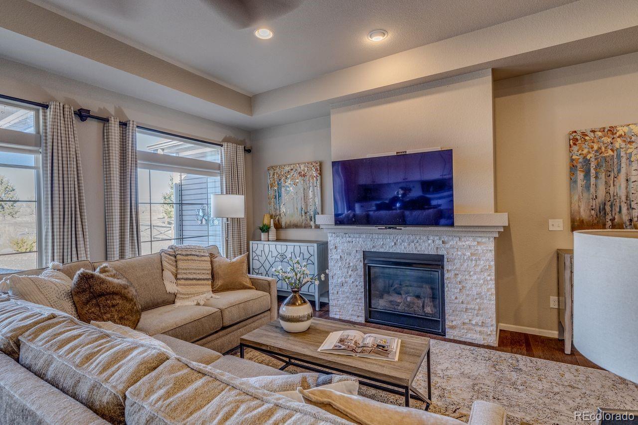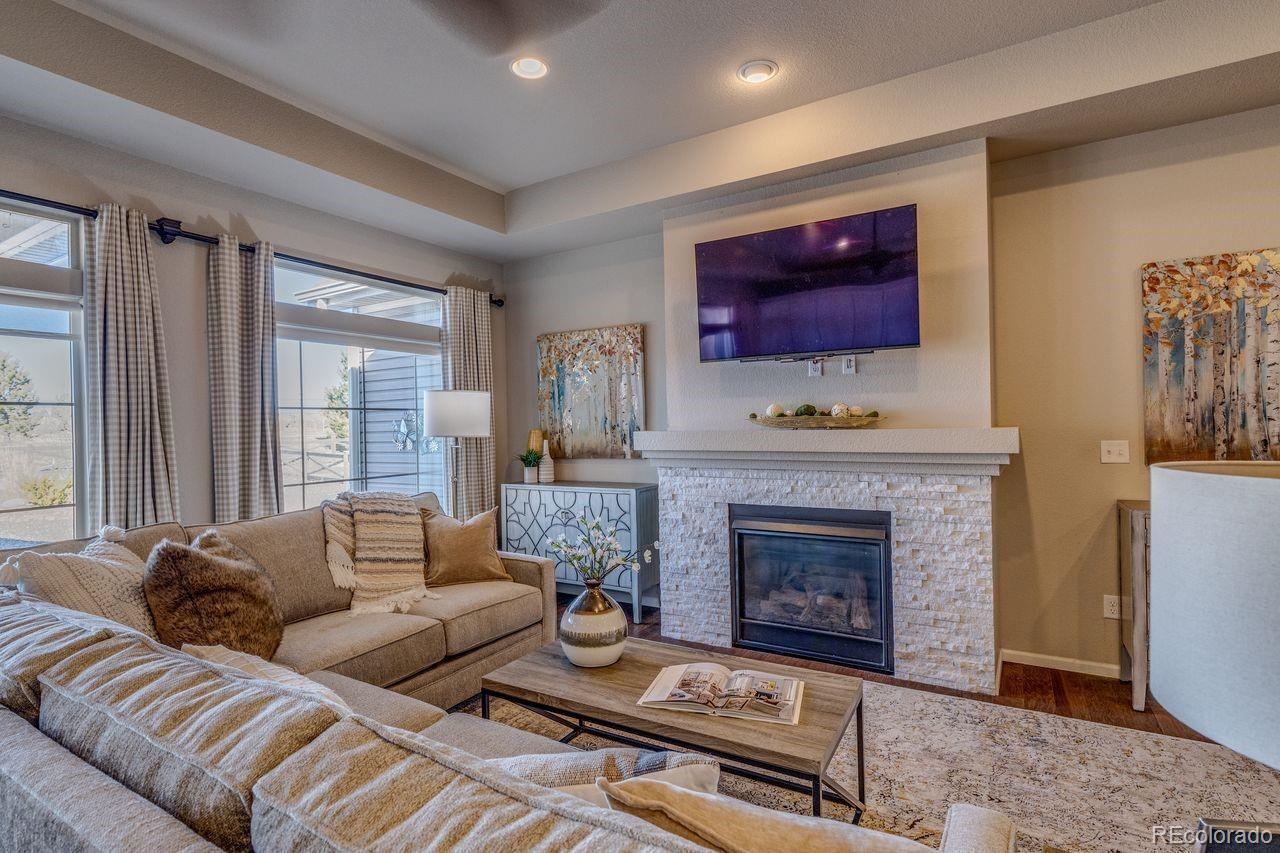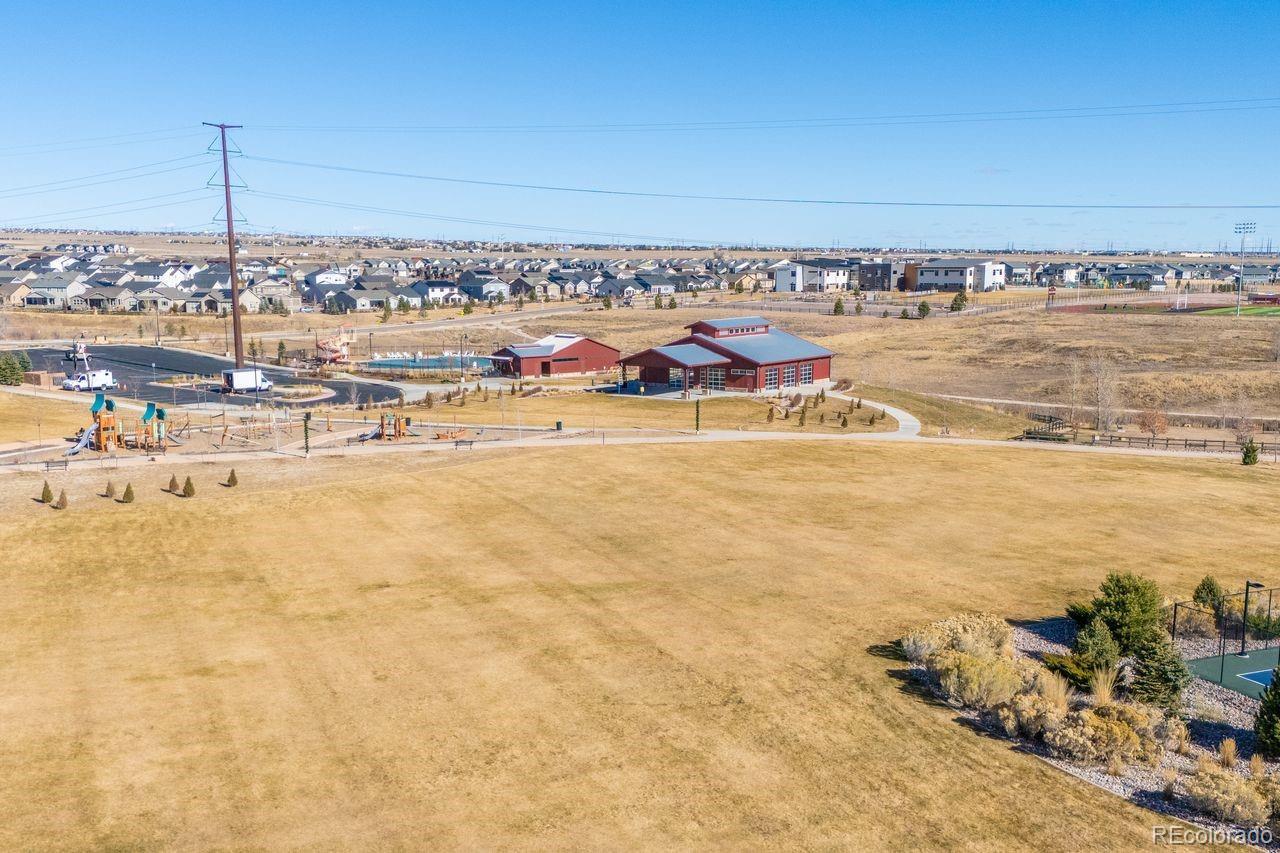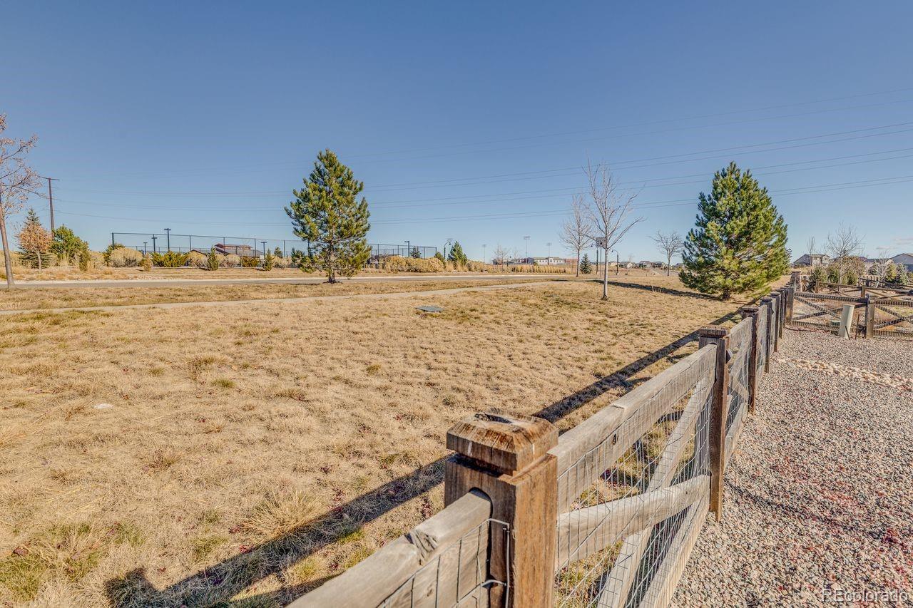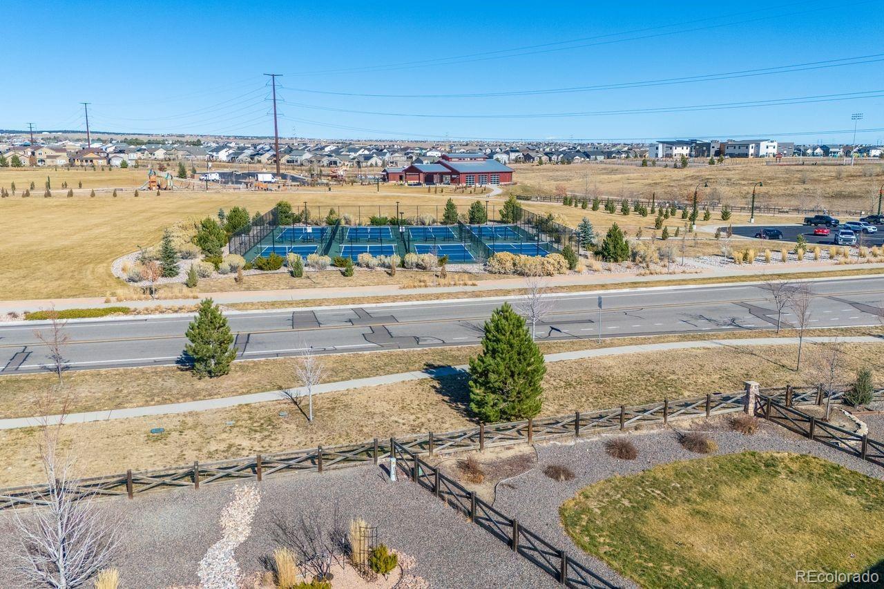 A rare find! This beautifully maintained, single-level home offers over 2,000 sq. ft. of low-maintenance living with 3 bedrooms & 3 bathrooms, with solar panels for efficiency and lower utility bills, and all the conveniences you’ve been looking for. As you enter, you’ll find a spacious front room currently used as an office—could also be used as a second living area or formal dining space. The open-concept layout features 9+ ft ceilings, gourmet kitchen complete with granite countertops, oversized island, gas range with double ovens (including convection), stainless steel refrigerator & dishwasher, plus upgraded shaker style cabinetry with pull-out shelving. The living room centers around a gas fireplace with a blower that heats up the main area and an adjustable mounted TV over the fireplace. . Step out to the back patio to a beautiful xeriscaped yard, fully fenced and equipped with a sprinkler and drip system. Enjoy your morning coffee on either the front or back covered patio. Unobstructed views from the back patio that you can see summer concerts and watch the hot air balloons just steps from the pickleball courts. The 2 full baths are large and feature Corian countertops. The spacious primary suite includes a large walk-in shower and expansive walk-in closet. Pride of ownership shines throughout—Mrs. Clean lives here. Located in the sought-after Banning Lewis Ranch community, you’ll enjoy unmatched amenities: walking distance to schools and miles of hiking/biking trails, multiple pools and parks, pickleball and tennis courts, basketball court, dog park, over 65 acres of open space, climbing parks, zip-lines, splash pad, water park, and more. The recreation center includes a fitness facility and regularly-scheduled classes and events for all ages. In the summer, enjoy neighborhood concerts, festivals, food trucks, and a weekly farmers market. This fabulous home has it all—luxury, convenience, community, and lifestyle. Ready for you to move in and enjoy!