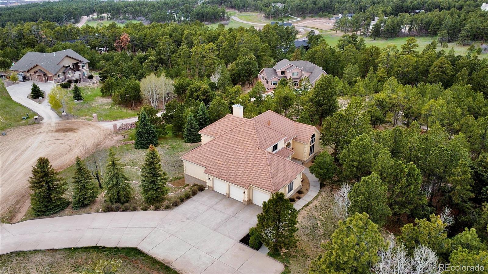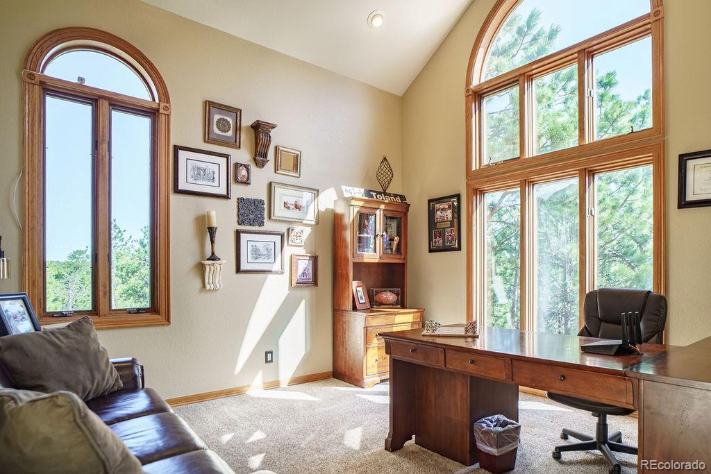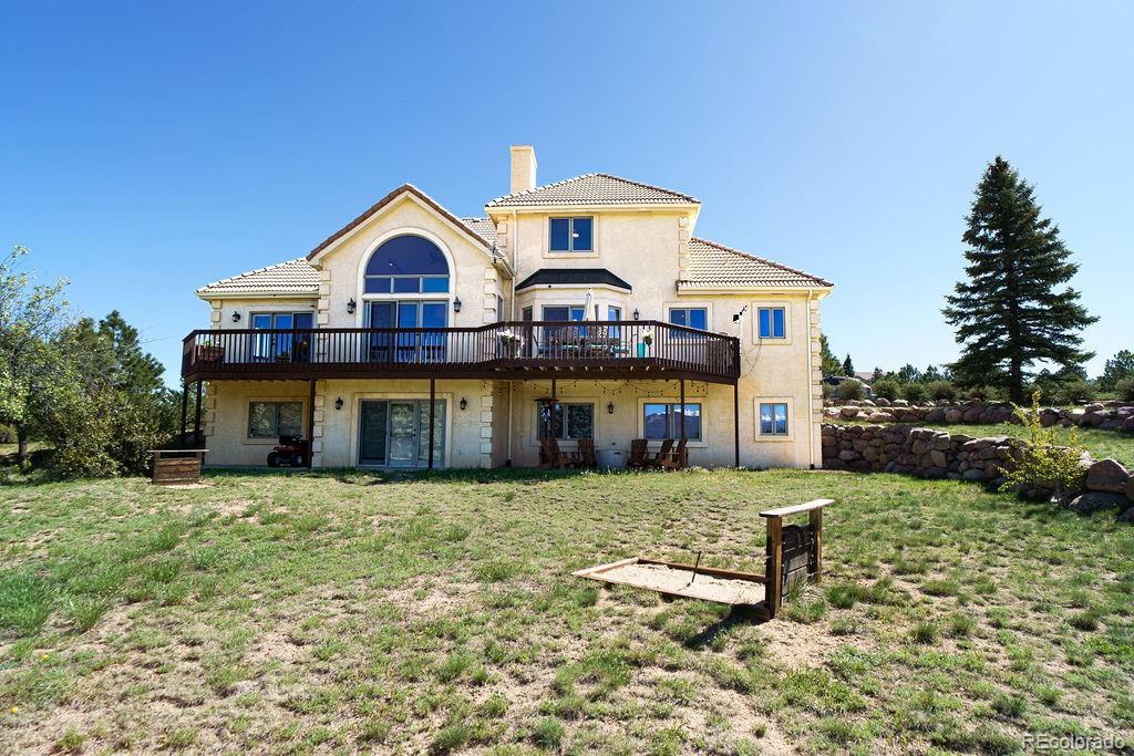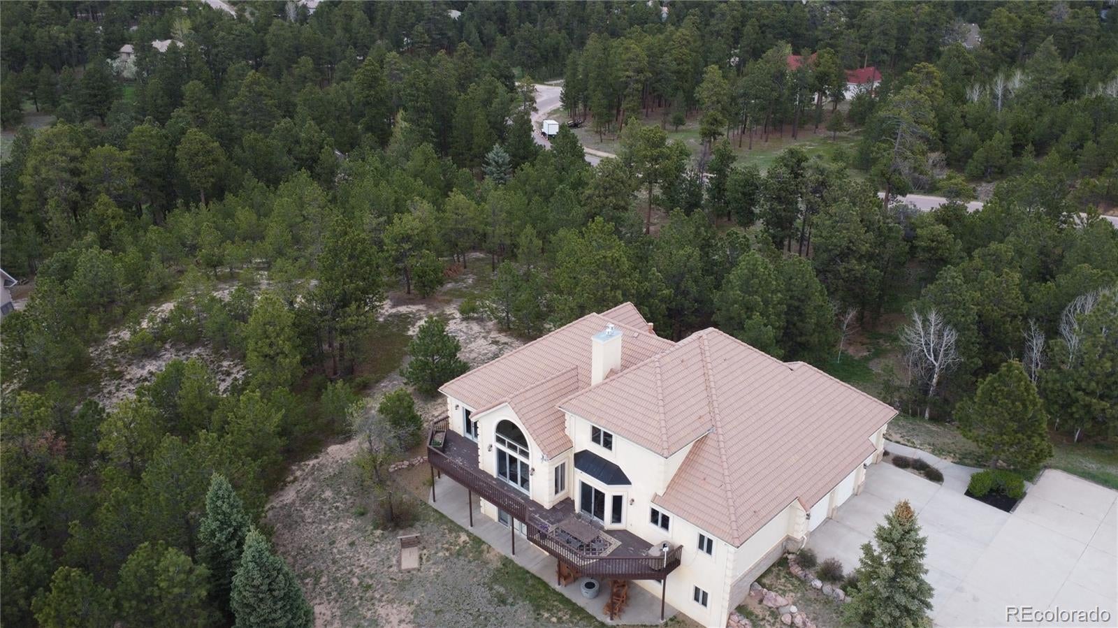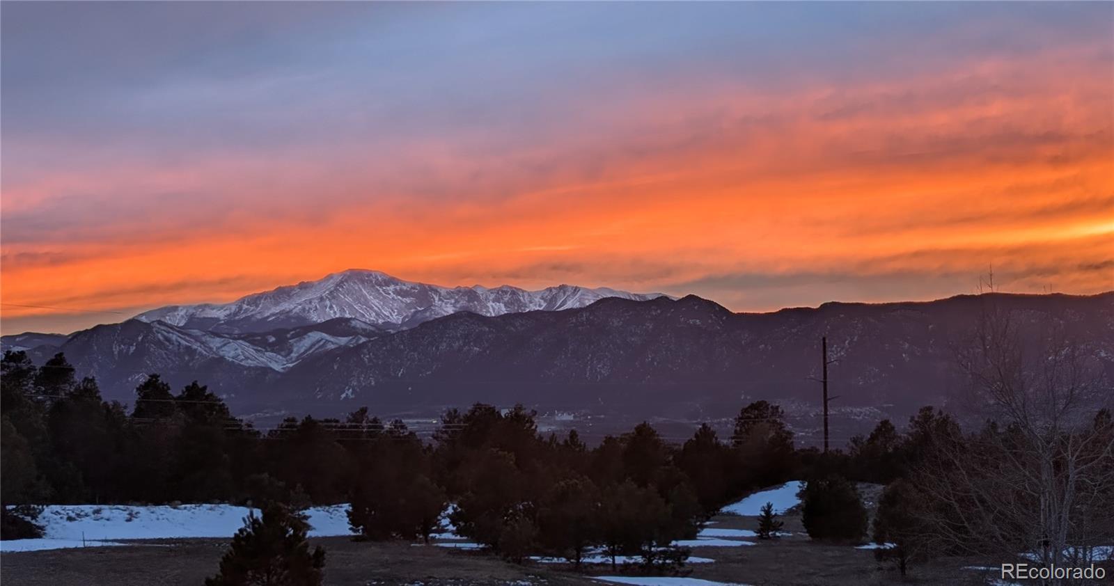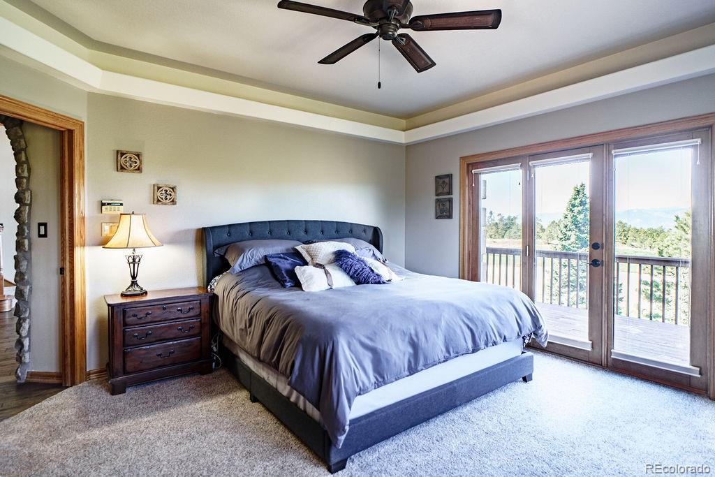 BACK ON THE MARKET WITH UPDATES! Welcome to your 2.5 acre oasis, w/new stucco and soon new composite shingle roof, nestled on a private, treed lot with magnificent views of the mountains! This 2 story home offers a main level primary bedroom (access to the rear deck) with an attached 5-piece bath (heated floors) and walk-in closet. Head upstairs to the 2 bedrooms w/a jack-and-jill bath AND a super cute loft between the bedrooms that could be used as a toy/play/lounging area. The main level also boasts a very spacious carpeted office near the front door and a lovely formal dining room w/access to the dry bar and kitchen. In the eat-in kitchen you'll find a 2-sided fireplace, room for a kitchen table, island with stovetop, and the flexibility to walk out to the elongated deck to enjoy the majestic views of Pikes Peak. Head downstairs to the unfinished, 2000 s.f. walk-out basement to see the endless possibilities. You want want to miss this gem of a home located in D-38!