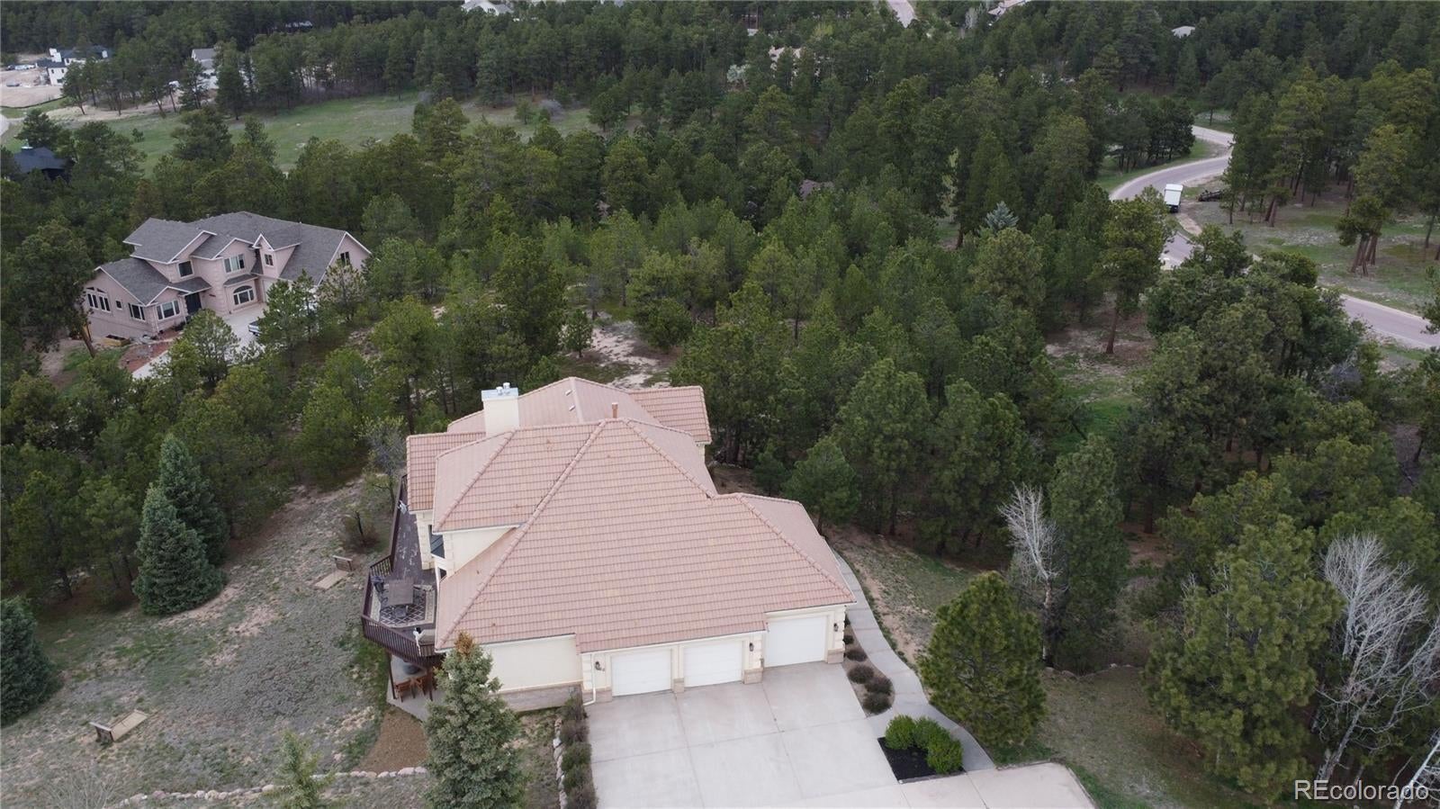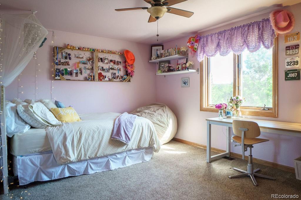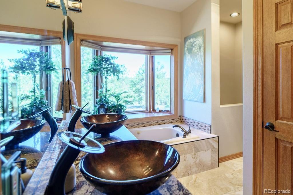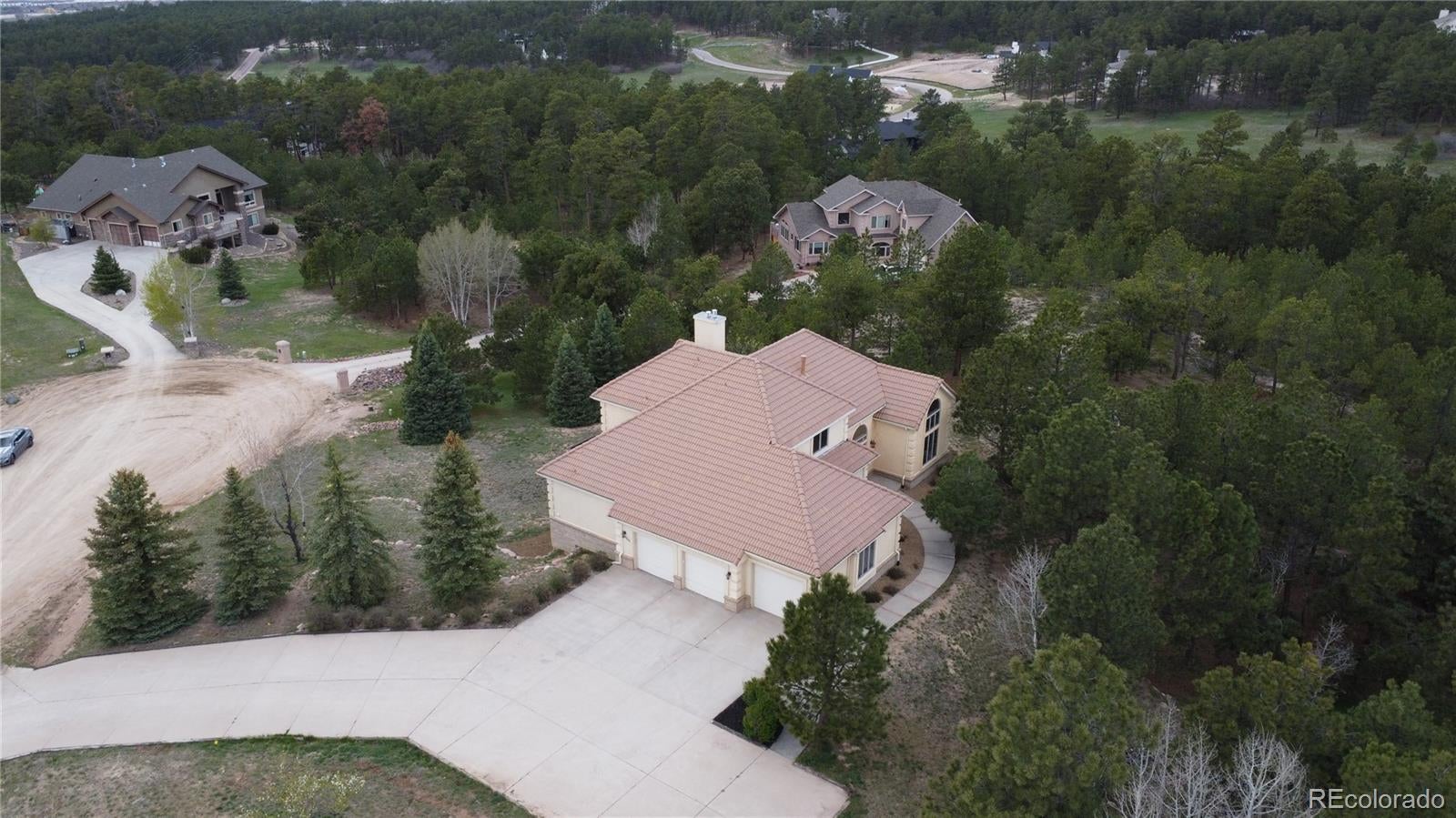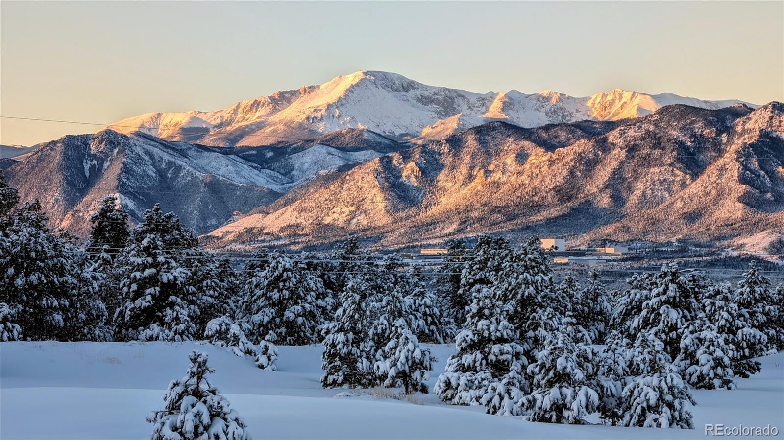 BACK ON THE MARKET WITH UPDATES! Welcome to your 2.5 acre oasis, w/new stucco and soon new composite shingle roof, nestled on a private, treed lot with magnificent views of the mountains! This 2 story home offers a main level primary bedroom (access to the rear deck) with an attached 5-piece bath (heated floors) and walk-in closet. Head upstairs to the 2 bedrooms w/a jack-and-jill bath AND a super cute loft between the bedrooms that could be used as a toy/play/lounging area. The main level also boasts a very spacious carpeted office near the front door and a lovely formal dining room w/access to the dry bar and kitchen. In the eat-in kitchen you'll find a 2-sided fireplace, room for a kitchen table, island with stovetop, and the flexibility to walk out to the elongated deck to enjoy the majestic views of Pikes Peak. Head downstairs to the unfinished, 2000 s.f. walk-out basement to see the endless possibilities. You want want to miss this gem of a home located in D-38!