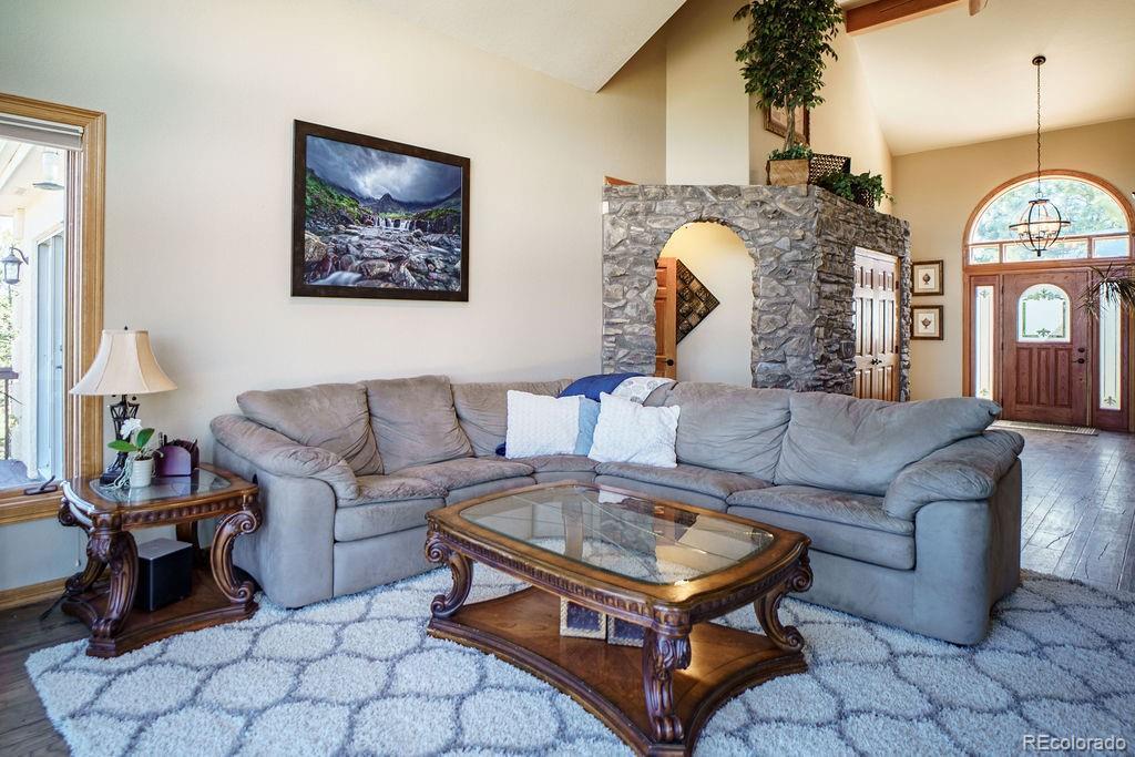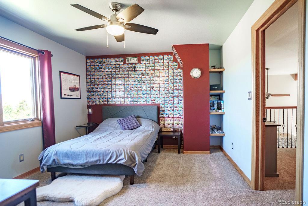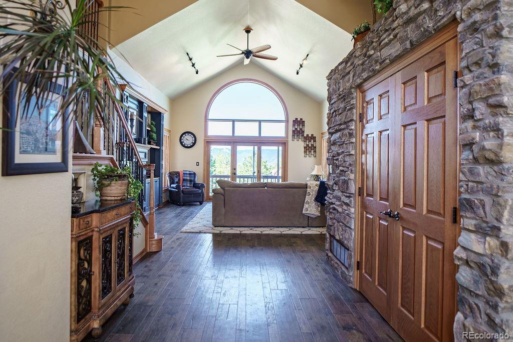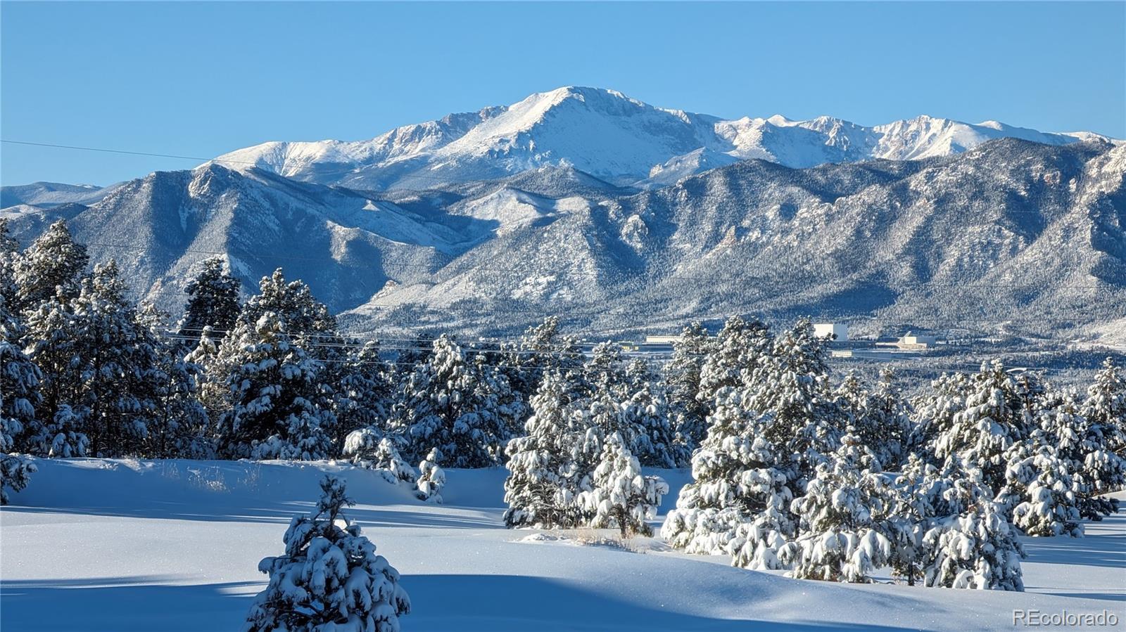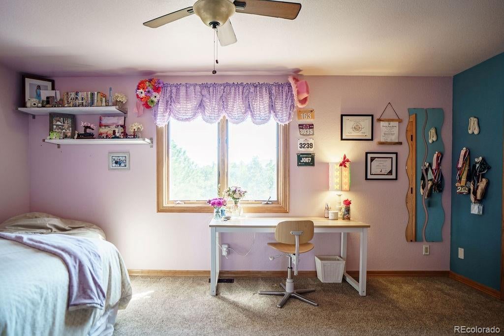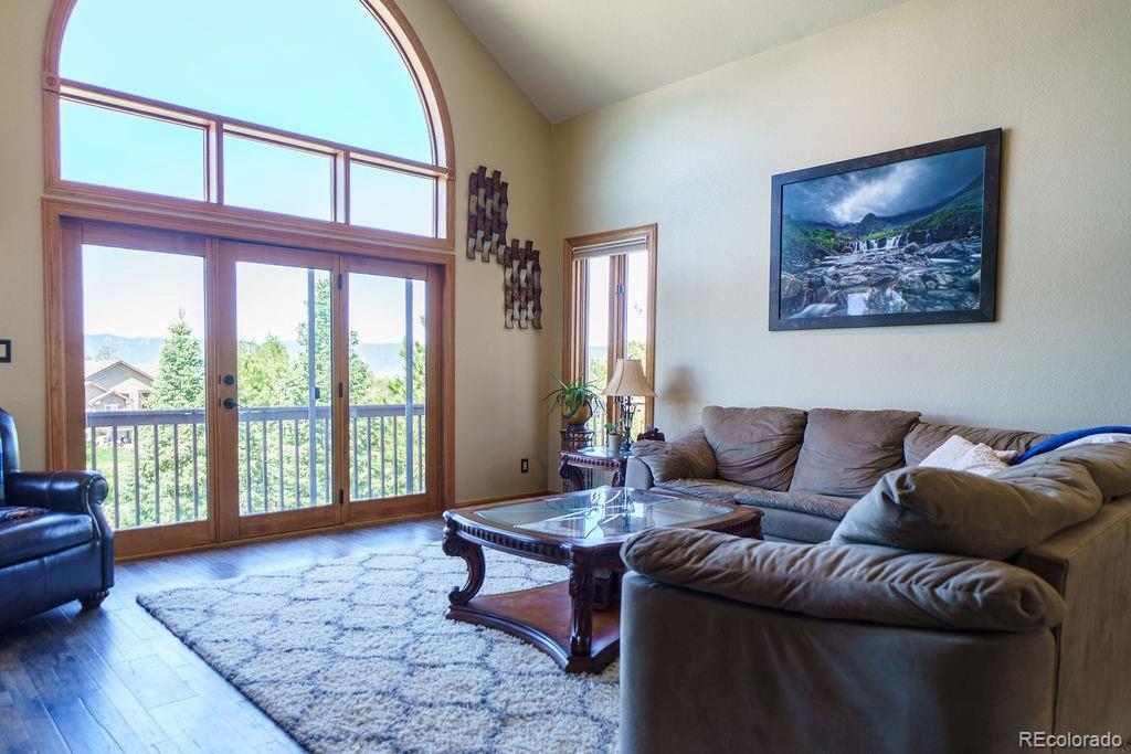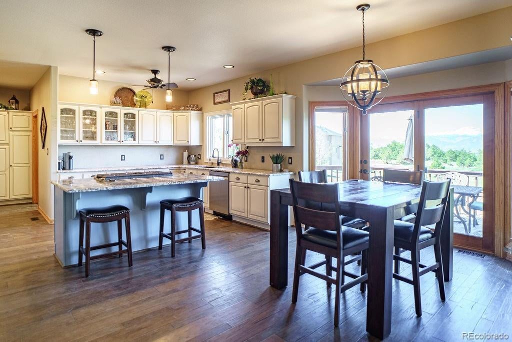 BACK ON THE MARKET WITH UPDATES! Welcome to your 2.5 acre oasis, w/new stucco and soon new composite shingle roof, nestled on a private, treed lot with magnificent views of the mountains! This 2 story home offers a main level primary bedroom (access to the rear deck) with an attached 5-piece bath (heated floors) and walk-in closet. Head upstairs to the 2 bedrooms w/a jack-and-jill bath AND a super cute loft between the bedrooms that could be used as a toy/play/lounging area. The main level also boasts a very spacious carpeted office near the front door and a lovely formal dining room w/access to the dry bar and kitchen. In the eat-in kitchen you'll find a 2-sided fireplace, room for a kitchen table, island with stovetop, and the flexibility to walk out to the elongated deck to enjoy the majestic views of Pikes Peak. Head downstairs to the unfinished, 2000 s.f. walk-out basement to see the endless possibilities. You want want to miss this gem of a home located in D-38!