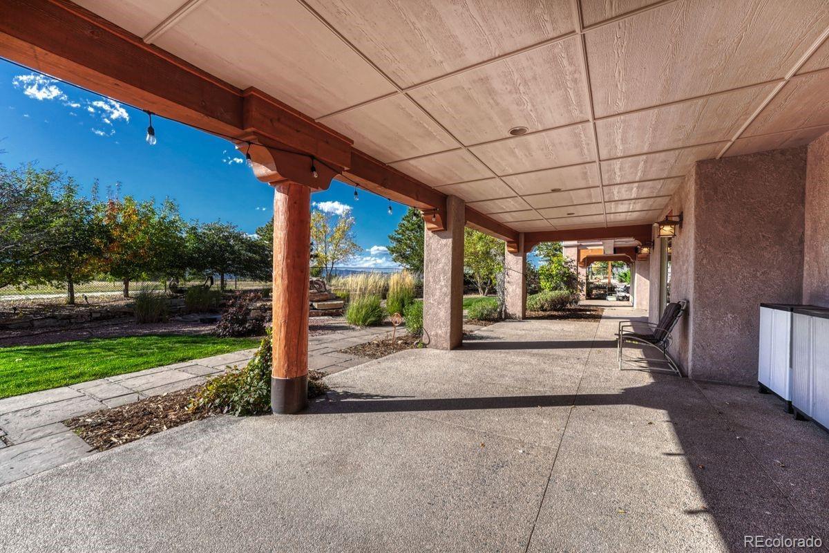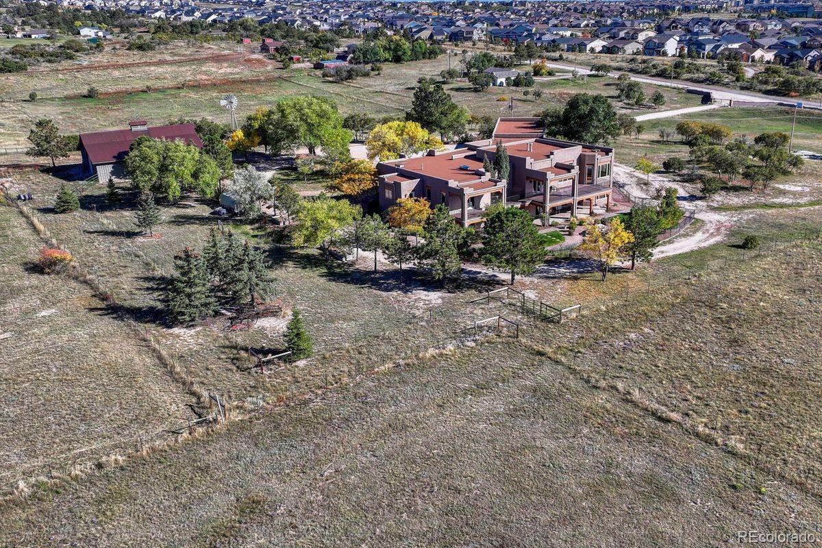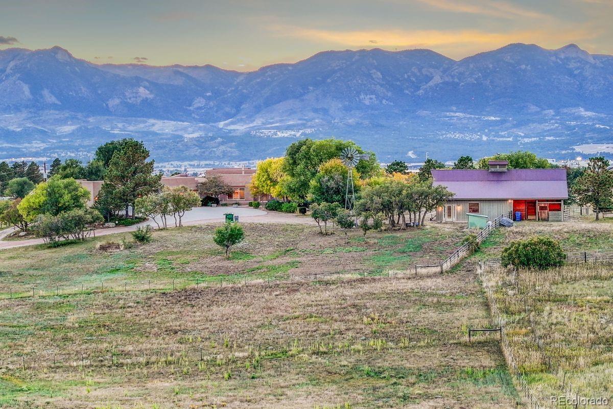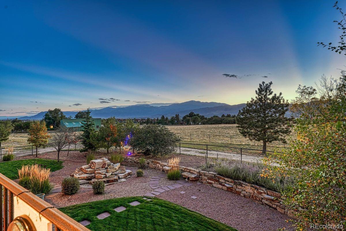 Contemporary Hacienda-inspired estate located in sought after and close-in southwest Black Forest on 6.27 acres. Sweeping 180 mile views of Pikes Peak, the surrounding mountains and the twinkling city lights in the evening. Sprawling luxury ranch home w/ stunning Spanish architecture spans over 10,000 square feet w/ walk-out basement, living areas designed around phenomenal view corridors with indoor-outdoor living at top of mind, all ensuite primary bedrooms, 3 laundry rooms, 6 baths and an expansive 78x11 composite deck with the captivating mountain views. Four car attached, heated and oversized garage. Stylish 39x48 workshop/RV garage/barn with electric, two animal stalls, large overhead door with water and electric. This is the best of both worlds - living on serene acreage w/ no covenants or HOA while having the best amenities mere minutes from your location. Over 2,000 acres of open space w/ equestrian trails, playgrounds and parks within 10 minutes. Quick access to two major hospitals, the Air Force Academy, The Flying Horse Golf Course and all of the amenities of Briargate and Northgate. Gormet kitchen w/ two tone cabinetry, gas commercial range, Sub-zero refrigerator, warming drawer, pot filler, slab stone counters, gorgeous wood floors and an abundance of storage. Four primary suites - two on each level. The home features sprawling room sizes, expansive high quality windows centered on views, central air conditioning, wood beamed ceilings, custom built-ins, 3 fireplaces, tall ceilings throughout, high end trim, crown moulding and doors. Finished walk-out lower level w/ secondary kitchen, 3rd laundry, large wet bar, theater room and family room. Lush landscape w/ boulder water feature, lush green lawns, beautiful flower, a variety of trees, fenced yard, raised garden beds and a greenhouse. Zoned for horses, additional outbuildings and other animals. Fenced and electronic gate w/ stately stone entrance. All paved and county maintained roads to the property.