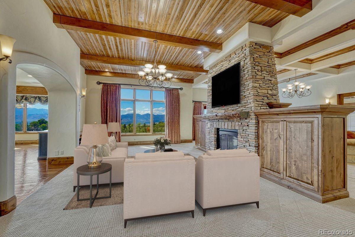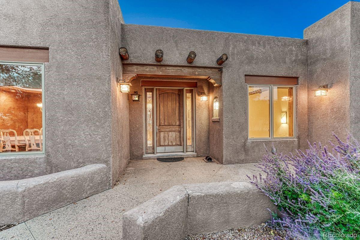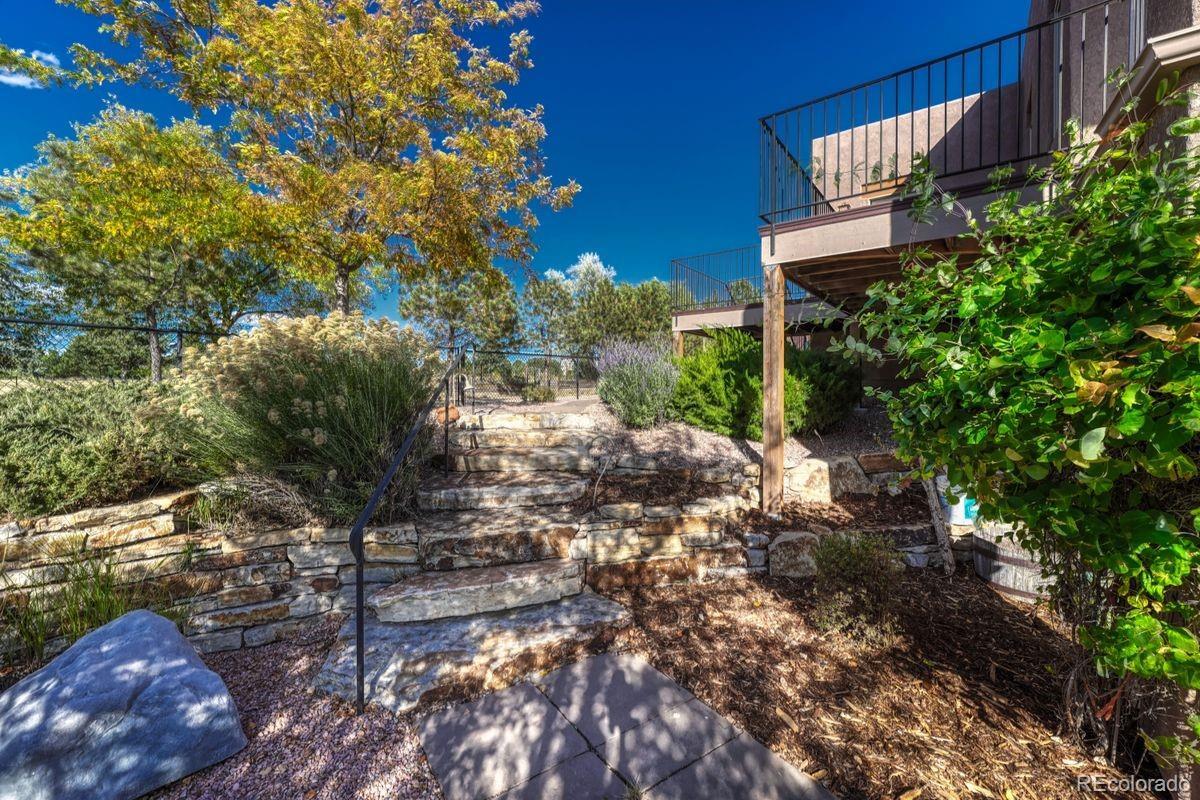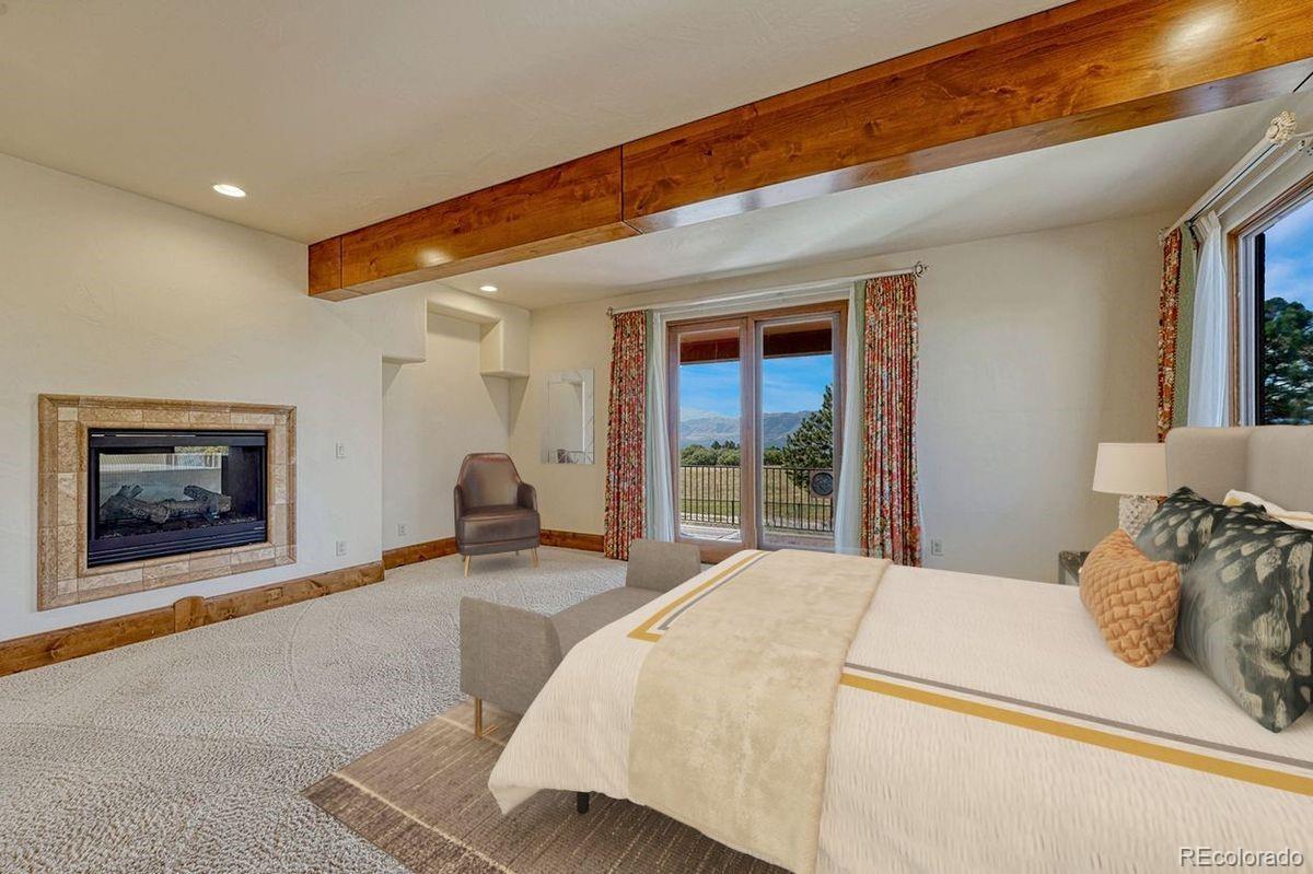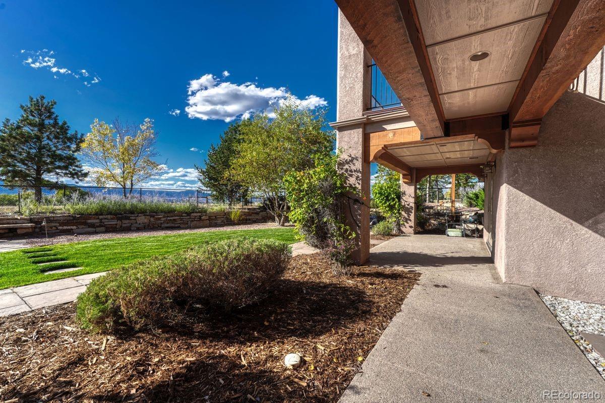 Contemporary Hacienda-inspired estate located in sought after and close-in southwest Black Forest on 6.27 acres. Sweeping 180 mile views of Pikes Peak, the surrounding mountains and the twinkling city lights in the evening. Sprawling luxury ranch home w/ stunning Spanish architecture spans over 10,000 square feet w/ walk-out basement, living areas designed around phenomenal view corridors with indoor-outdoor living at top of mind, all ensuite primary bedrooms, 3 laundry rooms, 6 baths and an expansive 78x11 composite deck with the captivating mountain views. Four car attached, heated and oversized garage. Stylish 39x48 workshop/RV garage/barn with electric, two animal stalls, large overhead door with water and electric. This is the best of both worlds - living on serene acreage w/ no covenants or HOA while having the best amenities mere minutes from your location. Over 2,000 acres of open space w/ equestrian trails, playgrounds and parks within 10 minutes. Quick access to two major hospitals, the Air Force Academy, The Flying Horse Golf Course and all of the amenities of Briargate and Northgate. Gormet kitchen w/ two tone cabinetry, gas commercial range, Sub-zero refrigerator, warming drawer, pot filler, slab stone counters, gorgeous wood floors and an abundance of storage. Four primary suites - two on each level. The home features sprawling room sizes, expansive high quality windows centered on views, central air conditioning, wood beamed ceilings, custom built-ins, 3 fireplaces, tall ceilings throughout, high end trim, crown moulding and doors. Finished walk-out lower level w/ secondary kitchen, 3rd laundry, large wet bar, theater room and family room. Lush landscape w/ boulder water feature, lush green lawns, beautiful flower, a variety of trees, fenced yard, raised garden beds and a greenhouse. Zoned for horses, additional outbuildings and other animals. Fenced and electronic gate w/ stately stone entrance. All paved and county maintained roads to the property.
