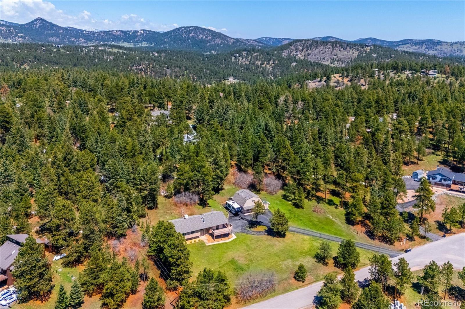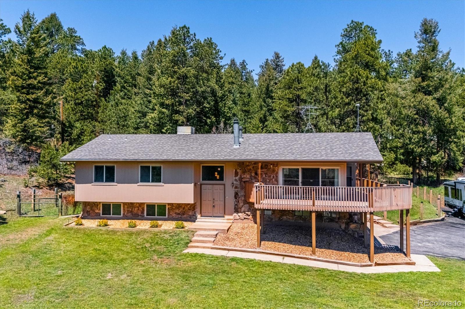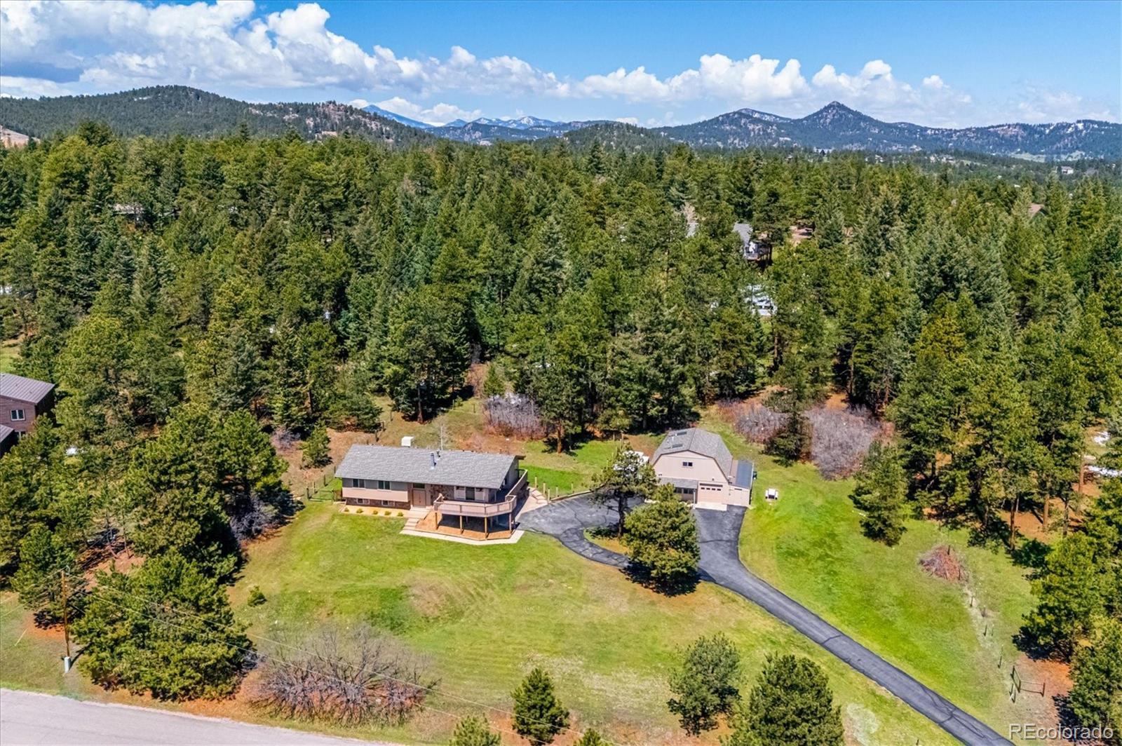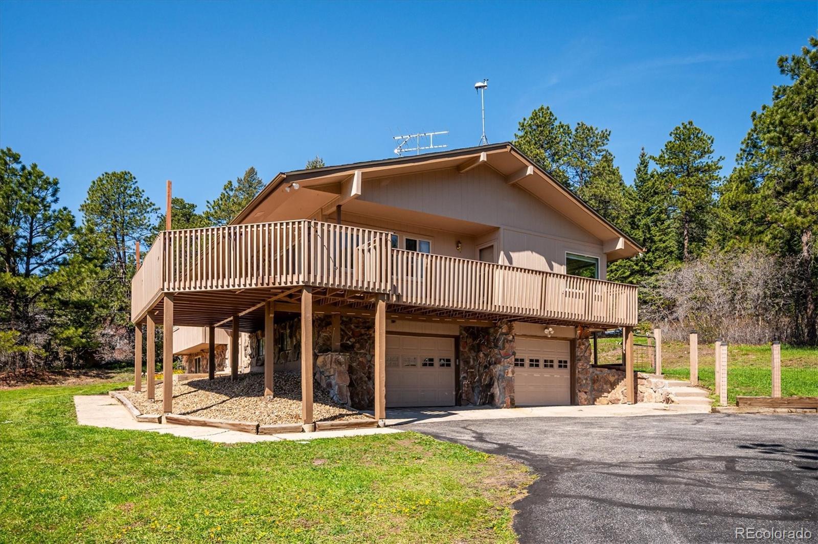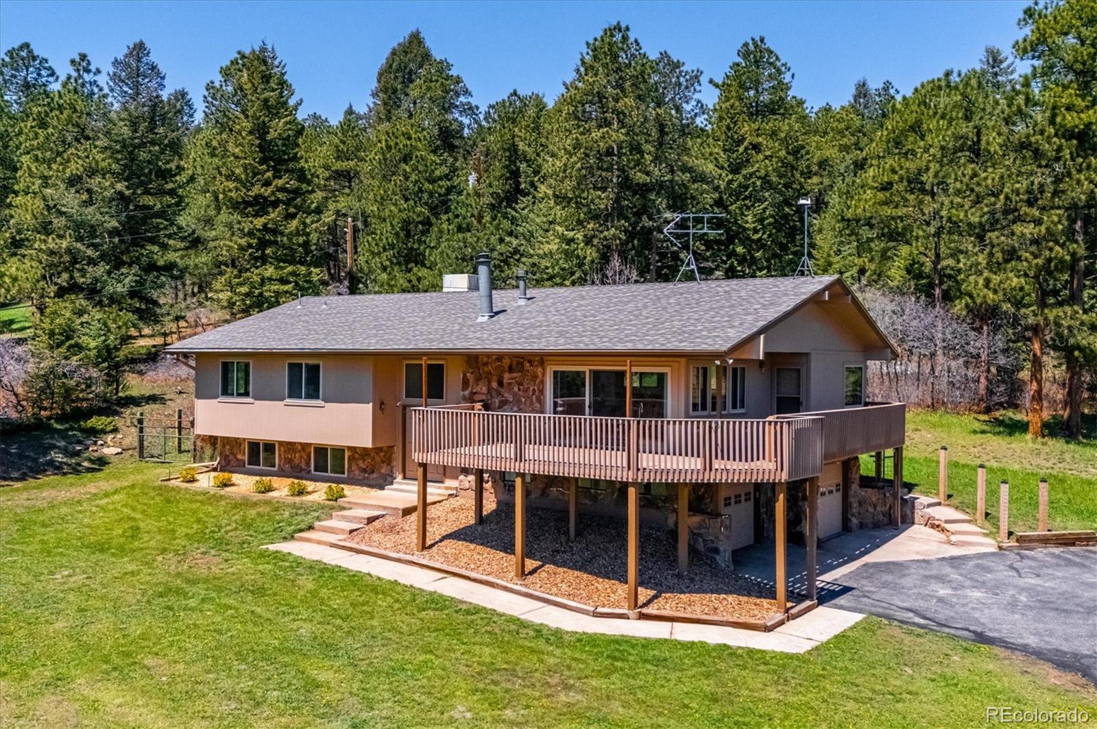 Tucked into a serene, gently sloping 2-acre lot, this updated mountain property offers the perfect blend of comfort, function, and flexibility, plus a rare income-producing opportunity. The standout feature is a fully legal, rentable, county-compliant 1,280 sq ft Accessory Dwelling Unit (ADU). Thoughtfully designed for comfort and independence, the ADU features zero-entry flooring for accessibility, a private 1-bedroom, 1-bathroom layout, full kitchen, laundry appliances, and its own epoxy-coated one-car garage. Upstairs offers additional flexible living space with skylights, a new state-of-the-art HVAC system, and the potential for a second bedroom and bathroom—perfect for guests, a home office, or future rental expansion. The main house has been thoughtfully remodeled with fresh paint inside and out, new durable plank vinyl flooring throughout, and top-down bottom-up honeycomb blinds for customizable light and privacy in every room. Designed for convenient main-level living, the home features a spacious primary suite with two walk-in closets and a beautifully updated kitchen that truly stands out. You'll love the large center island, two ovens, gas stove, luxurious granite countertops, and a modern chef-style workstation sink with a deep stainless steel basin, integrated cutting board and drying rack, finished with a high-arc pull-down spring faucet—this kitchen brings high-end style. A new Class 4 impact-resistant roof tops both the main house and the ADU. Outside, you’ll find a fenced yard, two dog runs, and a domestic well and zoning that allow for animals, making it ideal for those seeking a more self-sufficient mountain lifestyle. There’s also a generator for peace of mind, a designated space for a hot tub, RV parking with plug-ins and black water dump access, and plenty of room to relax and enjoy the beauty of Colorado’s outdoors on the wraparound deck. Unique, updated, and income-producing—this is more than a home; it’s a smart investment in your lifestyle.