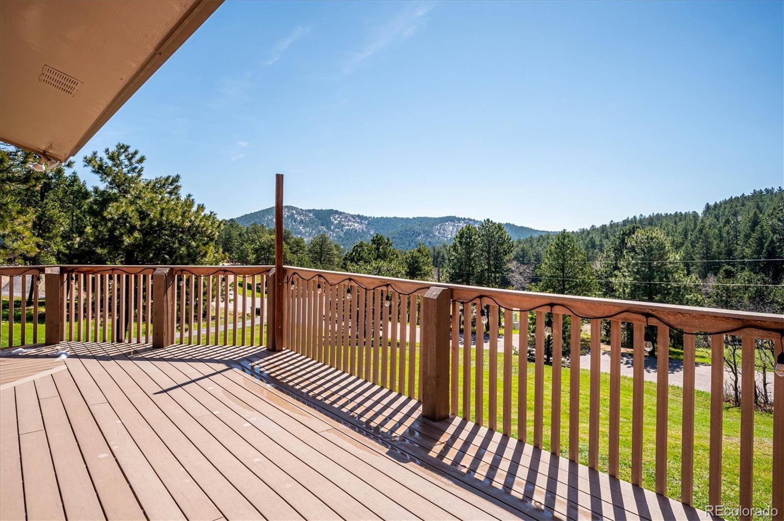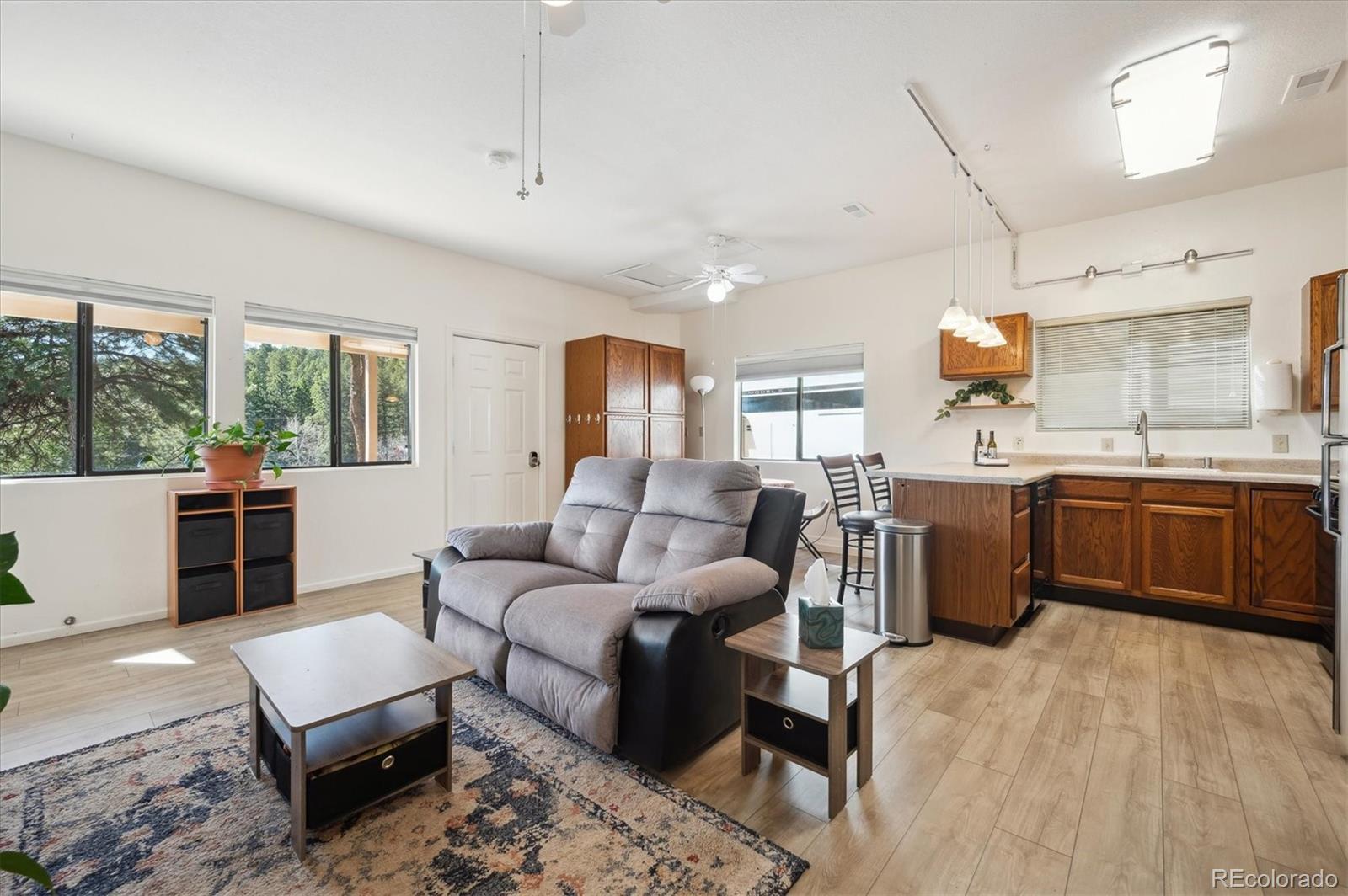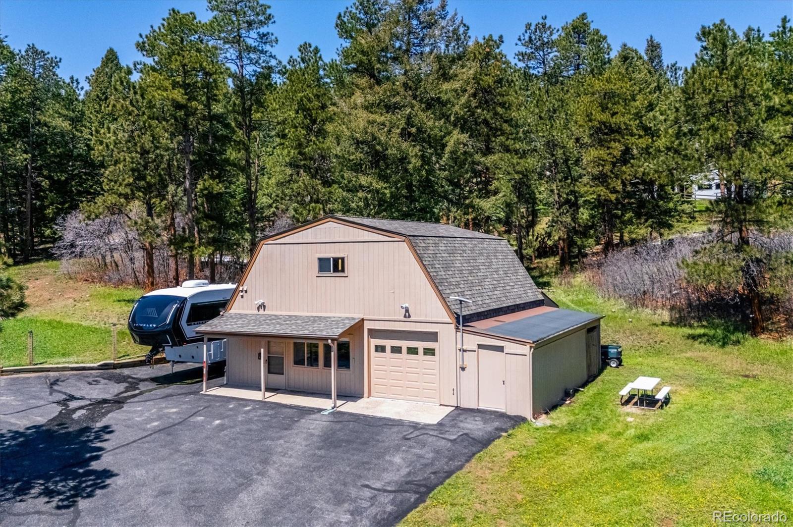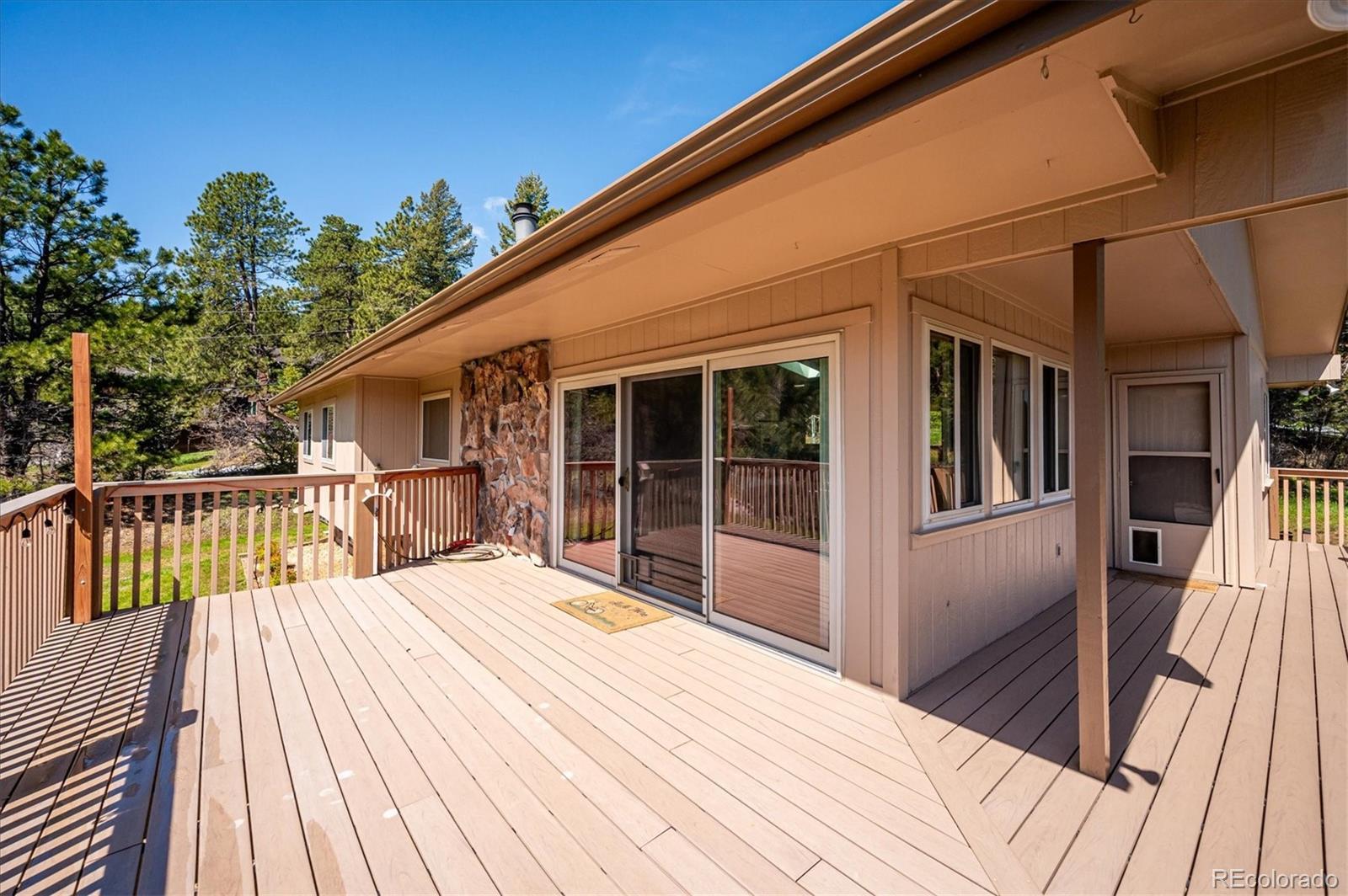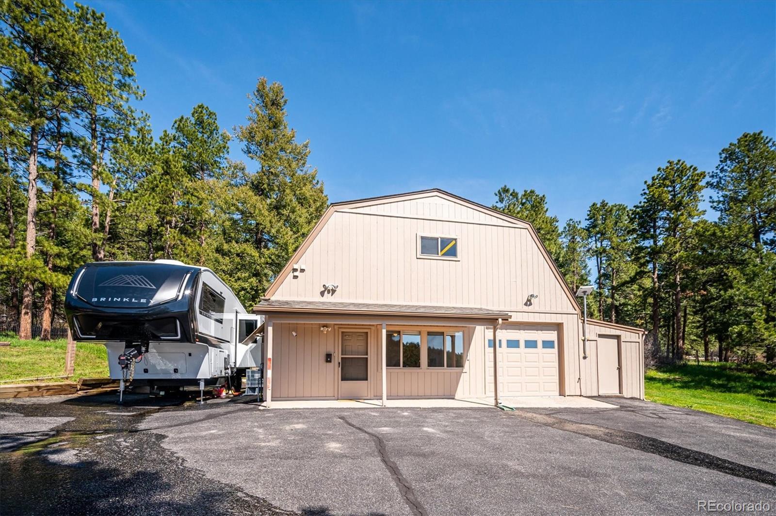 Tucked into a serene, gently sloping 2-acre lot, this updated mountain property offers the perfect blend of comfort, function, and flexibility, plus a rare income-producing opportunity. The standout feature is a fully legal, rentable, county-compliant 1,280 sq ft Accessory Dwelling Unit (ADU). Thoughtfully designed for comfort and independence, the ADU features zero-entry flooring for accessibility, a private 1-bedroom, 1-bathroom layout, full kitchen, laundry appliances, and its own epoxy-coated one-car garage. Upstairs offers additional flexible living space with skylights, a new state-of-the-art HVAC system, and the potential for a second bedroom and bathroom—perfect for guests, a home office, or future rental expansion. The main house has been thoughtfully remodeled with fresh paint inside and out, new durable plank vinyl flooring throughout, and top-down bottom-up honeycomb blinds for customizable light and privacy in every room. Designed for convenient main-level living, the home features a spacious primary suite with two walk-in closets and a beautifully updated kitchen that truly stands out. You'll love the large center island, two ovens, gas stove, luxurious granite countertops, and a modern chef-style workstation sink with a deep stainless steel basin, integrated cutting board and drying rack, finished with a high-arc pull-down spring faucet—this kitchen brings high-end style. A new Class 4 impact-resistant roof tops both the main house and the ADU. Outside, you’ll find a fenced yard, two dog runs, and a domestic well and zoning that allow for animals, making it ideal for those seeking a more self-sufficient mountain lifestyle. There’s also a generator for peace of mind, a designated space for a hot tub, RV parking with plug-ins and black water dump access, and plenty of room to relax and enjoy the beauty of Colorado’s outdoors on the wraparound deck. Unique, updated, and income-producing—this is more than a home; it’s a smart investment in your lifestyle.