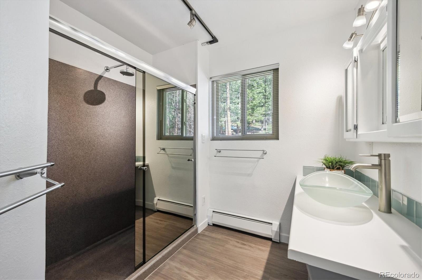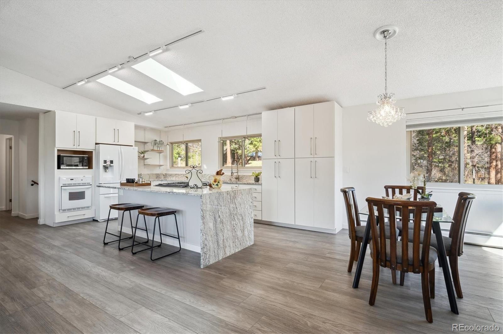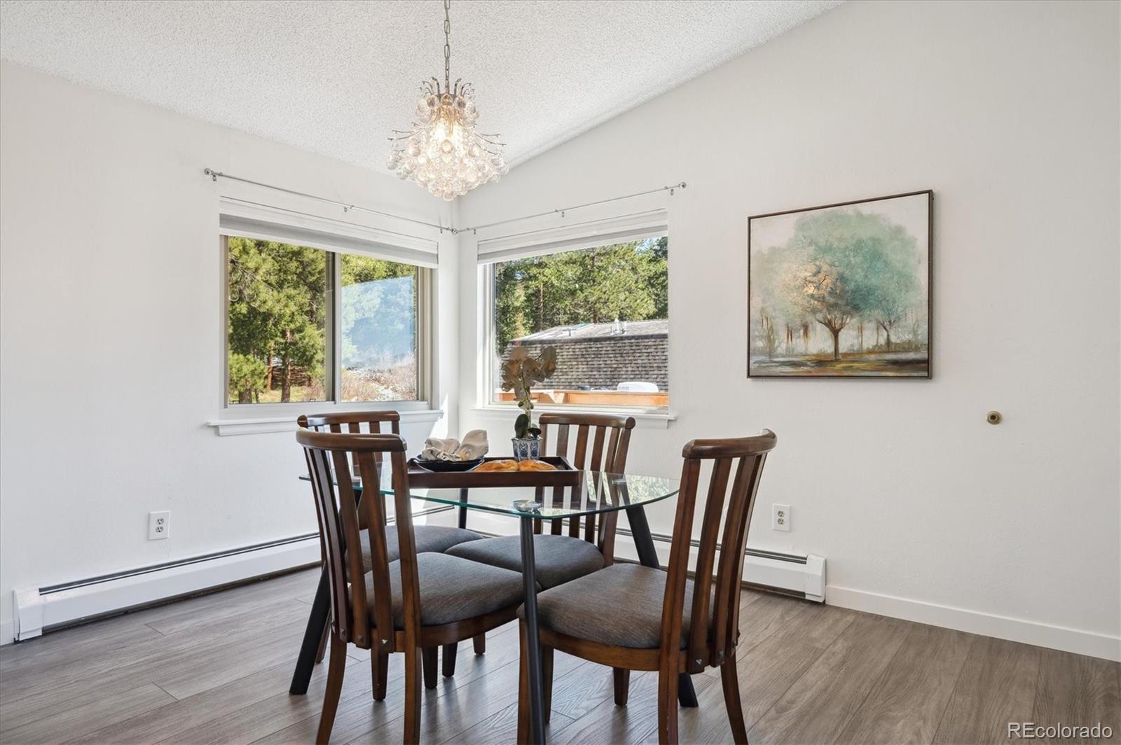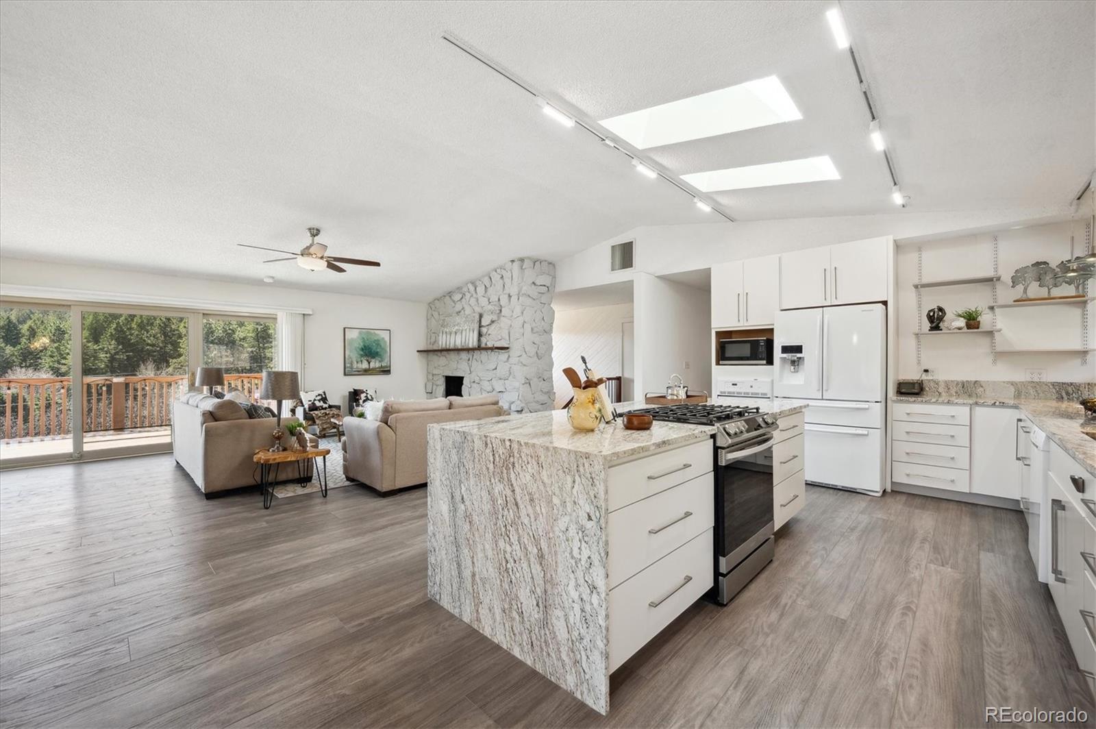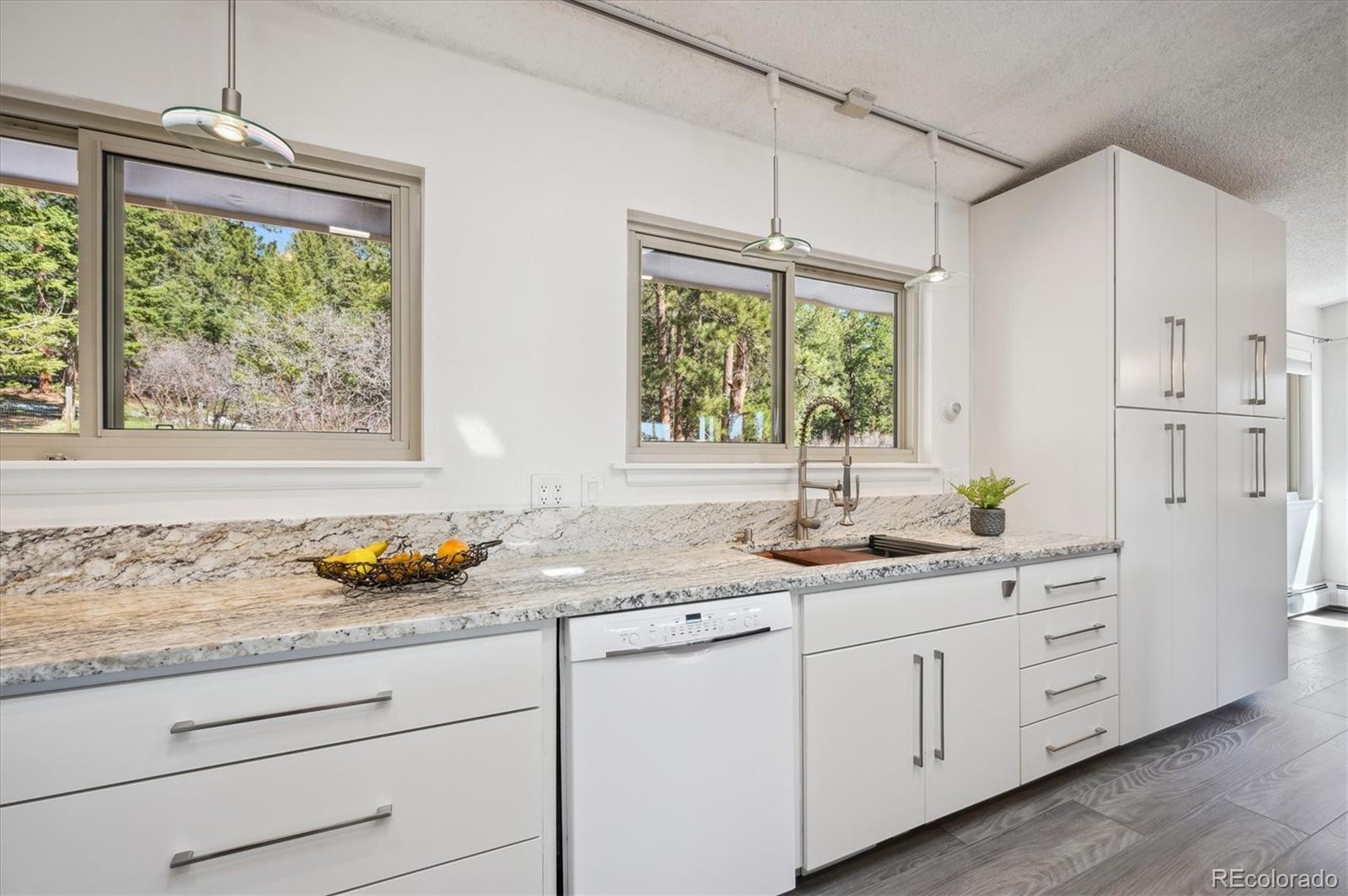 Tucked into a serene, gently sloping 2-acre lot, this updated mountain property offers the perfect blend of comfort, function, and flexibility, plus a rare income-producing opportunity. The standout feature is a fully legal, rentable, county-compliant 1,280 sq ft Accessory Dwelling Unit (ADU). Thoughtfully designed for comfort and independence, the ADU features zero-entry flooring for accessibility, a private 1-bedroom, 1-bathroom layout, full kitchen, laundry appliances, and its own epoxy-coated one-car garage. Upstairs offers additional flexible living space with skylights, a new state-of-the-art HVAC system, and the potential for a second bedroom and bathroom—perfect for guests, a home office, or future rental expansion. The main house has been thoughtfully remodeled with fresh paint inside and out, new durable plank vinyl flooring throughout, and top-down bottom-up honeycomb blinds for customizable light and privacy in every room. Designed for convenient main-level living, the home features a spacious primary suite with two walk-in closets and a beautifully updated kitchen that truly stands out. You'll love the large center island, two ovens, gas stove, luxurious granite countertops, and a modern chef-style workstation sink with a deep stainless steel basin, integrated cutting board and drying rack, finished with a high-arc pull-down spring faucet—this kitchen brings high-end style. A new Class 4 impact-resistant roof tops both the main house and the ADU. Outside, you’ll find a fenced yard, two dog runs, and a domestic well and zoning that allow for animals, making it ideal for those seeking a more self-sufficient mountain lifestyle. There’s also a generator for peace of mind, a designated space for a hot tub, RV parking with plug-ins and black water dump access, and plenty of room to relax and enjoy the beauty of Colorado’s outdoors on the wraparound deck. Unique, updated, and income-producing—this is more than a home; it’s a smart investment in your lifestyle.