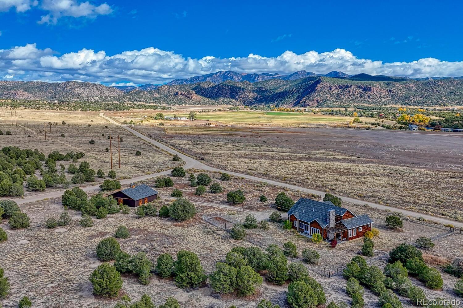 Beautiful Custom Built Mountain home on 5 + acres including a 1600 square foot barn. Built by SKT construction in 2010, this is a very special 2584 square foot home boasting one level living, open floor plan beautifully designed with 3 bedrooms and 2 baths. Features include 10 foot high ceilings, wood ceiling beams, several built-in book shelves, two fireplaces, Chef's kitchen with Sub zero refrigerator, Wolf 6 burner dual gas stove and marble countertops. The flooring is absolutely beautiful with natural stone and Sawed oak throughout. Uniquely designed with shiplap walls, large windows, glass doors, nice accents and lighting. (This home will remind you of a home designed by "Chip and Joanna" on HGTV. ) The primary suite features a fireplace, bookshelves, views of the 14,000 foot mountain ranges and attached 5 piece bath resort style boasting a marble tile shower, double vanities and walk in closet. Two additional bedrooms are located on the far side of the home with a full bathroom. Lots of light, outdoor spaces, front porch, back patios, interior fencing in the front yard, privacy, fabulous mountain views and a 2 car attached garage. There is an unfinished attic if you ever wanted to expand. The property is 5 plus acres with a 1600 square foot barn including a private finished office space, art or music room and 2 horse stalls, water and electric. The well allows for watering of domestic animals and irrigation. Located less than 10 miles from "Historic Downtown Salida". Close to Arkansas river access and public recreational land. This is a must see home. By appointment.