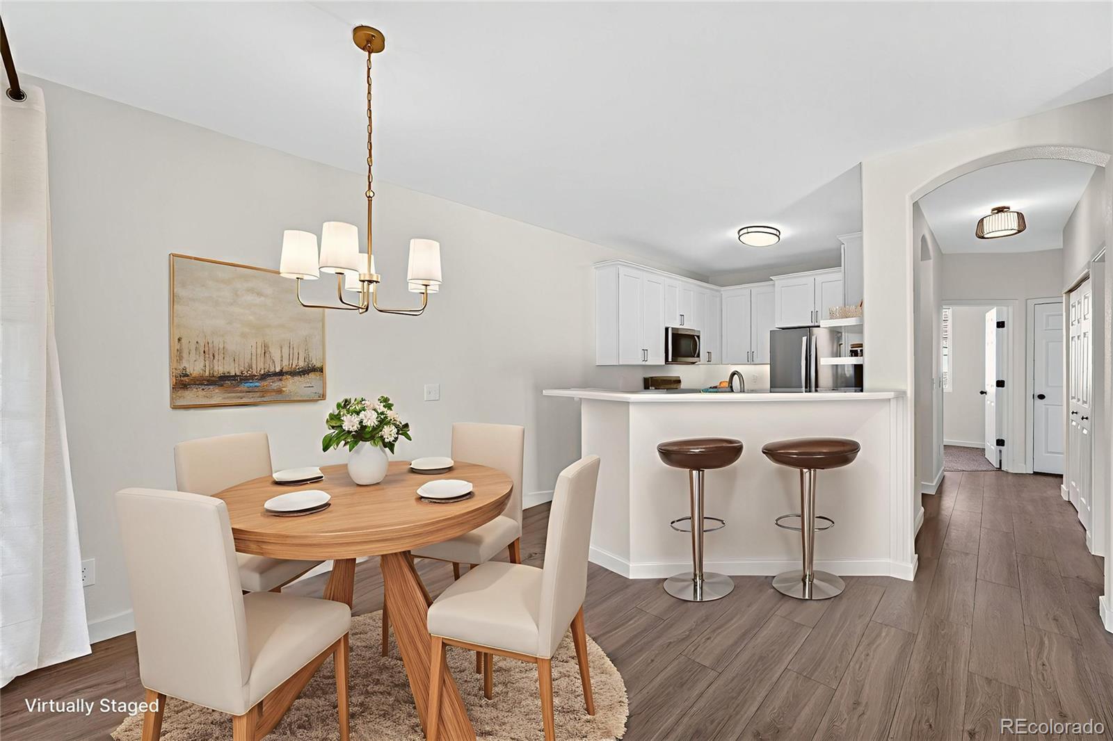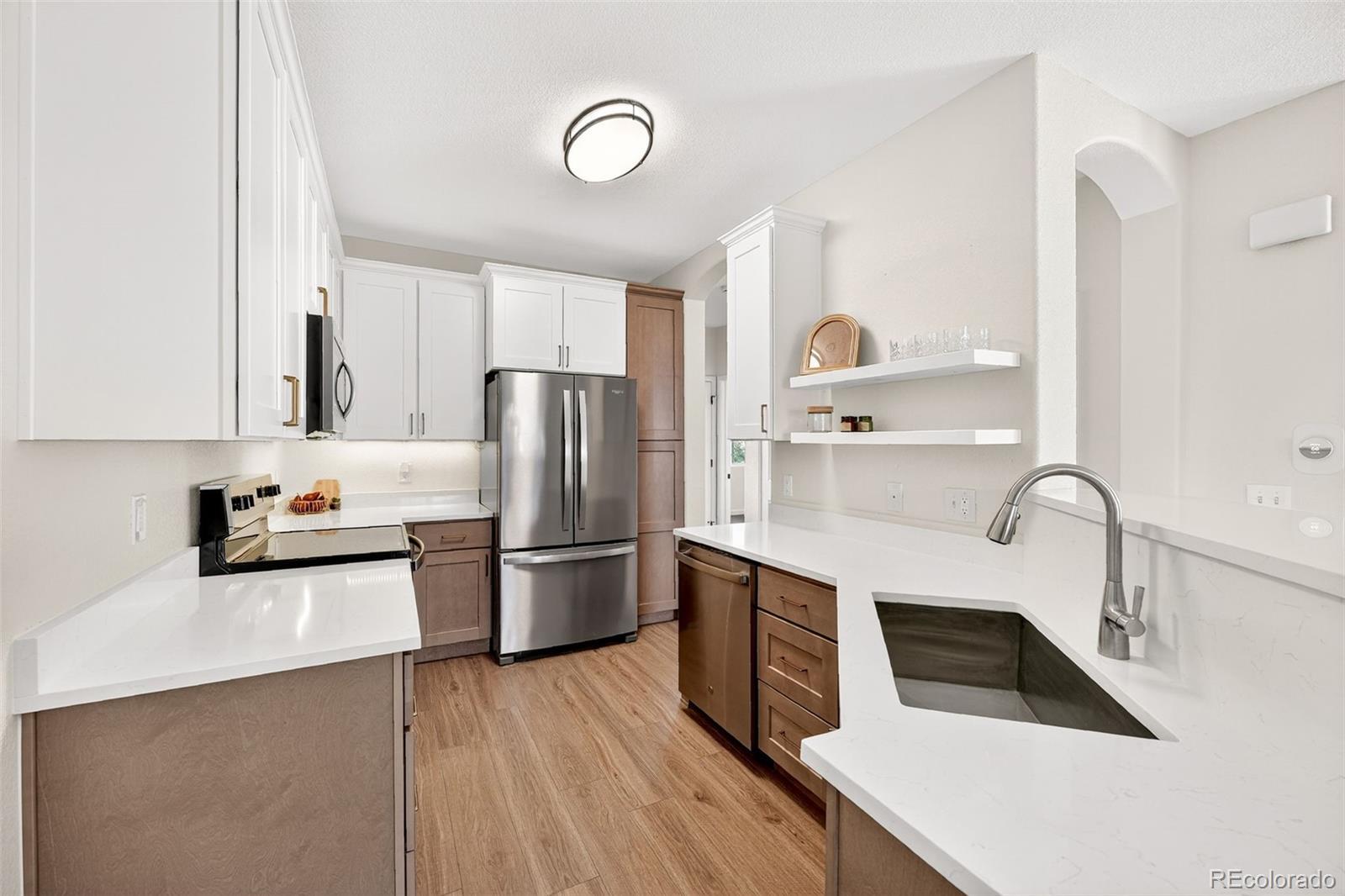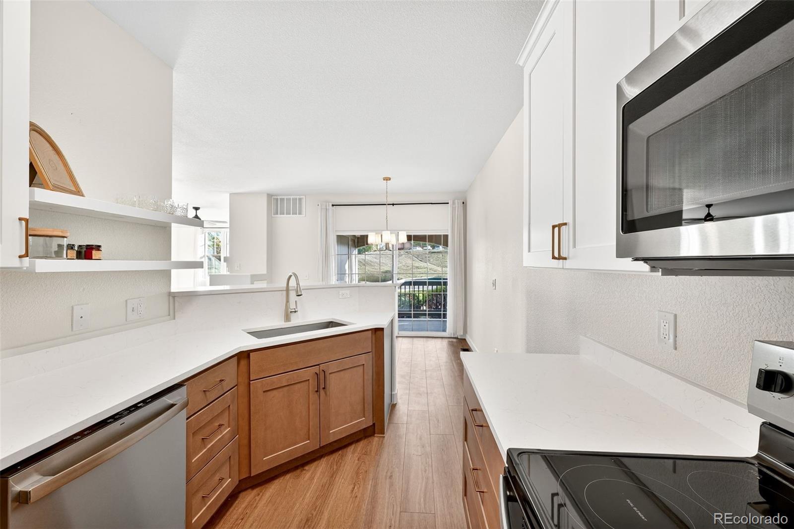 This is the one you've been waiting for! Fully renovated, sunny South-facing unit in coveted Fox Creek Condos. Open floor plan with generous living room, dining room & open kitchen - great for every day living & joyous gatherings. Cozy up to the gas fireplace - surrounded by built-ins, or enjoy an evening cooking for family and friends in the gourmet kitchen. High-end cabinets maximize storage space (including pantry), and there is ample prep space on the beautiful quartz counter tops. Luxurious single basin sink and open shelves add style and functionality. HW floors (luxury vinyl plank) throughout common spaces, and brand new carpet in both bedrooms. Spacious primary suite with walk-in closet, and large bathroom with double vanity. Second bedroom also generously sized. Hard to find, in-unit washer & dryer- as well as huge storage closet outfitted to be a work-from-home-space that's easy to close-up and have 'disappear'. As lovely as it is versatile, this unit lives larger than the sqft would suggest. Private patio, oversized 1 car garage (that fits most pick-up trucks) and 1 additional off-street parking space. Right on the Niver Open space connecting you to miles of trails. Walk to coffee shops, parks & restaurants. Easy HWY access connects you to the rest of the Metro! Truly a gem - this is one you won't want to miss!