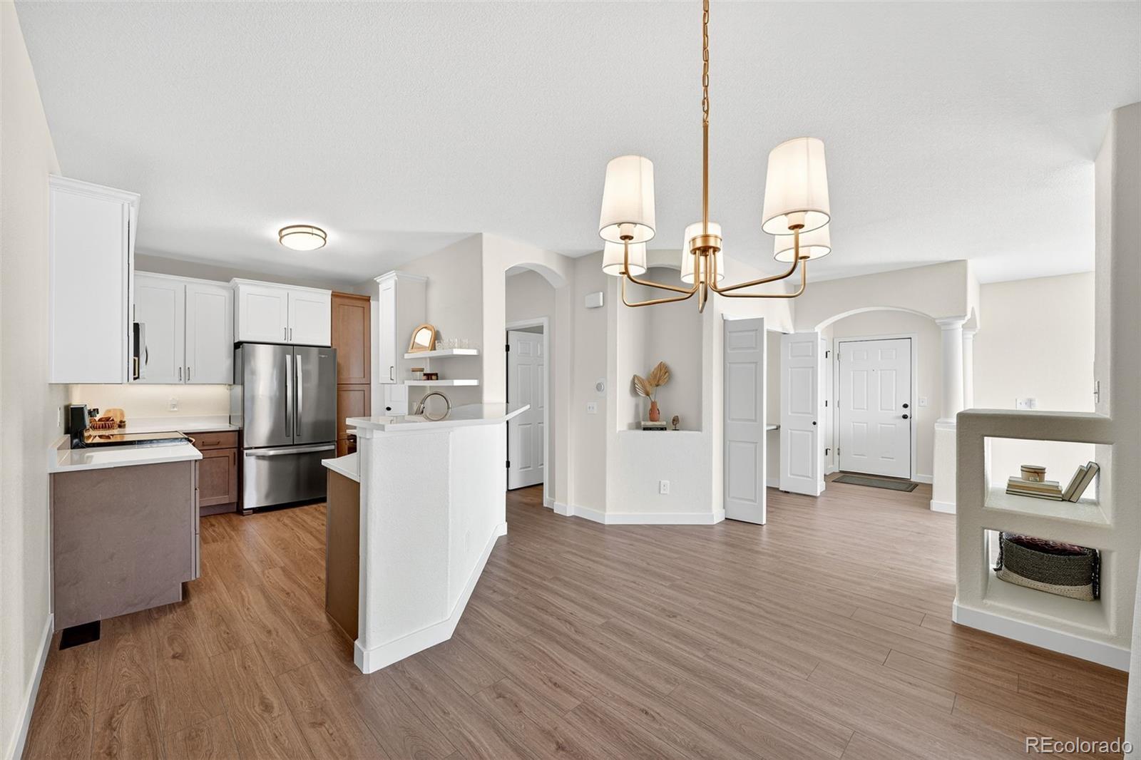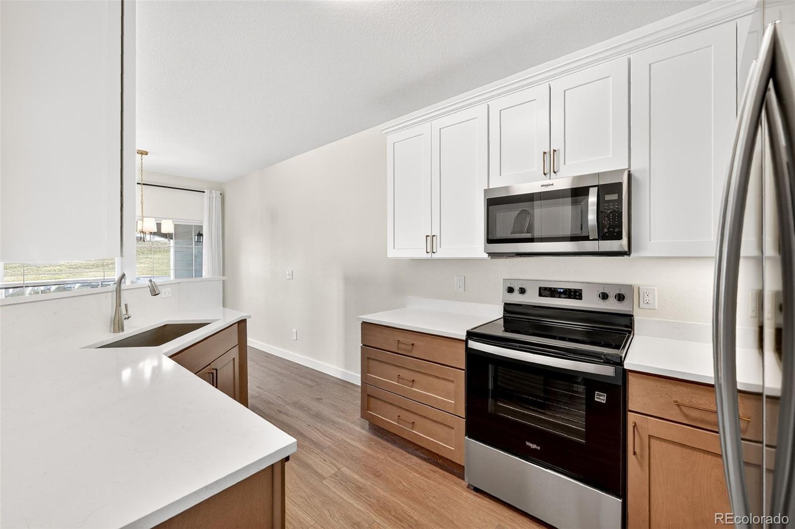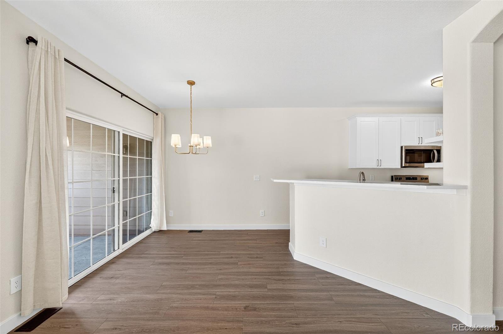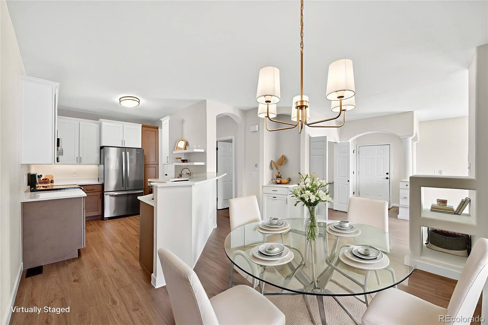 This is the one you've been waiting for! Fully renovated, sunny South-facing unit in coveted Fox Creek Condos. Open floor plan with generous living room, dining room & open kitchen - great for every day living & joyous gatherings. Cozy up to the gas fireplace - surrounded by built-ins, or enjoy an evening cooking for family and friends in the gourmet kitchen. High-end cabinets maximize storage space (including pantry), and there is ample prep space on the beautiful quartz counter tops. Luxurious single basin sink and open shelves add style and functionality. HW floors (luxury vinyl plank) throughout common spaces, and brand new carpet in both bedrooms. Spacious primary suite with walk-in closet, and large bathroom with double vanity. Second bedroom also generously sized. Hard to find, in-unit washer & dryer- as well as huge storage closet outfitted to be a work-from-home-space that's easy to close-up and have 'disappear'. As lovely as it is versatile, this unit lives larger than the sqft would suggest. Private patio, oversized 1 car garage (that fits most pick-up trucks) and 1 additional off-street parking space. Right on the Niver Open space connecting you to miles of trails. Walk to coffee shops, parks & restaurants. Easy HWY access connects you to the rest of the Metro! Truly a gem - this is one you won't want to miss!