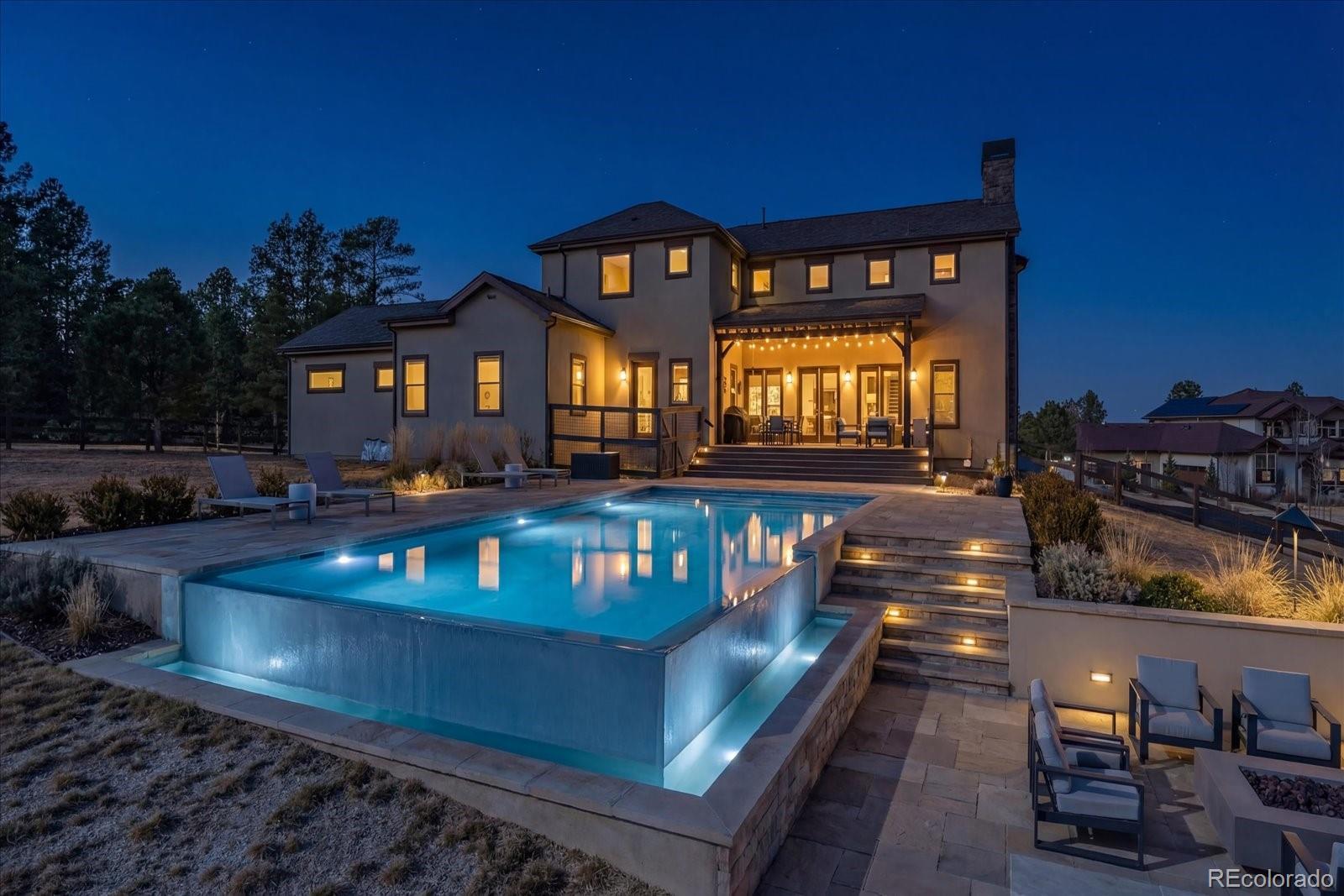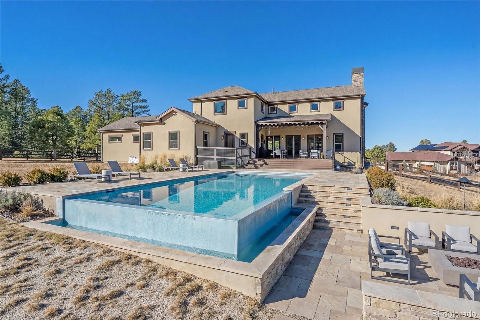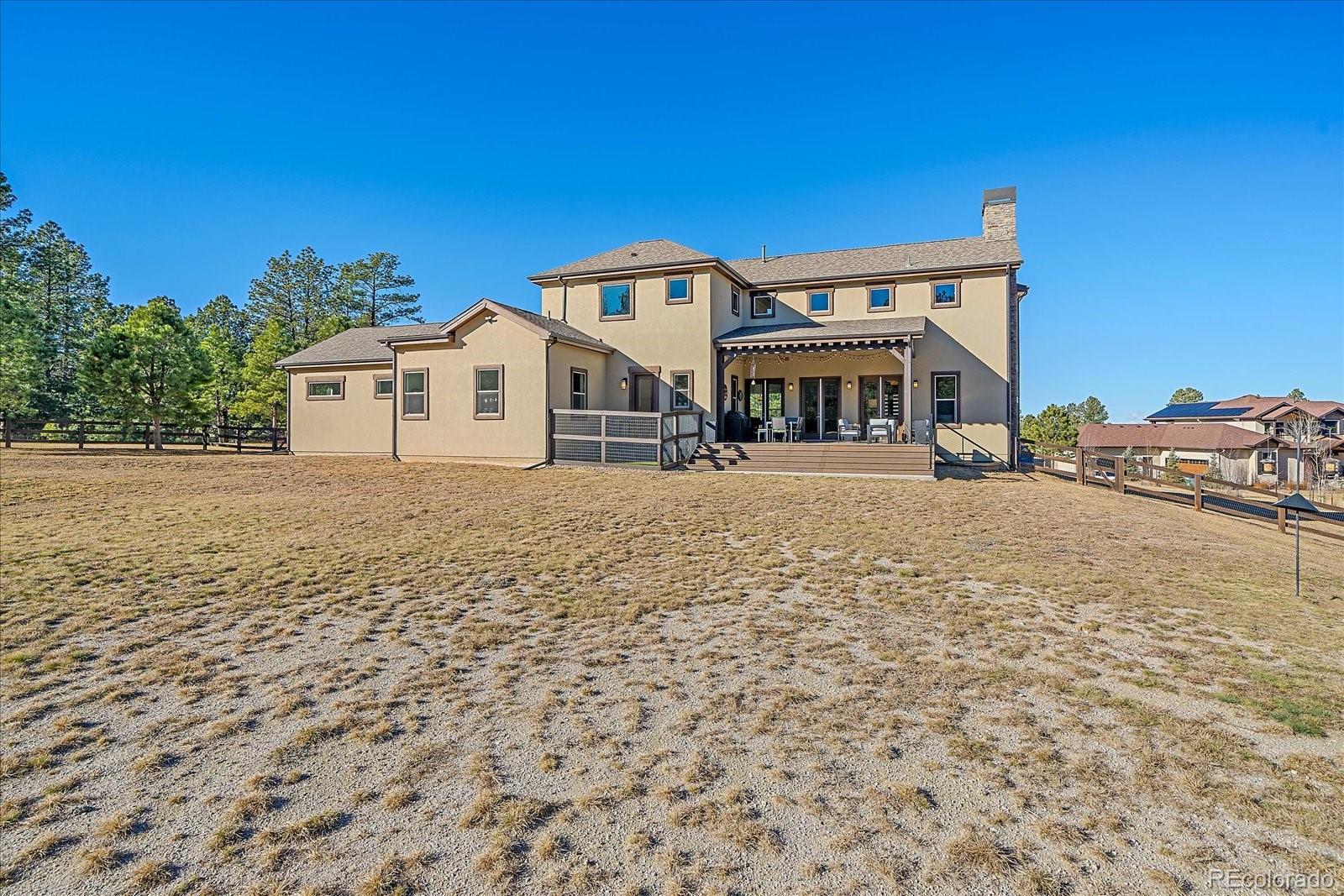 Set behind the gates of Preserve at Deerfield, this exceptional custom residence offers nearly four acres of privacy, luxury, & thoughtful design. Perfectly positioned for both tranquility & convenience, the home provides easy access to city essentials, DIA, & CO Springs Airport, making it ideal for buyers seeking a refined acreage lifestyle without sacrificing connectivity. This 4-bed, 4-bath home offers 4,054 fin sqft with room to expand, situated on a beautifully usable lot. A 3-car oversized garage includes a dedicated workshop, epoxy floors, interior drains, and direct yard access—perfect for hobbyists, or active lifestyles. The chef’s kitchen, featuring a spacious island with dual sinks, Thermador appliances including two dishwashers, 48" cooktop with range hood, 54-bottle wine fridge, & double ovens. Quartz countertops flow throughout the home, complemented by furniture-style vanities and custom bathroom mirrors for a cohesive, elevated finish. Designed with both beauty & function in mind, the home showcases knotty alder beams, a striking mahogany front door, and a one-of-a-kind 1860s hand-cut reclaimed beams. Triplicating French doors seamlessly connect indoor/outdoor living spaces, while the great room windows are pre-wired for future automation. The mudroom provides a walk-in pantry with an Elfa system and pocket door, & dog run with 6’ fencing. The main-floor office features a custom barn door and hidden closet storage, ideal for secure files or a private vault. Outdoor living is equally impressive with a 24'x18' herringbone deck, cable railing, drip irrigation for trees and landscaping —perfect for entertaining or quiet evenings under Colorado skies. The primary suite offers a five-piece spa bath with a freestanding tub, oversized shower, & a walk-in closet with built-ins. Other conveniences include an upstairs laundry room & loft. With basement framing already started for future expansion, this home offers immediate luxury and long-term flexibility.