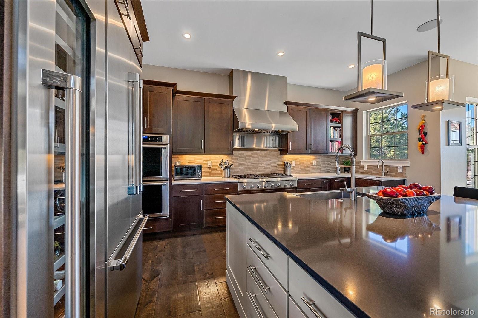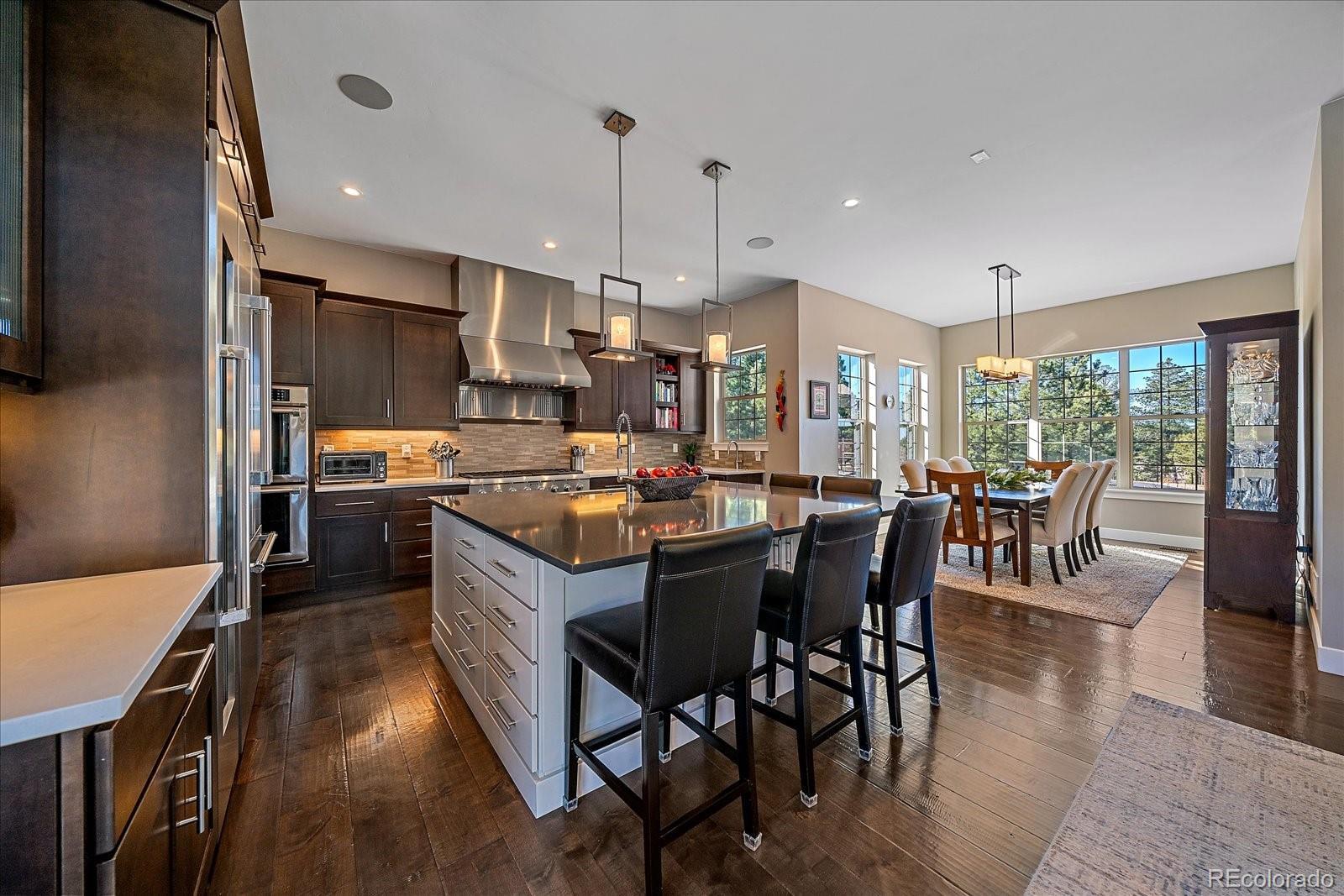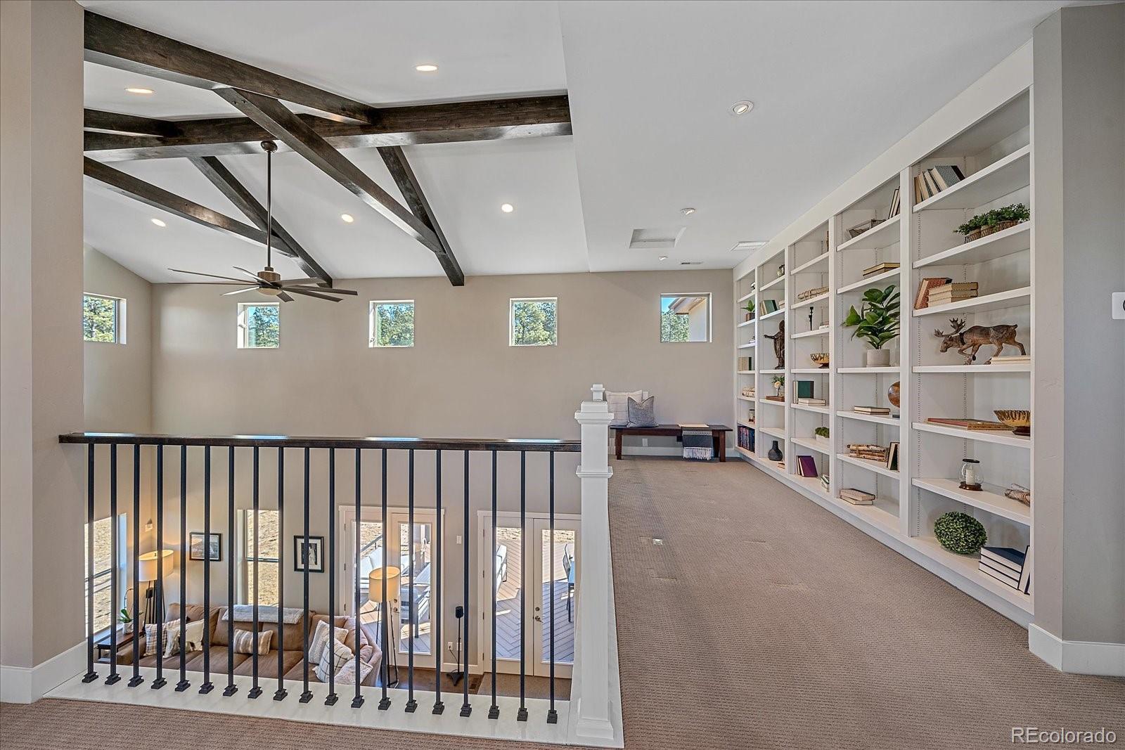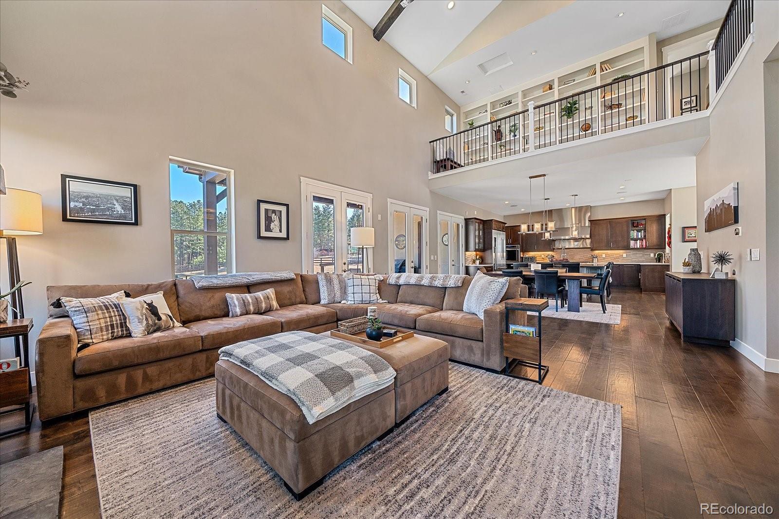 Set behind the gates of Preserve at Deerfield, this exceptional custom residence offers nearly four acres of privacy, luxury, & thoughtful design. Perfectly positioned for both tranquility & convenience, the home provides easy access to city essentials, DIA, & CO Springs Airport, making it ideal for buyers seeking a refined acreage lifestyle without sacrificing connectivity. This 4-bed, 4-bath home offers 4,054 fin sqft with room to expand, situated on a beautifully usable lot. A 3-car oversized garage includes a dedicated workshop, epoxy floors, interior drains, and direct yard access—perfect for hobbyists, or active lifestyles. The chef’s kitchen, featuring a spacious island with dual sinks, Thermador appliances including two dishwashers, 48" cooktop with range hood, 54-bottle wine fridge, & double ovens. Quartz countertops flow throughout the home, complemented by furniture-style vanities and custom bathroom mirrors for a cohesive, elevated finish. Designed with both beauty & function in mind, the home showcases knotty alder beams, a striking mahogany front door, and a one-of-a-kind 1860s hand-cut reclaimed beams. Triplicating French doors seamlessly connect indoor/outdoor living spaces, while the great room windows are pre-wired for future automation. The mudroom provides a walk-in pantry with an Elfa system and pocket door, & dog run with 6’ fencing. The main-floor office features a custom barn door and hidden closet storage, ideal for secure files or a private vault. Outdoor living is equally impressive with a 24'x18' herringbone deck, cable railing, drip irrigation for trees and landscaping —perfect for entertaining or quiet evenings under Colorado skies. The primary suite offers a five-piece spa bath with a freestanding tub, oversized shower, & a walk-in closet with built-ins. Other conveniences include an upstairs laundry room & loft. With basement framing already started for future expansion, this home offers immediate luxury and long-term flexibility.