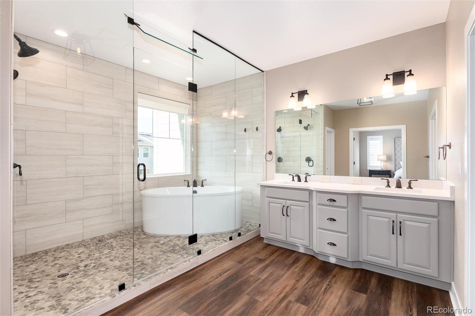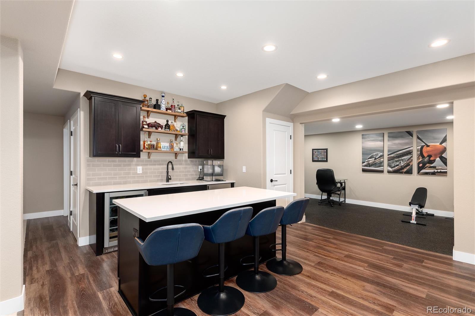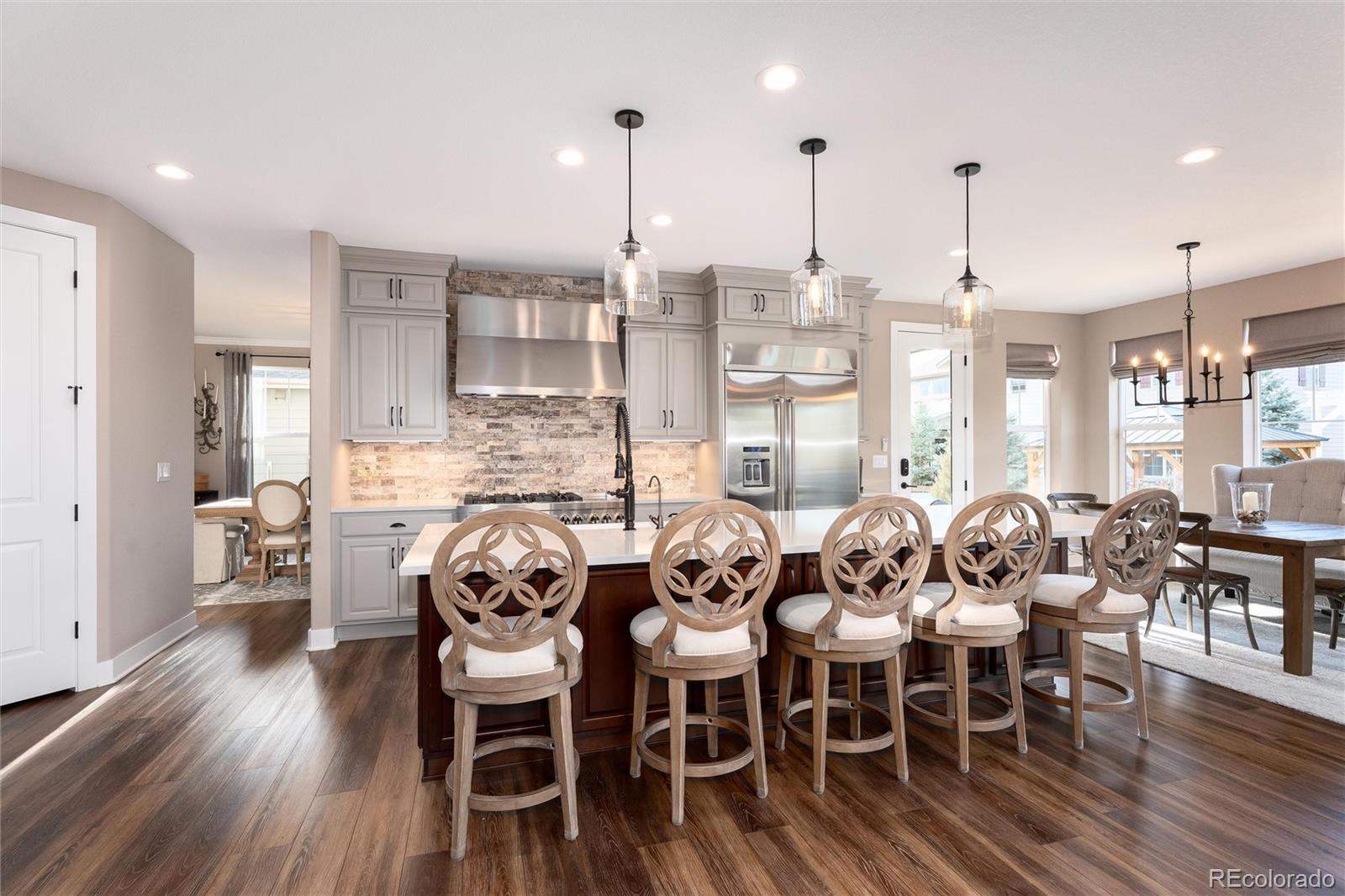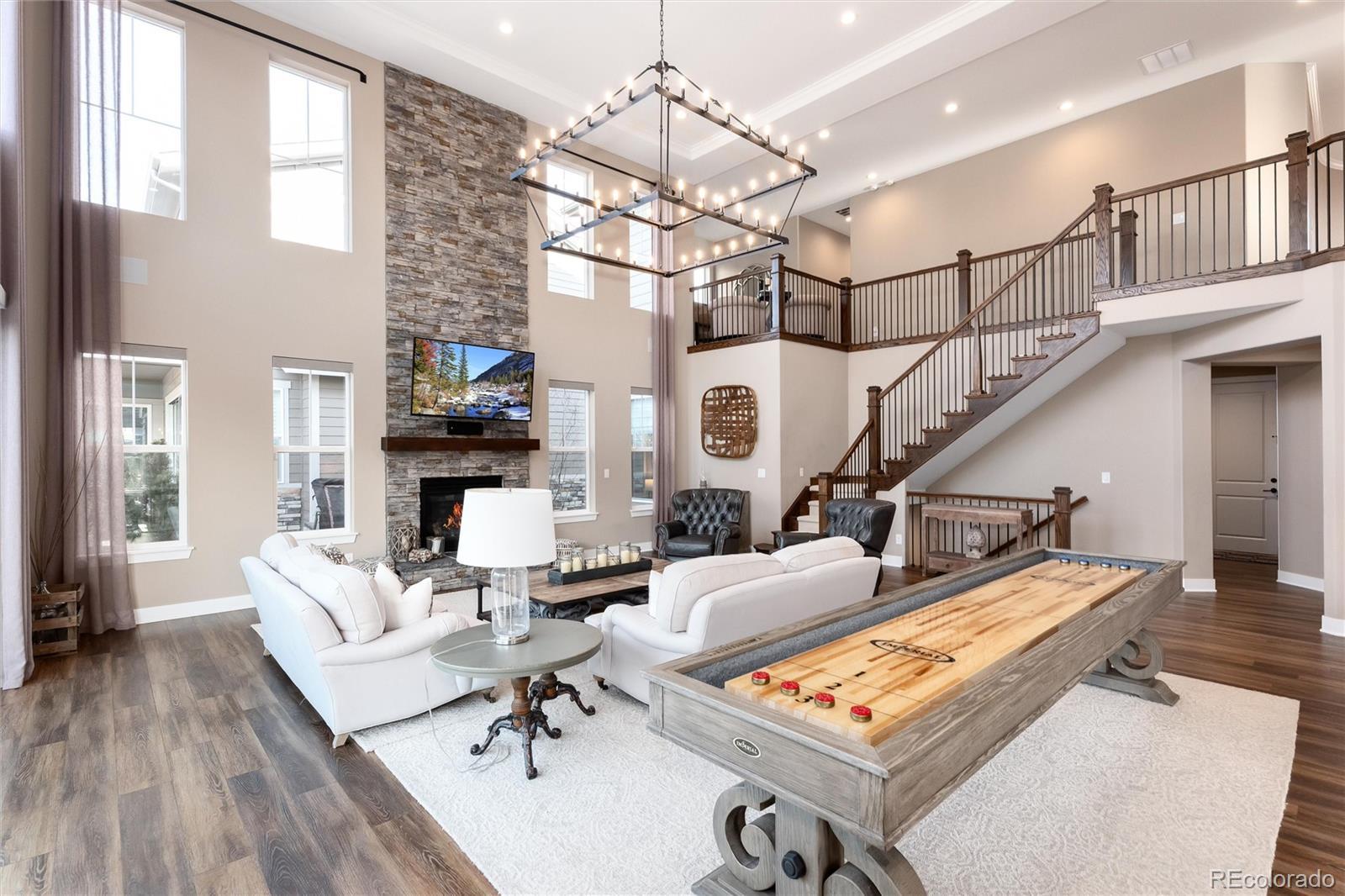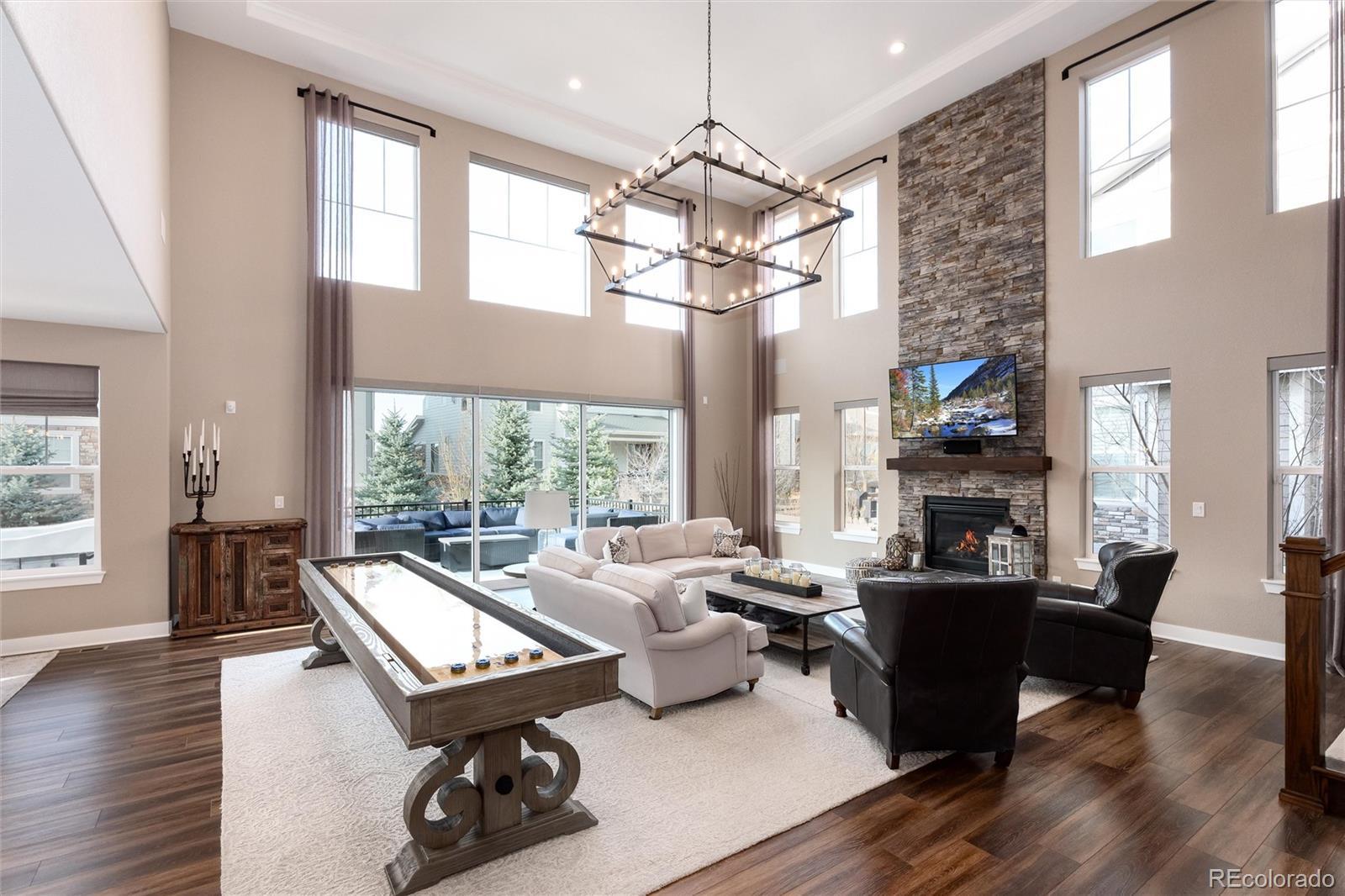 For Buyers looking for a luxury home in SE Aurora, be prepared to check off every item on your wish list at 27643 E Euclid Drive in Southshore. This stunning, Toll Brothers home impresses from every angle. With a large two story foyer guests will arrive and walk past a quiet home office w/dual glass doors and main floor powder room. The expansive two story great room showcases a floor-to-ceiling stone fireplace, stunning upgraded chandelier and 12 foot sliding door, which leads out to one of three outdoor entertaining spaces off the back of the home. Back inside, the kitchen continues to impress with an extended center island w/quartz countertops and upgraded appliances including the built-in, oversized refrigerator, gas range with hood and three ovens. Off the kitchen, the dedicated dining room leads to a covered outdoor patio with outdoor kitchen, fire pit and hot tub. A main floor bedroom w/ensuite bath and laundry room with second refrigerator complete the main floor. Off the second staircase are the upstairs living quarters showcasing the Primary Bedroom w/seating area and dual-sided gas fireplace. The Primary Suite offers privacy and mountain views with a true owners spa retreat w/frameless glass dual-headed shower, deep soaking tub and large closet with custom built-in shelving. Two additional bedrooms share a secondary bath with dual sinks and tub/shower combo. Downstairs, be ready to entertain on game day with a large family room featuring a wet bar and three mounted TV's perfect for showcasing the big game. An additional bedroom, bath and home gym area complete the finished basement. The home is located one block from direct access to the Aurora Reservoir for paddle boarding, swimming, fishing and biking. Enjoy peace of mind living within walking distance to elementary, middle and high schools in the Cherry Creek School District! Southshore is the only community in SE Aurora with two clubhouses, multiple pools and gyms, parks trails and private dog park.