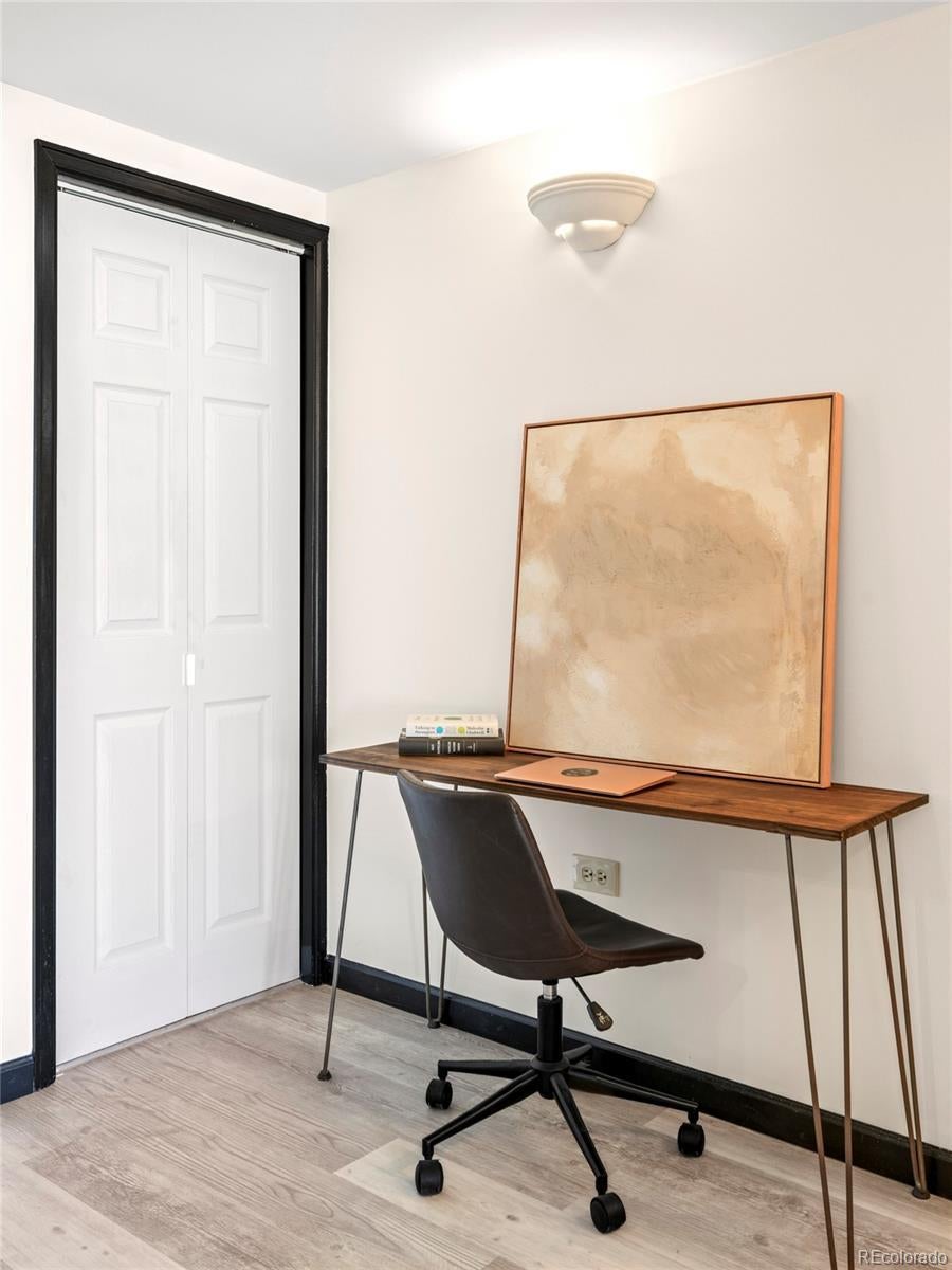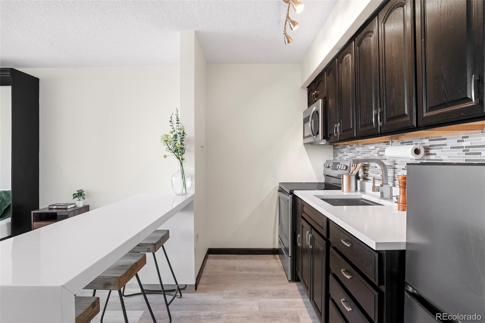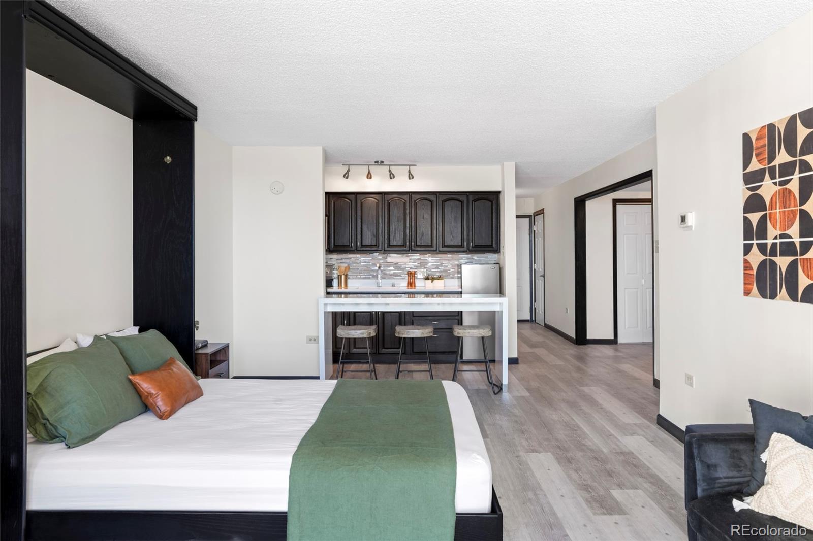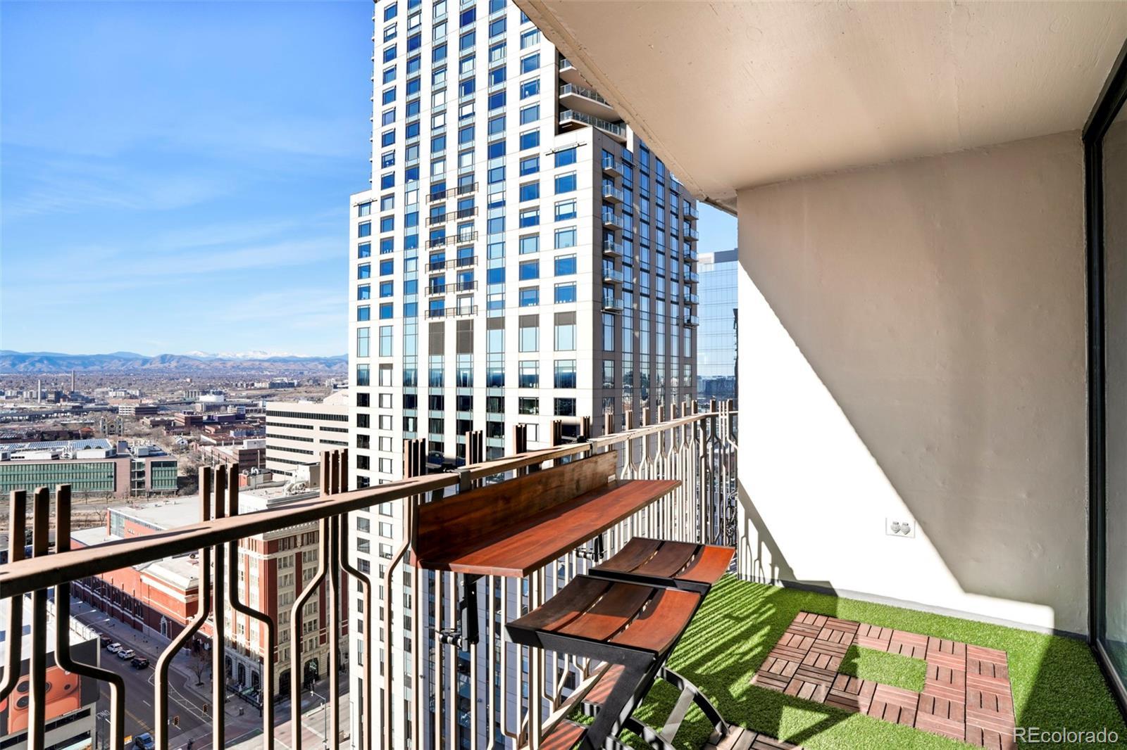 MILLION DOLLAR VIEWS! Set within the iconic Brooks Tower, this renovated downtown studio is defined by incredible western panoramic views of the Rocky Mountains. Framed by expansive windows and large sliding glass doors, the open layout captures dramatic sunsets and ever-changing alpine vistas that become a living backdrop to daily life. Luxury vinyl flooring and fresh paint throughout create a clean, modern foundation for this elevated urban retreat. The living area is thoughtfully designed with a built-in Murphy bed, maximizing flexibility while preserving uninterrupted sightlines to the mountains. The kitchen balances style and function with quartz countertops, decorative tile backsplash, and stainless-steel appliances. Sliding doors open to a covered balcony, extending the living space outdoors and offering unobstructed views spanning the Rocky Mountains and the Denver Performing Arts Complex. Offered furnished and truly move-in ready, this residence delivers effortless downtown living. Building amenities include a rooftop pool and patio, fitness center, laundry room, residents’ lounge, 24-hour front desk, and secured entry. Ideally located just two blocks from Larimer Square and one block from the Ellie Caulkins Opera House, with close proximity to the 16th Street Mall, LoDo, Auraria Campus, Ball Arena, Coors Field, and Denver’s vibrant dining, arts, and nightlife—plus convenient access to RTD and light rail.